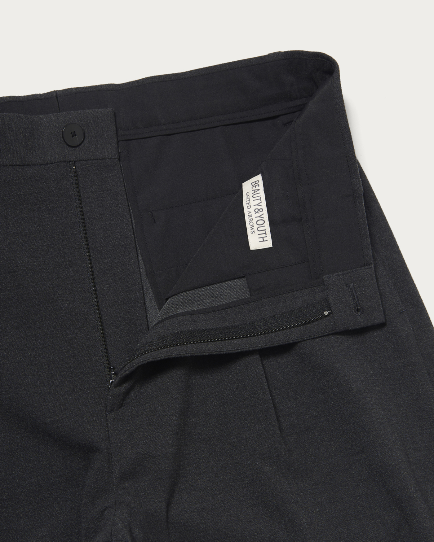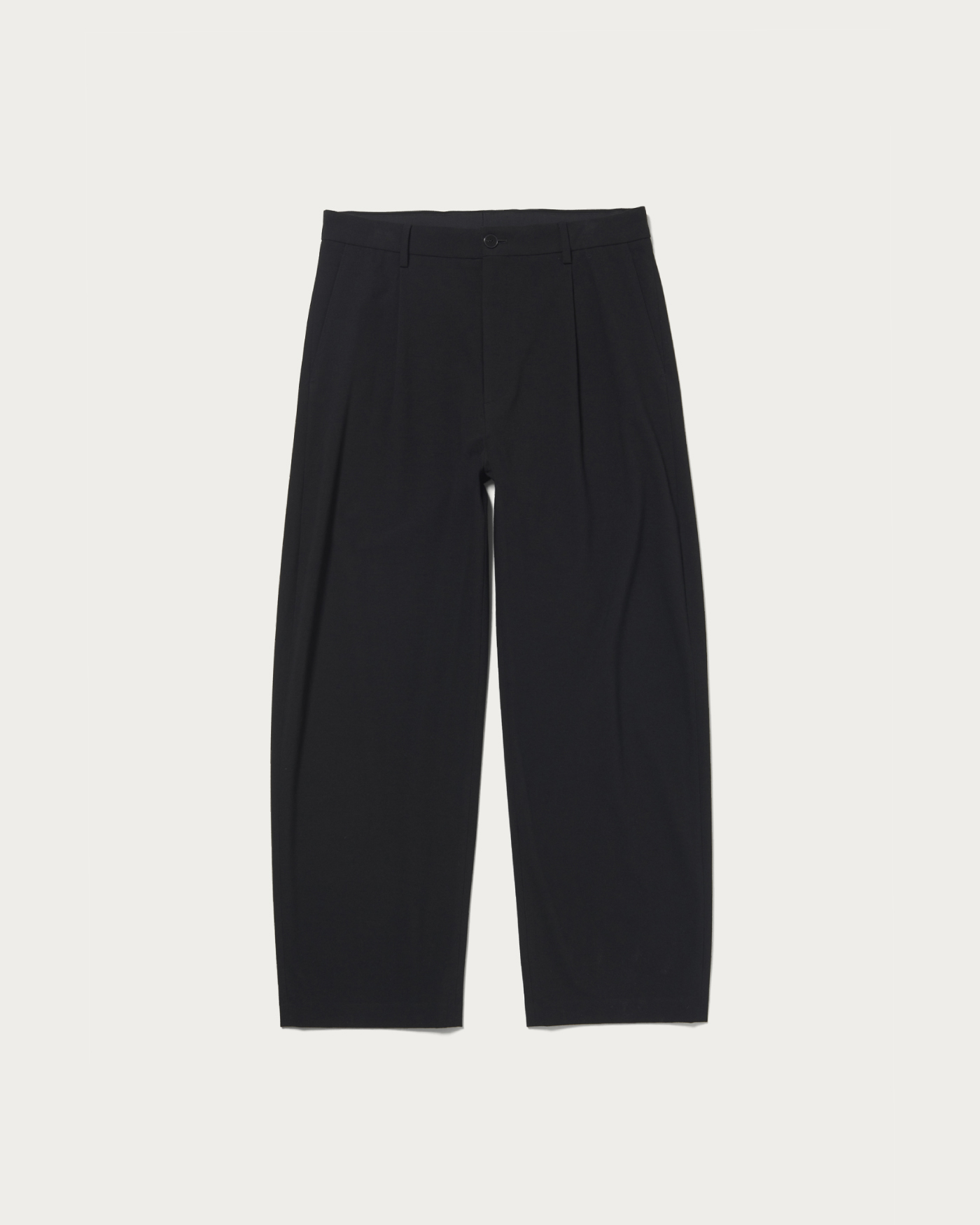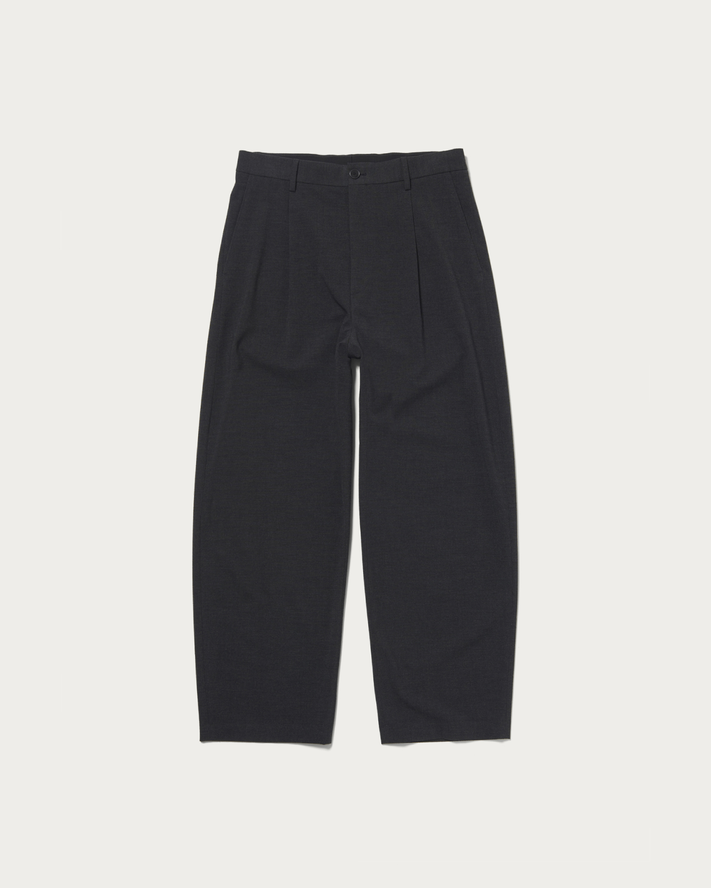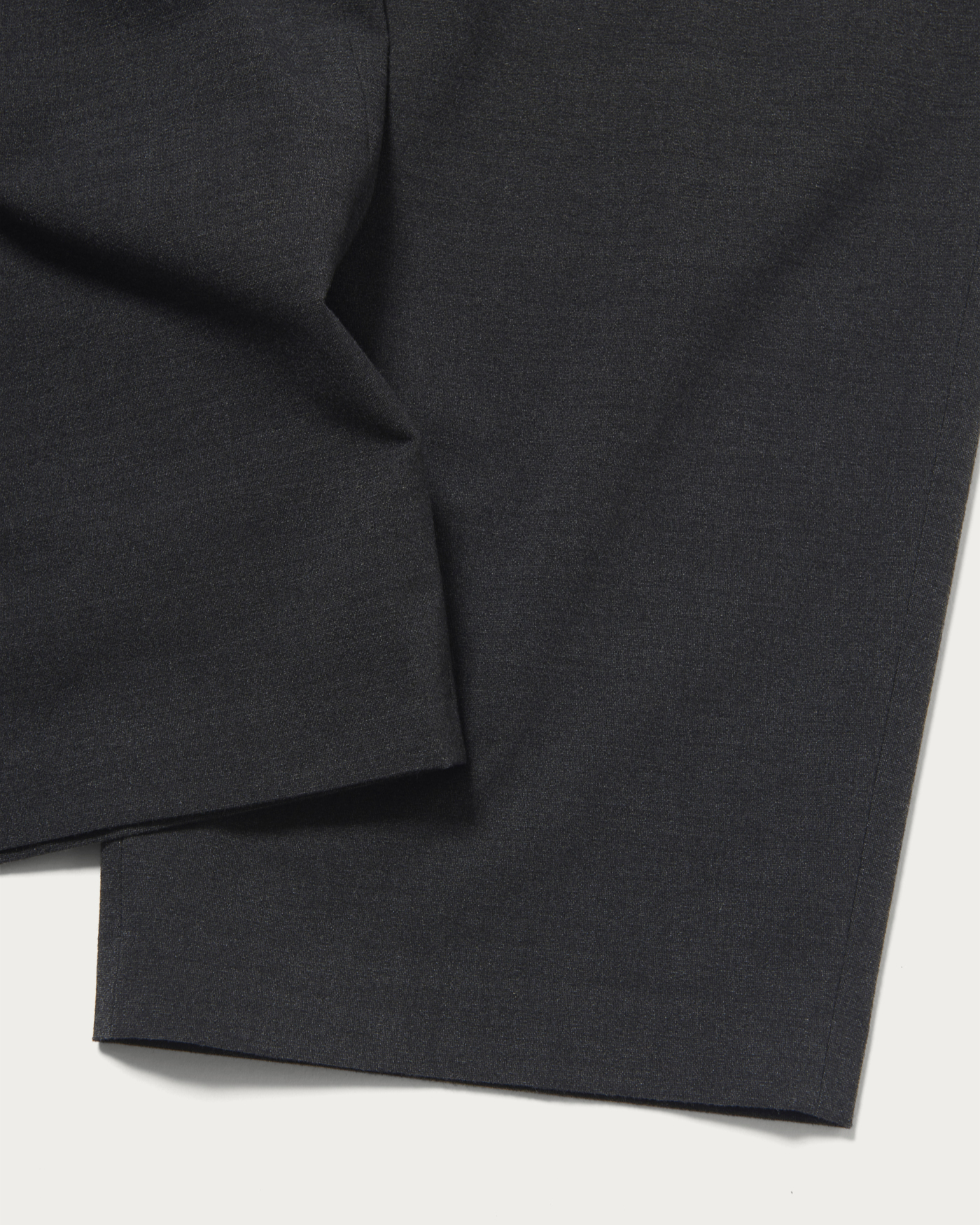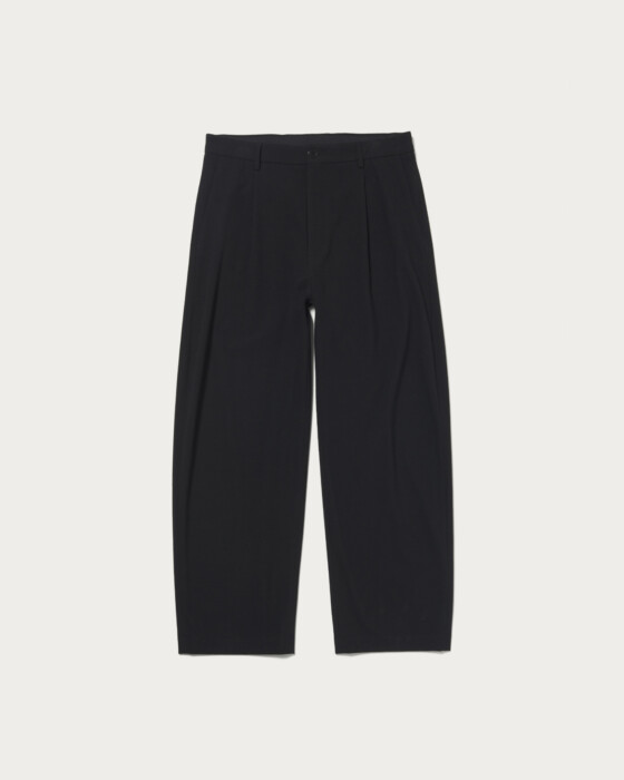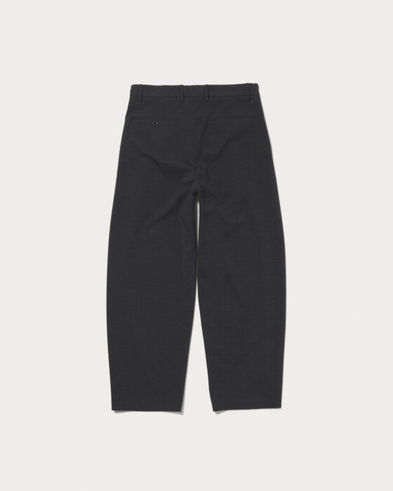 今シーズンから新たに登場する、裾にかけテーパードさせた樽型シルエット。ウールのような表情が特徴の生地でも特徴です。裏面も微起毛により滑らかな肌あたりで、非常に心地よく着用できる素材です。