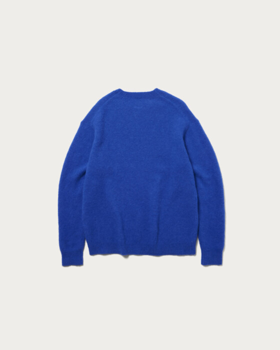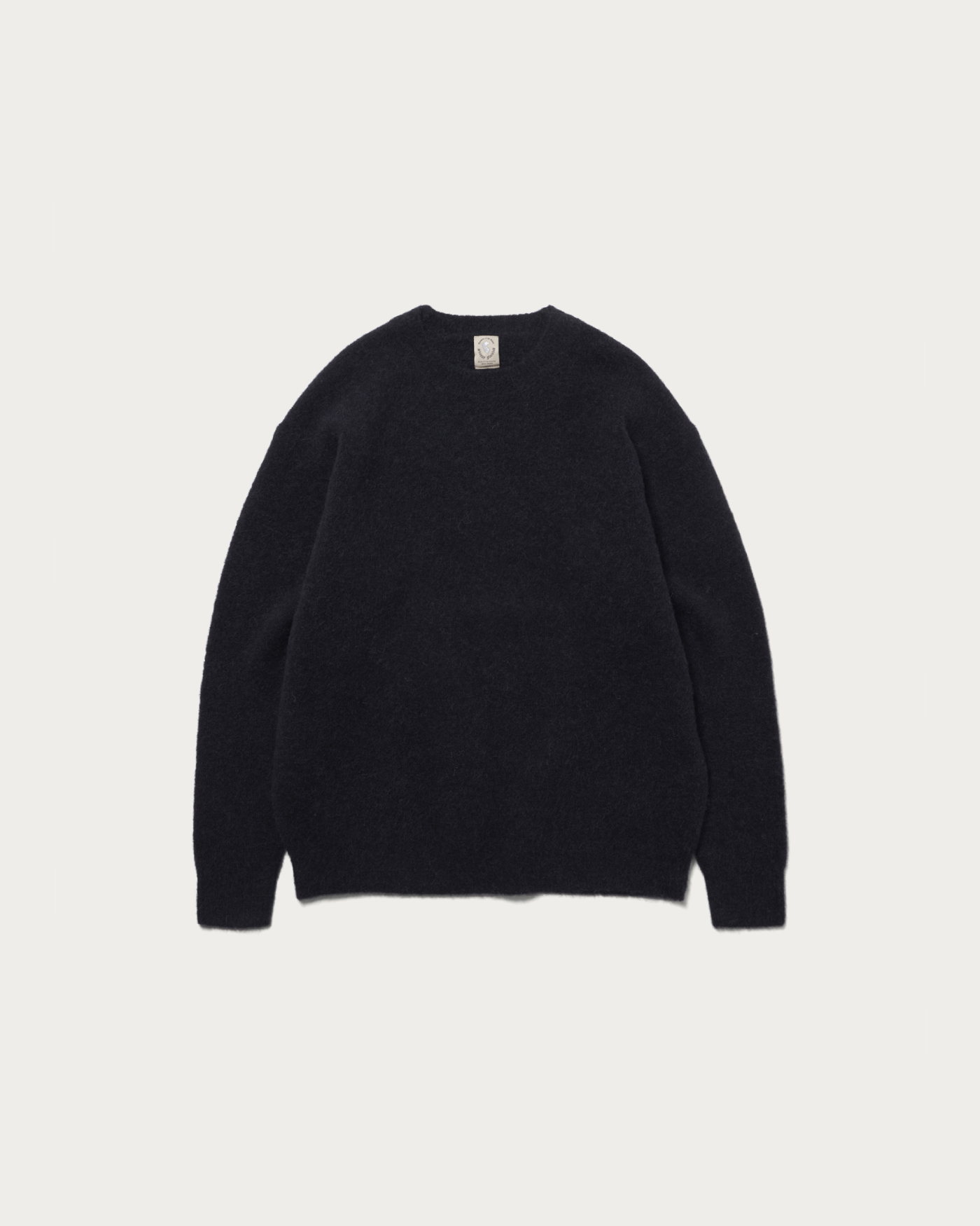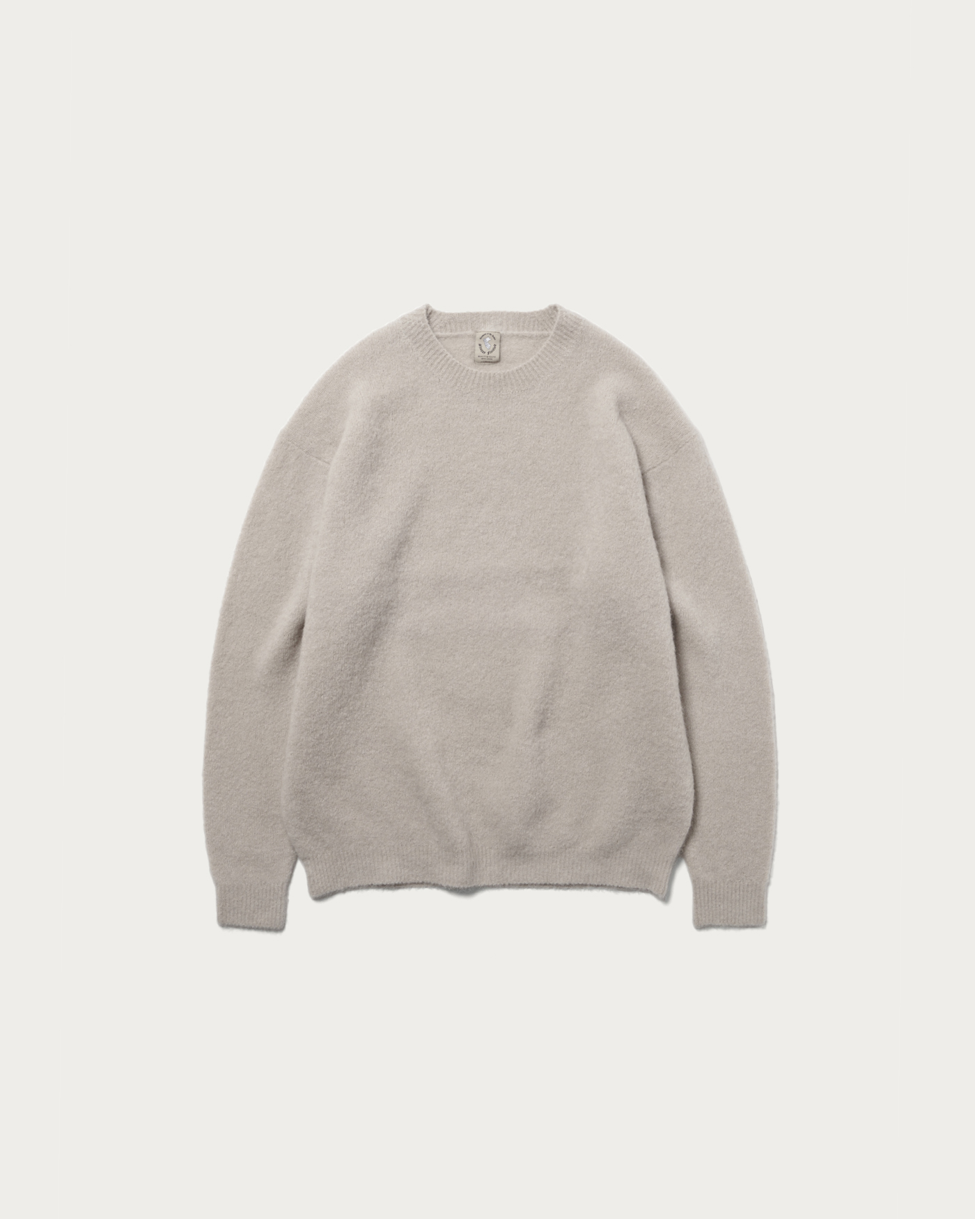 "アルパカの中でも毛足が長いとされるスーリー種のアルパカ素材を採用し、ブレンドした上質な素材を採用。シャギードックセーターは通常編地の状態で起毛加工しますが、糸の状態で起毛加工をすることにより製品へのダメージを防ぎ、均一で柔らかい質感を演出しています。クラシックなシャギーセーターのようにシェットランドウールを原料としているわけではなく、アルパカをメイン原料としているので非常に肌触りが滑らかなのが特徴です。"アルパカの本場、ペルーのMICHELL社の上質素材を採用したシャギーニット。今の気分にフィットする程よくゆるいジャストルーズなシルエットが特徴です。起毛されたシャギーニットの表情をいかすべくシンプルなデザインに仕上げています。"