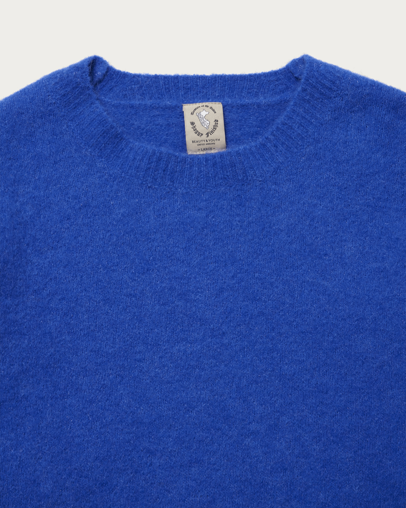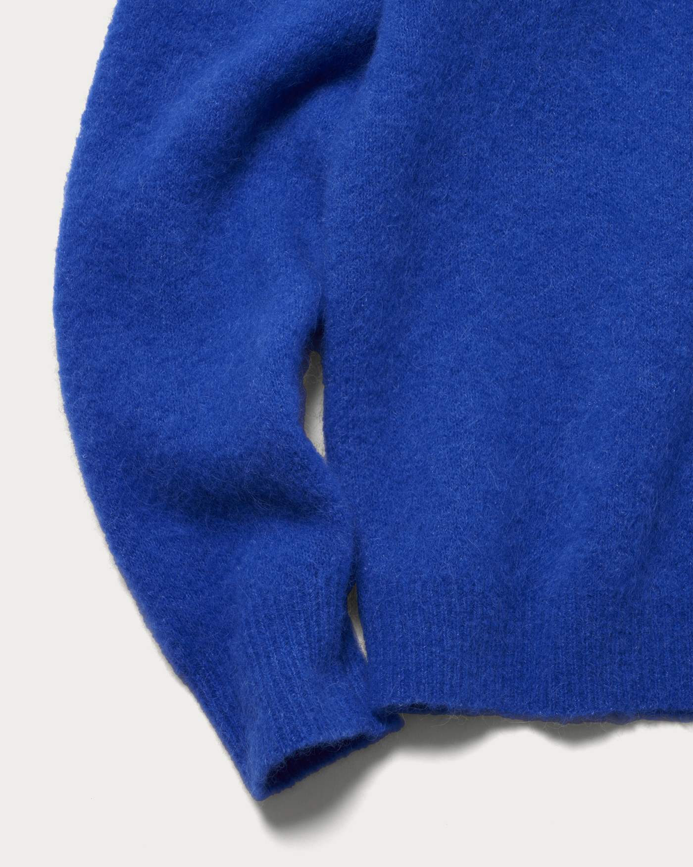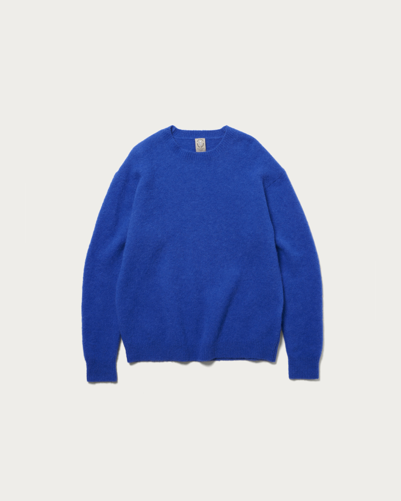 "アルパカの中でも毛足が長いとされるスーリー種のアルパカ素材を採用し、ブレンドした上質な素材を採用。シャギードックセーターは通常編地の状態で起毛加工しますが、糸の状態で起毛加工をすることにより製品へのダメージを防ぎ、均一で柔らかい質感を演出しています。クラシックなシャギーセーターのようにシェットランドウールを原料としているわけではなく、アルパカをメイン原料としているので非常に肌触りが滑らかなのが特徴です。"アルパカの本場、ペルーのMICHELL社の上質素材を採用したシャギーニット。今の気分にフィットする程よくゆるいジャストルーズなシルエットが特徴です。起毛されたシャギーニットの表情をいかすべくシンプルなデザインに仕上げています。"