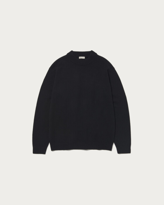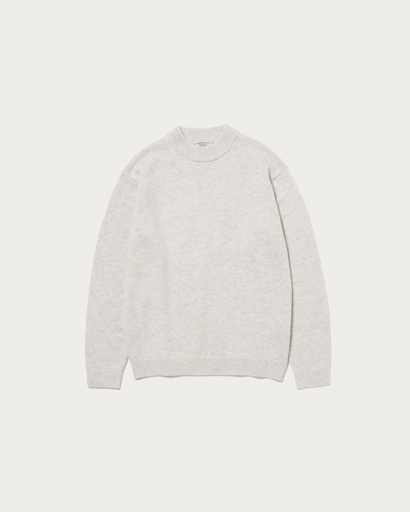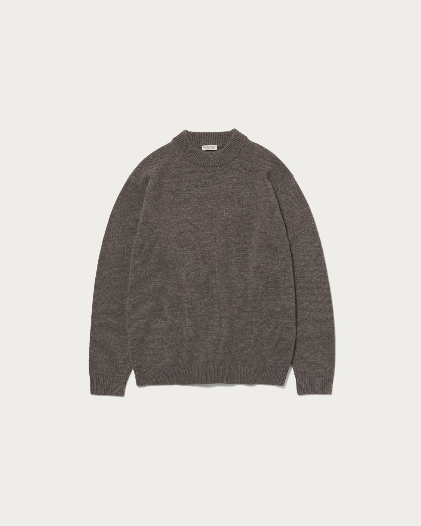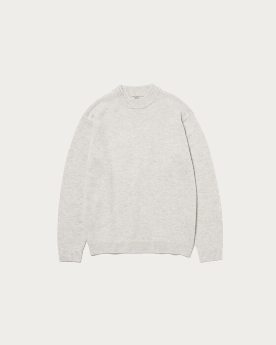 クルーネック以上、一般的なモックネック未満の絶妙な高さにこだわったモックネックがポイント。1枚で着ても程よい存在感があり、アウターを羽織っても埋もれず、品のある印象をキープできるバランスの良さが魅力です。ウール・ナイロン・カシミヤをブレンドした、非常になめらかで肌触りの良い糸を使用。糸量をしっかり確保することで、程よい重みと着応えのある一枚に仕上げています。