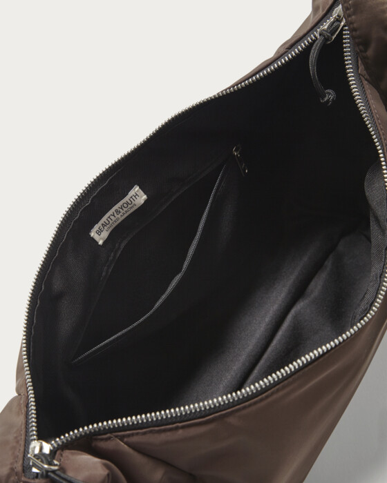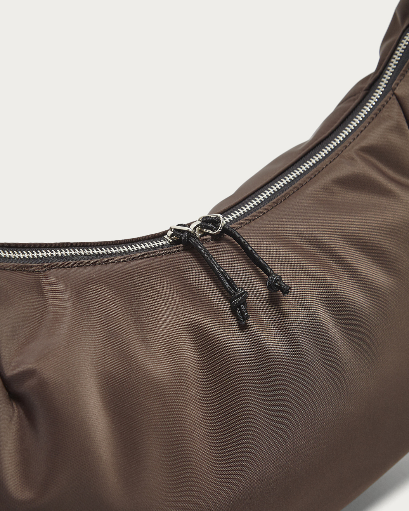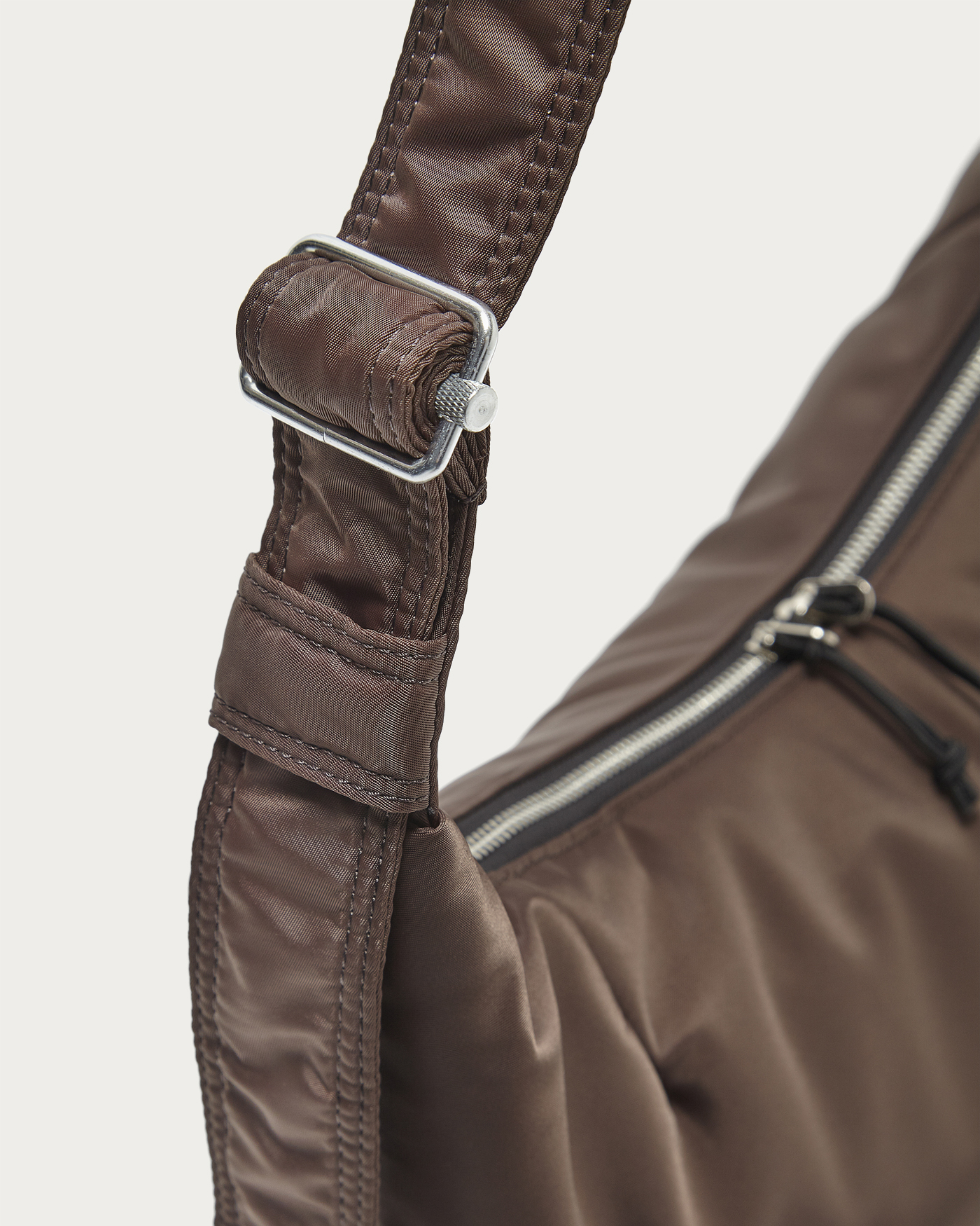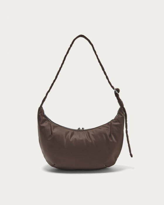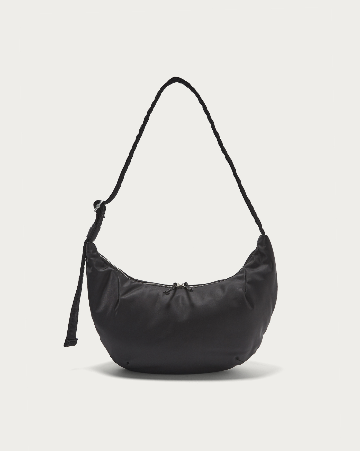 ハリとしなやかさを兼ねそろえた上質な高密度ナイロン素材で仕立てたムーンショルダーバッグ。ボリュームのある素材使いで、ふっくら丸みを帯びたシルエットが中性的なヌケ感を演出します。