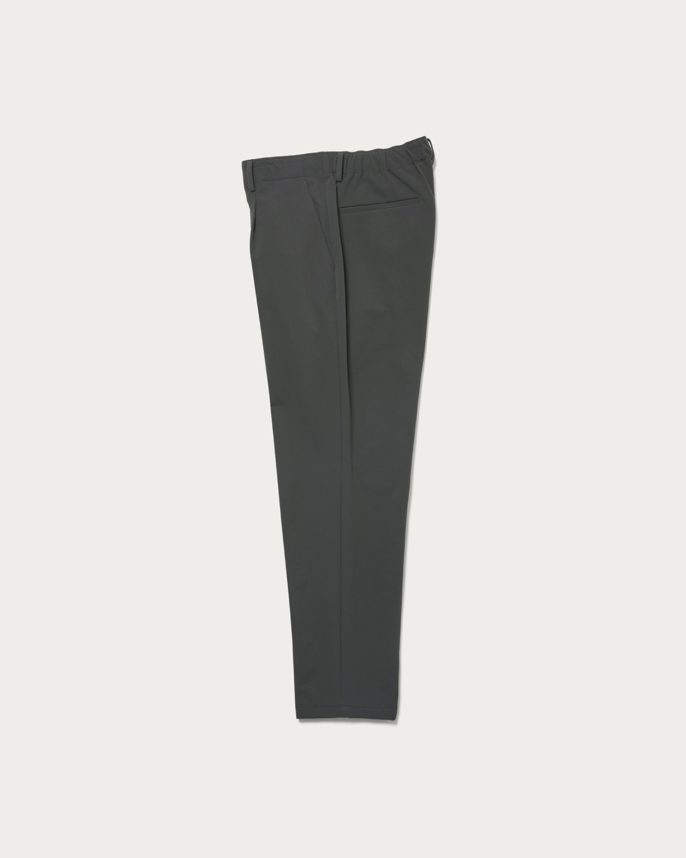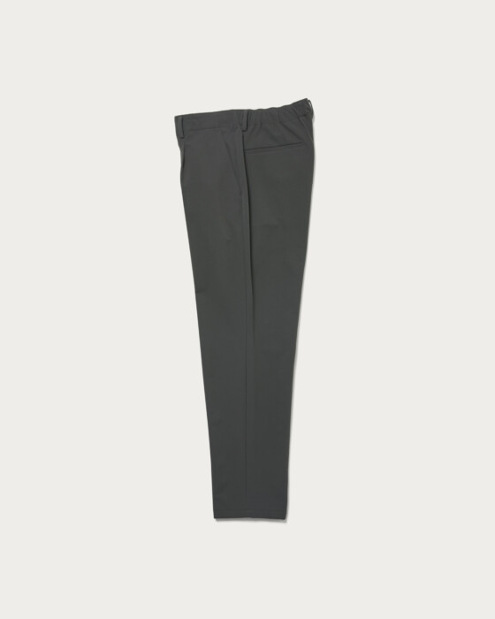 24FW同様のテーパード7シルエットのパンツ。センタークリースが無く、適度にカジュアルな印象です。ウエスト後ろにはゴムシャーリング仕様、フロントのスピンドルにて細やかな調整が可能。また、右腰ポケットの中にはコインポケットを配備しています。ご好評をいただいた、24FW生地をベースに新色#19を作製。ナイロンxPu生地で伸縮性に富み、通年生地に見えますが、裏側は起毛させて秋冬のシーズン性を出しています。