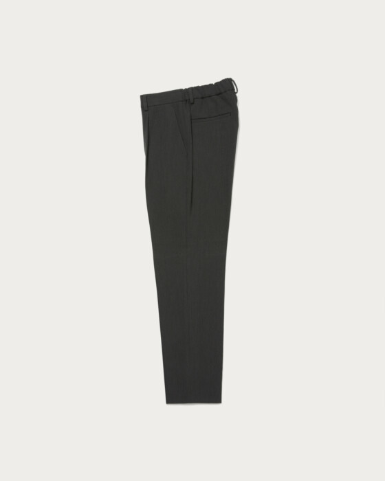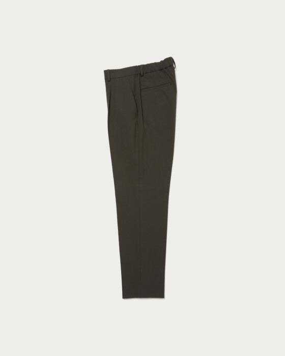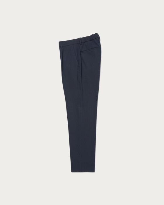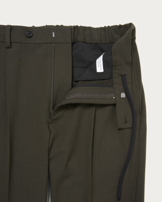 しっかりとした厚手で着応えのあるポリエステル、レーヨン、アクリル、ポリウレタンの4素材混の生地。ひと味違う独特の品があり、艶やかさとストレッチ性を備えた素材。裏起毛されてるので、温かみがあり肌当たりも柔らかです。ジャケットナチュラルショルダーで、通常よりややシェイプさせたウエストラインがポイント。パンツは1プリーツを入れヒップ周りに適度なゆとりを持たせつつ、裾に向かって細くなるスリムテーパードシルエット。すっきりとしたキレイなレッグラインがポイントでどんなアイテムとも相性よく使い勝手も◎。