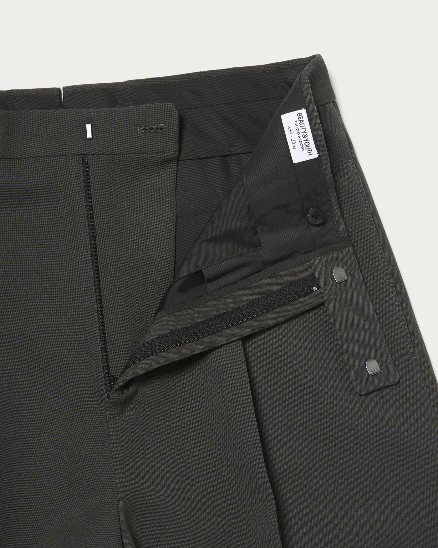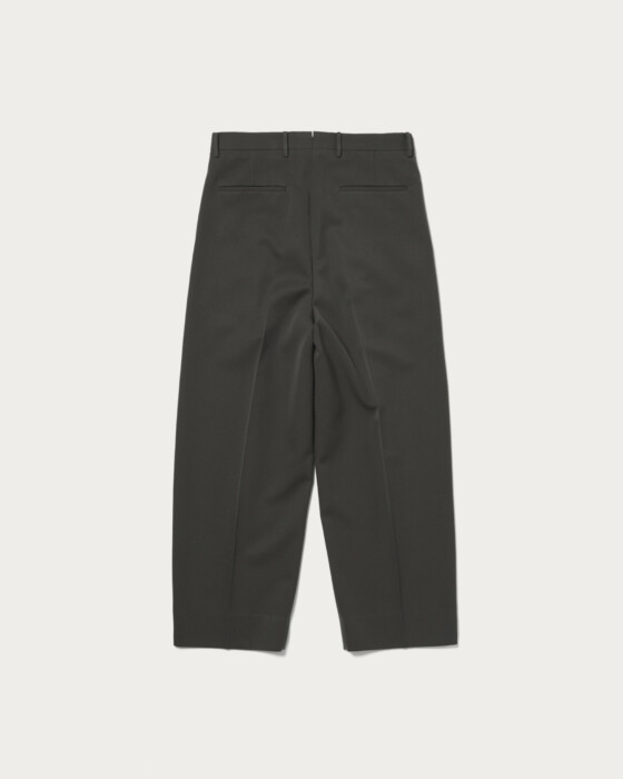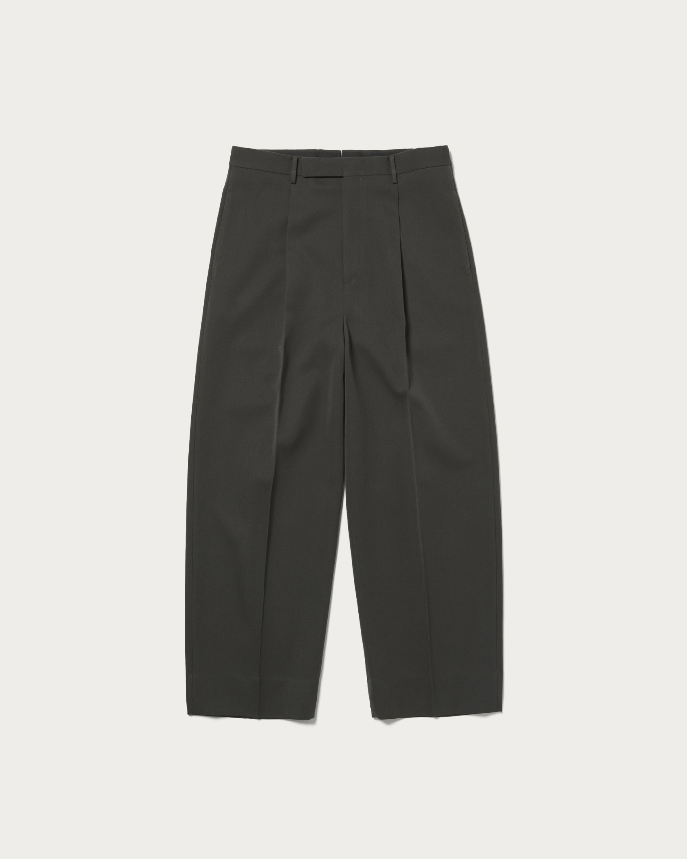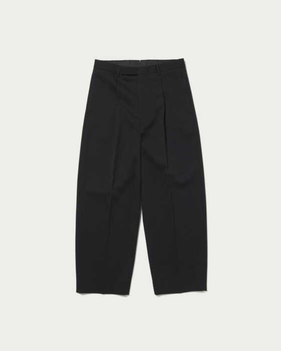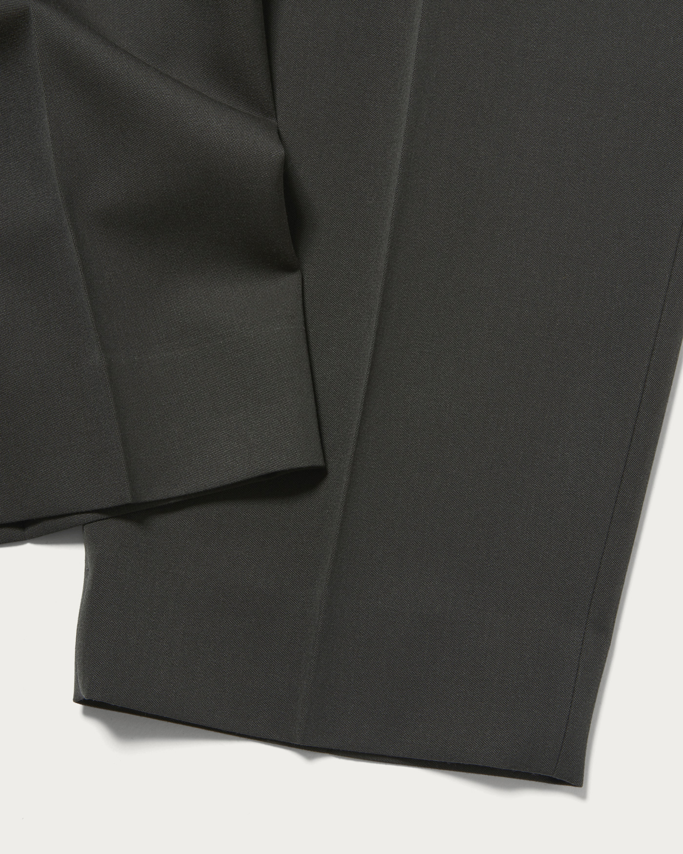 しっかりとした密度のウーステッドを使用したトラウザーズ。毛織物産地の愛知県"尾州地区"にて厚みを持たせたバラシャ組織生地を別注でオーダー。裾まで太いワイドシルエットにインカーブラインを入れて少しだけ丸みを持たせ、ハイウエスト仕様でコーディネートの主役になるアイテムです。