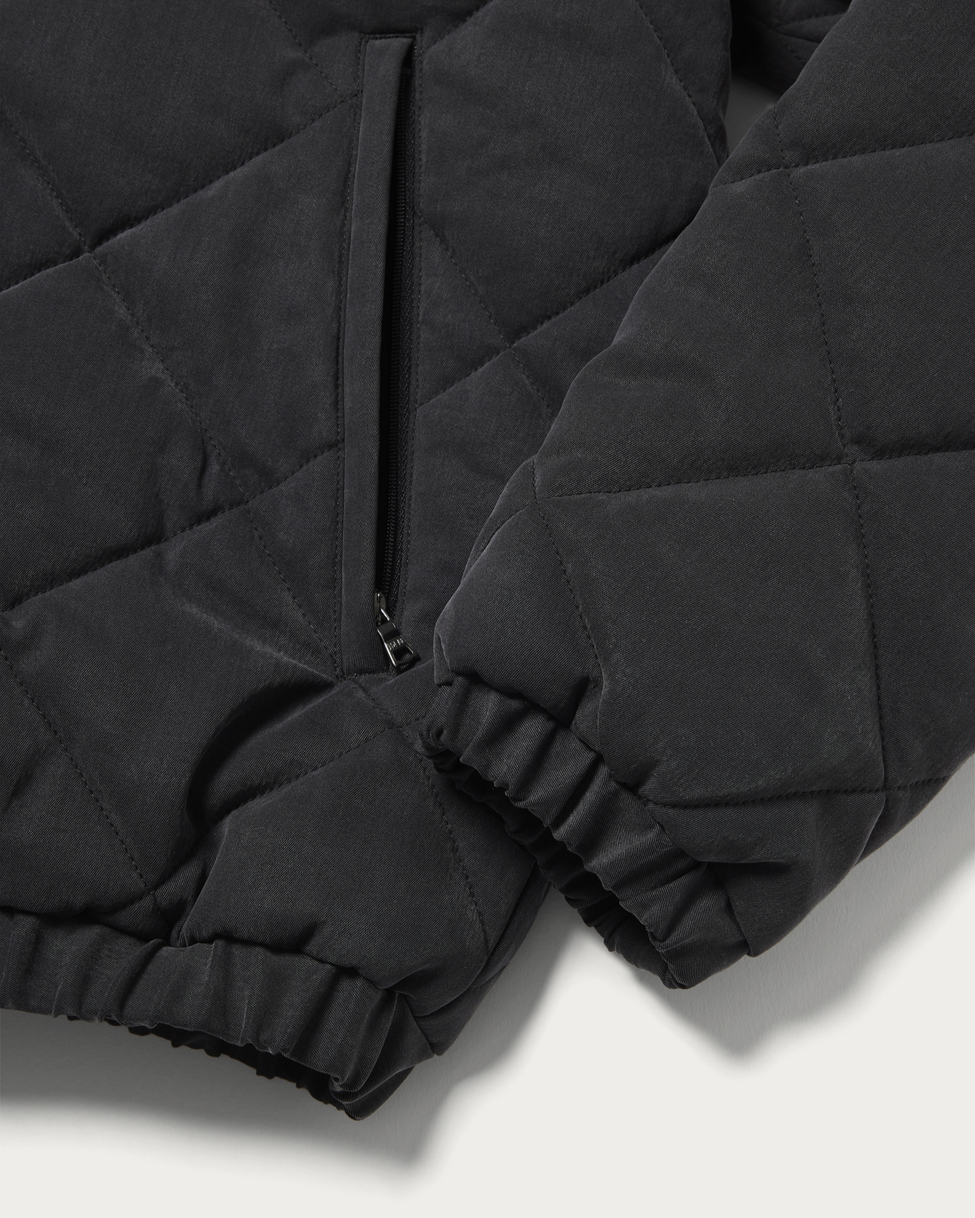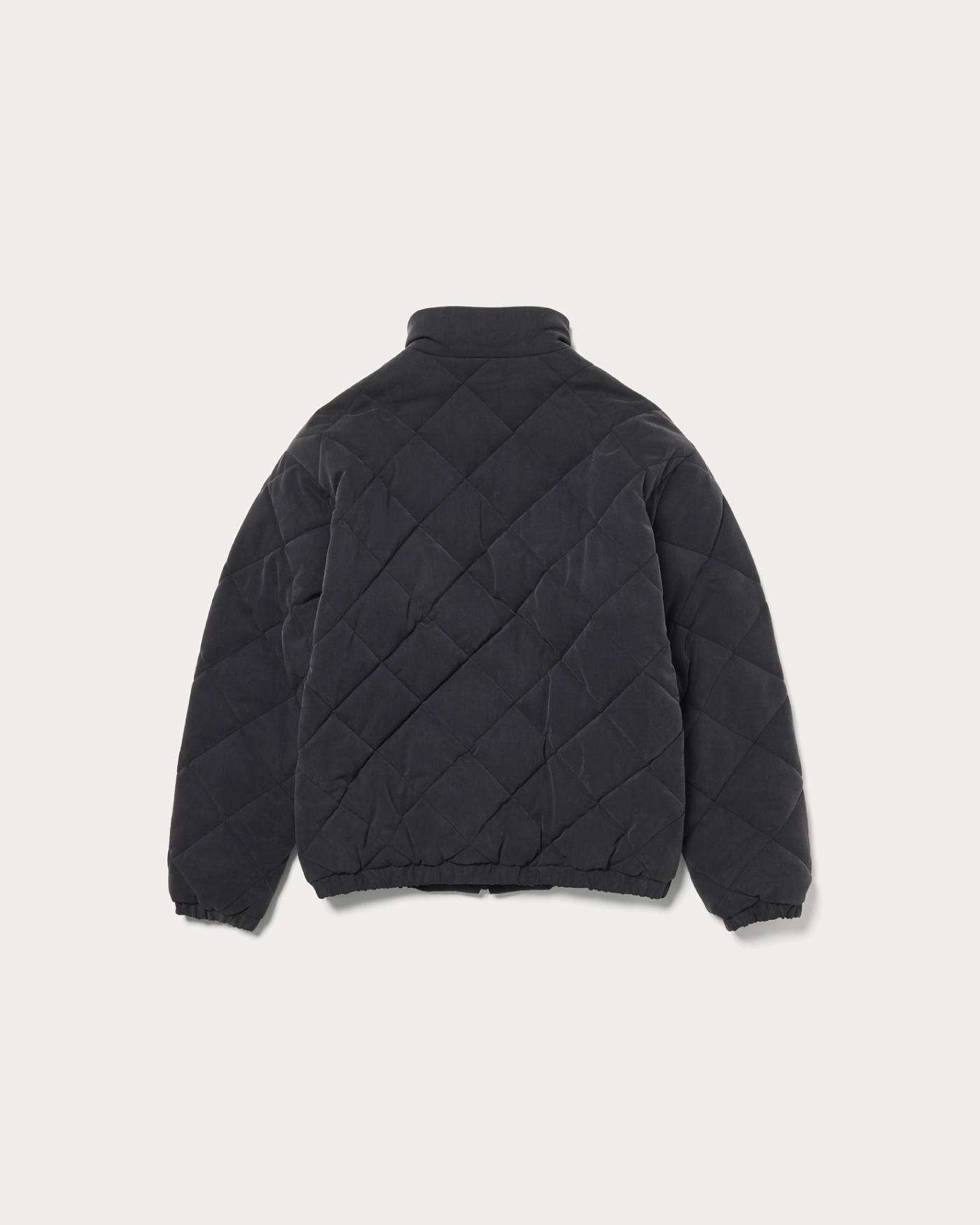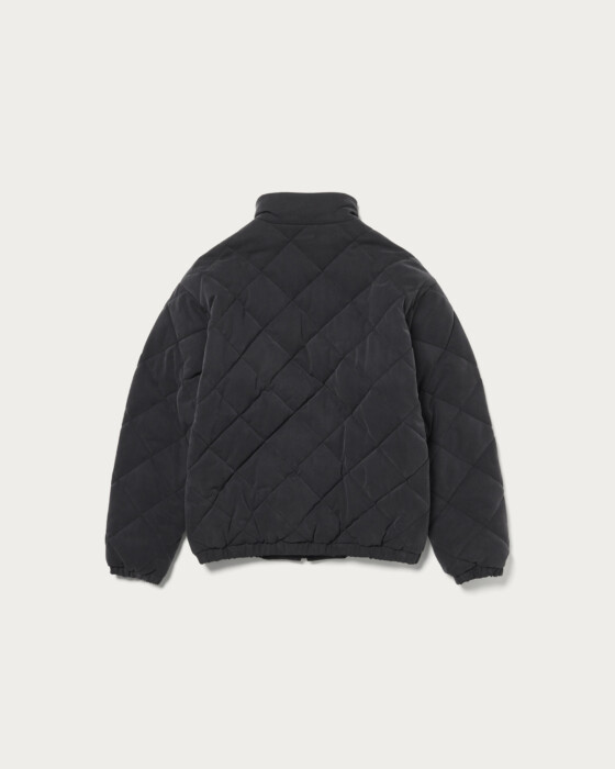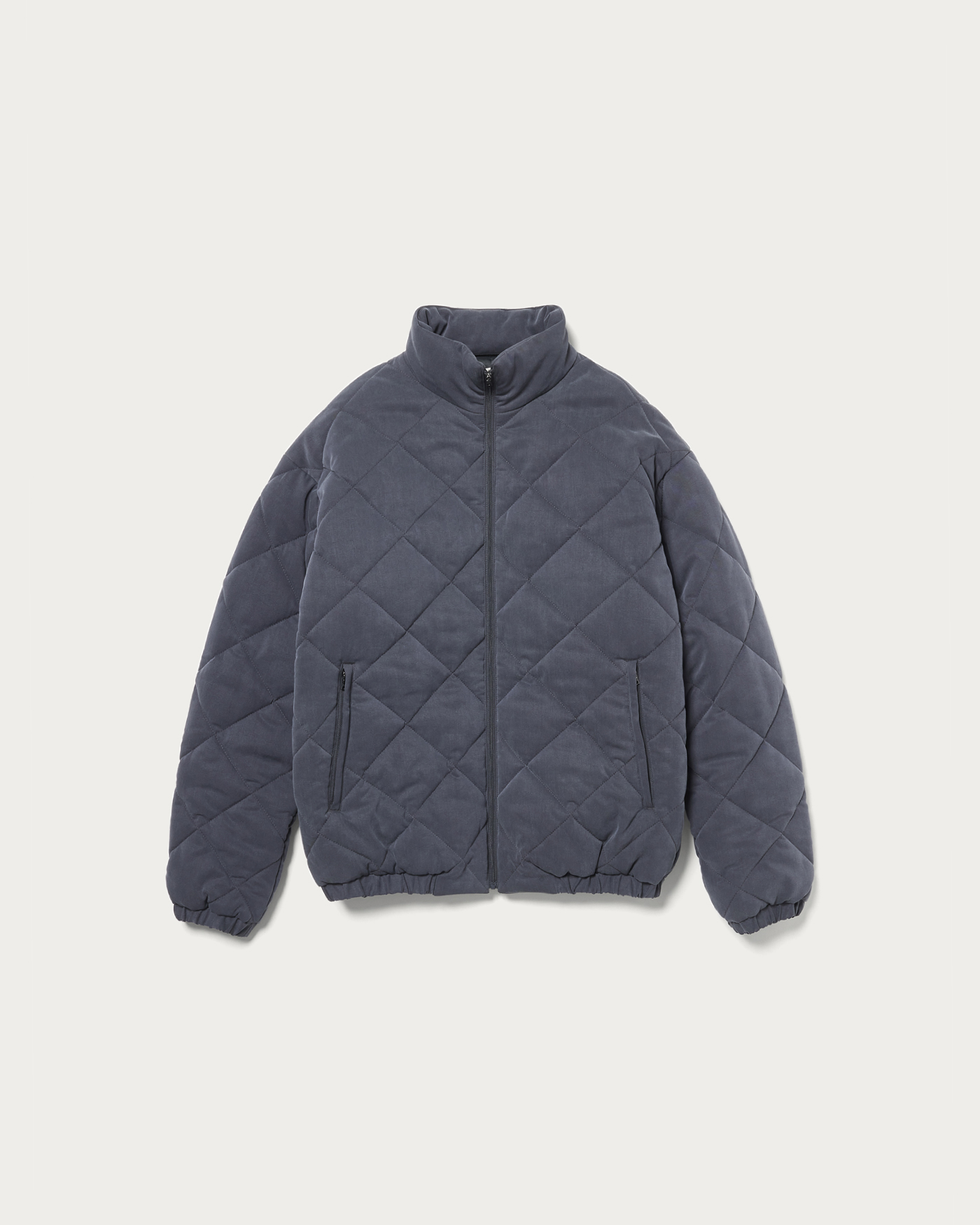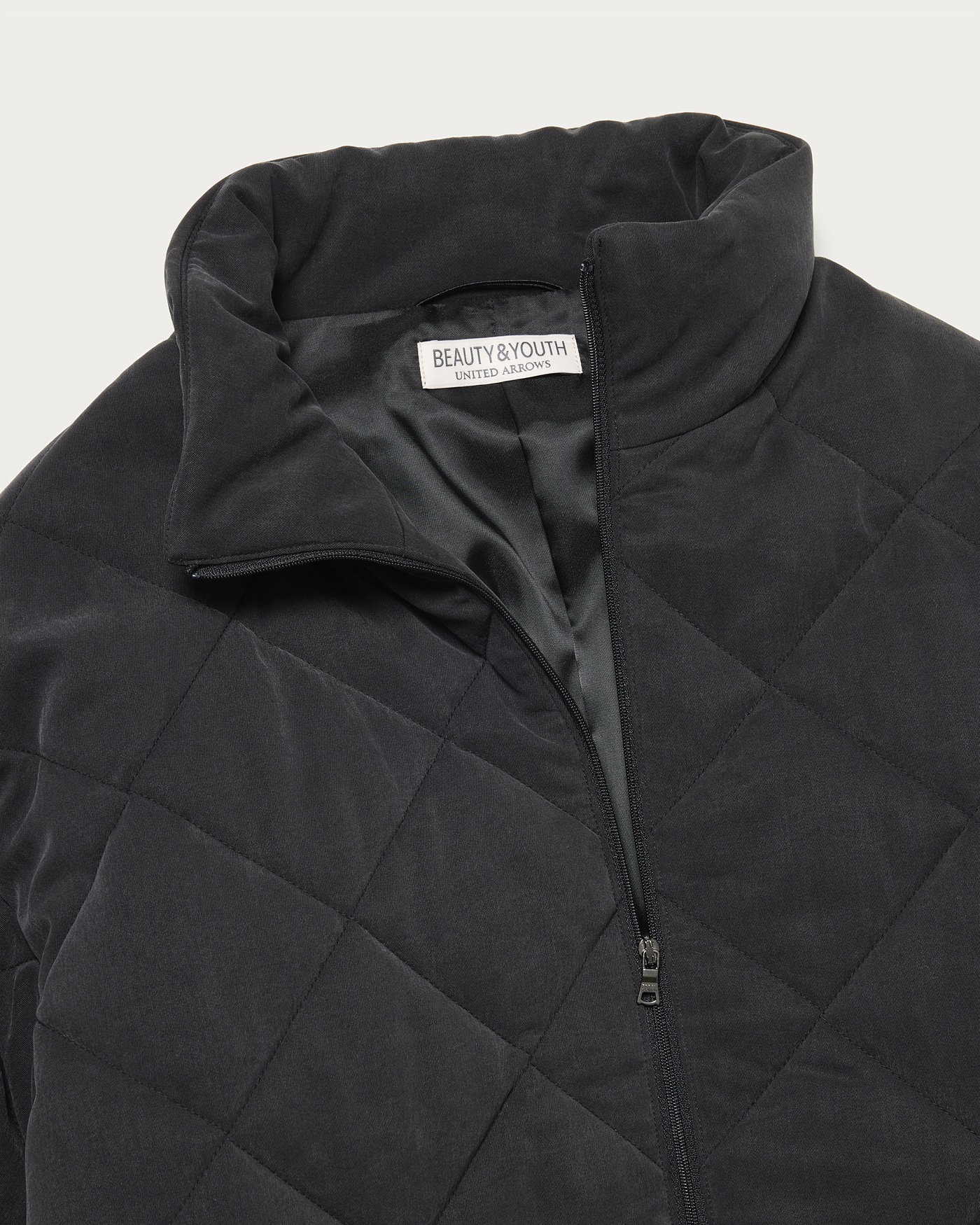 生地の風合いを活かすスタンダードな立衿型ブルゾン。大ぶりのダイヤキルティングが特徴です。袖口と裾にはゴムシャーリングを入れて、少し丸みのあるシルエットにし、各所ファスナーには光沢感が美しい、IDEAL社のものを採用しました。