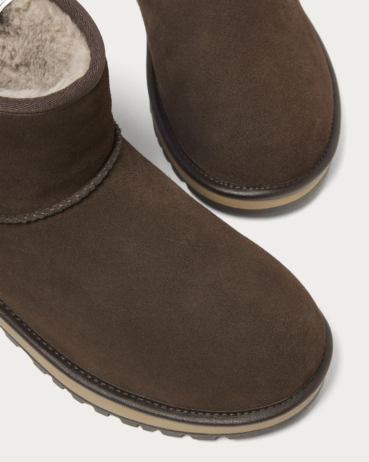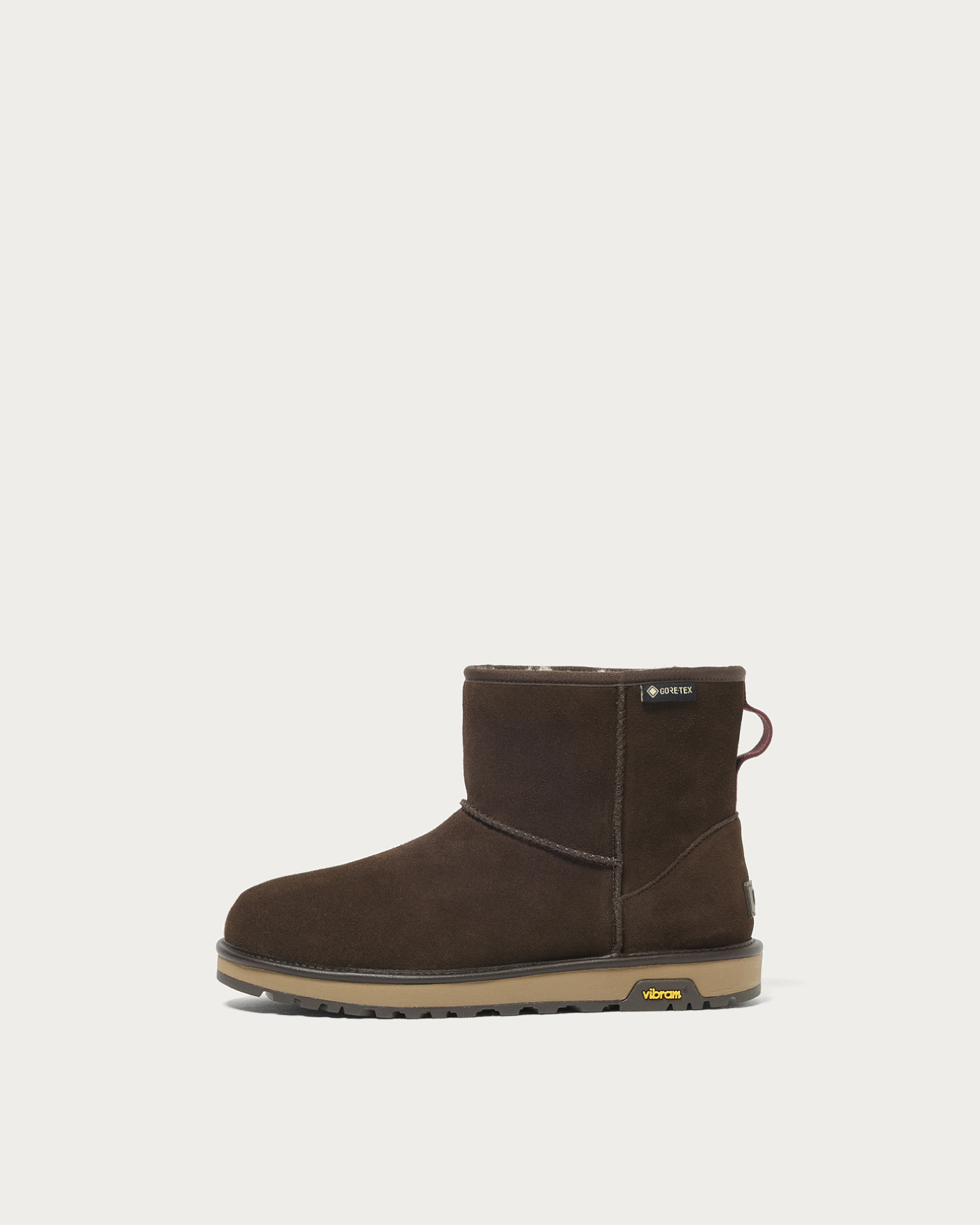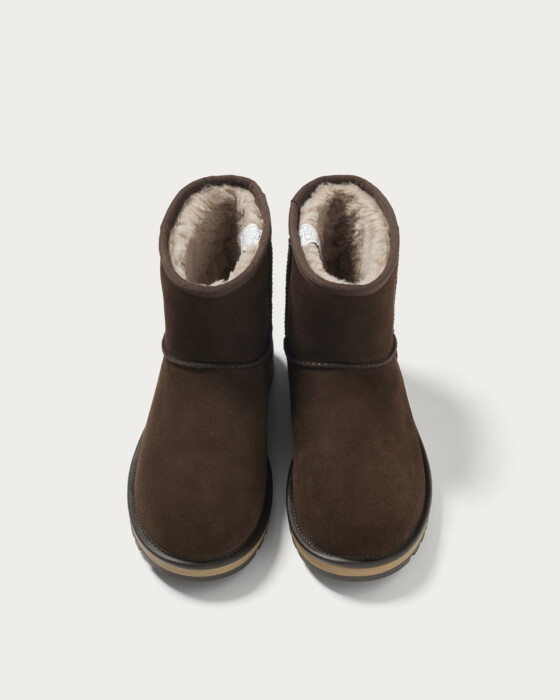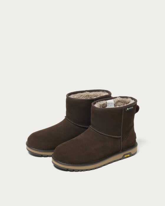 上品なダークブラウンを纏った、〈ビューティ&ユース〉直営店限定カラーの〈アグ〉の「クラシックミニ」。アッパーには防水性のあるスエードを、内側にはゴアテックスメンブレンを採用し、サトウキビ由来の軽量EVAのミッドソールとグリップ性に優れたビブラム®︎アウトソールが足元をしっかり支えます。