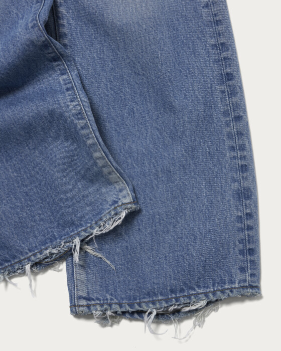 ハイライズながらウエストのシェイプをきつく絞らないことで、少しジャストウエストより下で落ち着くリラックスムードなバランス設計。膝下の広がりも絶妙な微フレアに設定しており、よりナチュラルさを強調したフィット。素材にはクラボウ社製の再生糸を使用した13ozリサイクルデニムを使用。糸ー紡績ー織全て日本で一貫管理した高品質のアップサイクルデニムとなっています。古着のようなリアルなユーズド感を表現し、着こなしのポイントとして重宝する1本です。象徴となるパッチは透明のビニール素材にピンクのプリントしたCGS別注パッチを搭載。