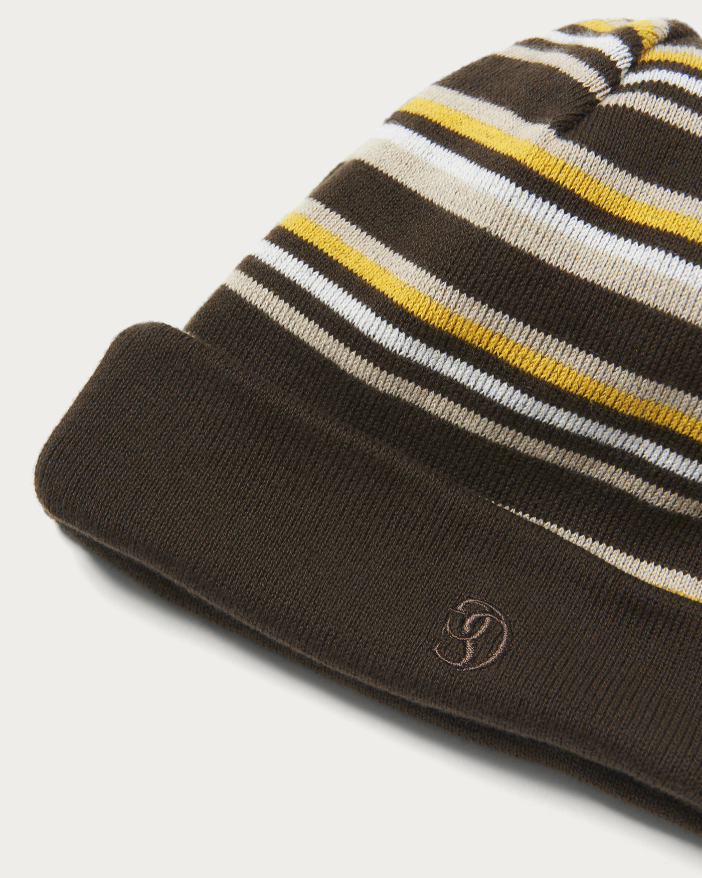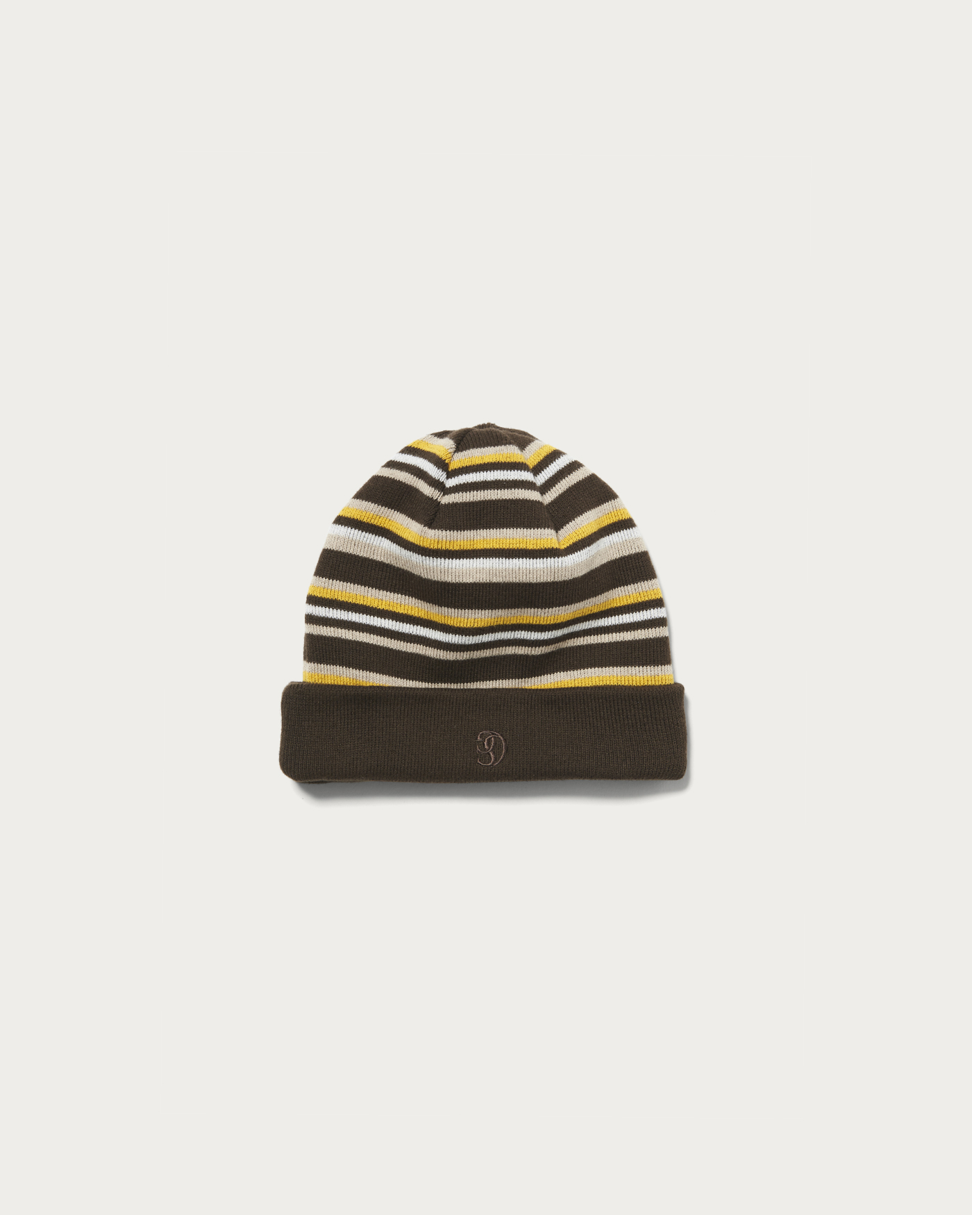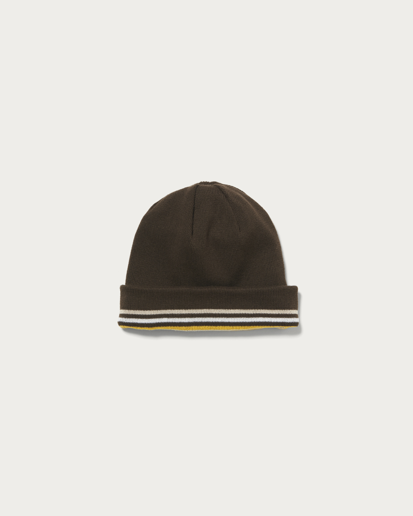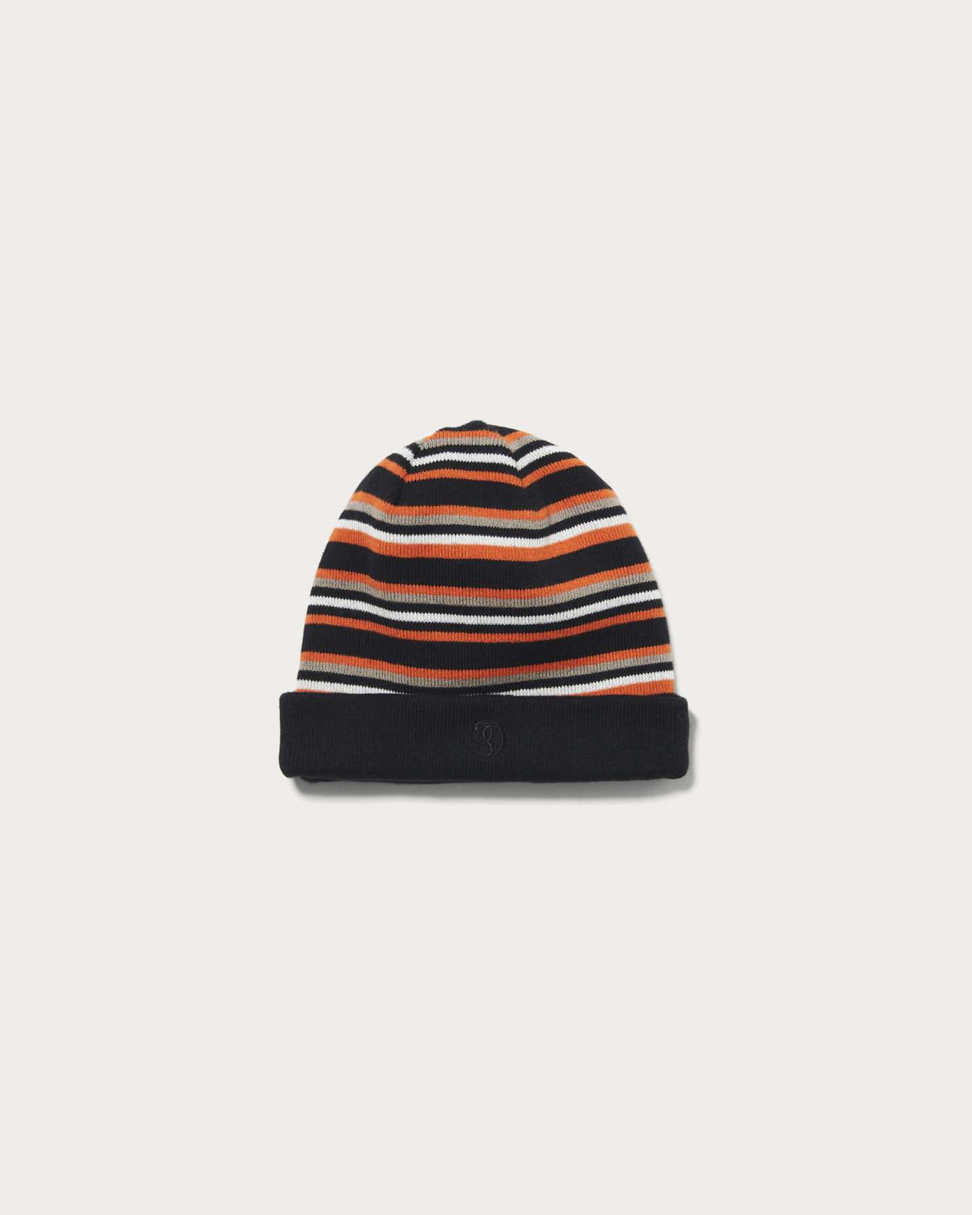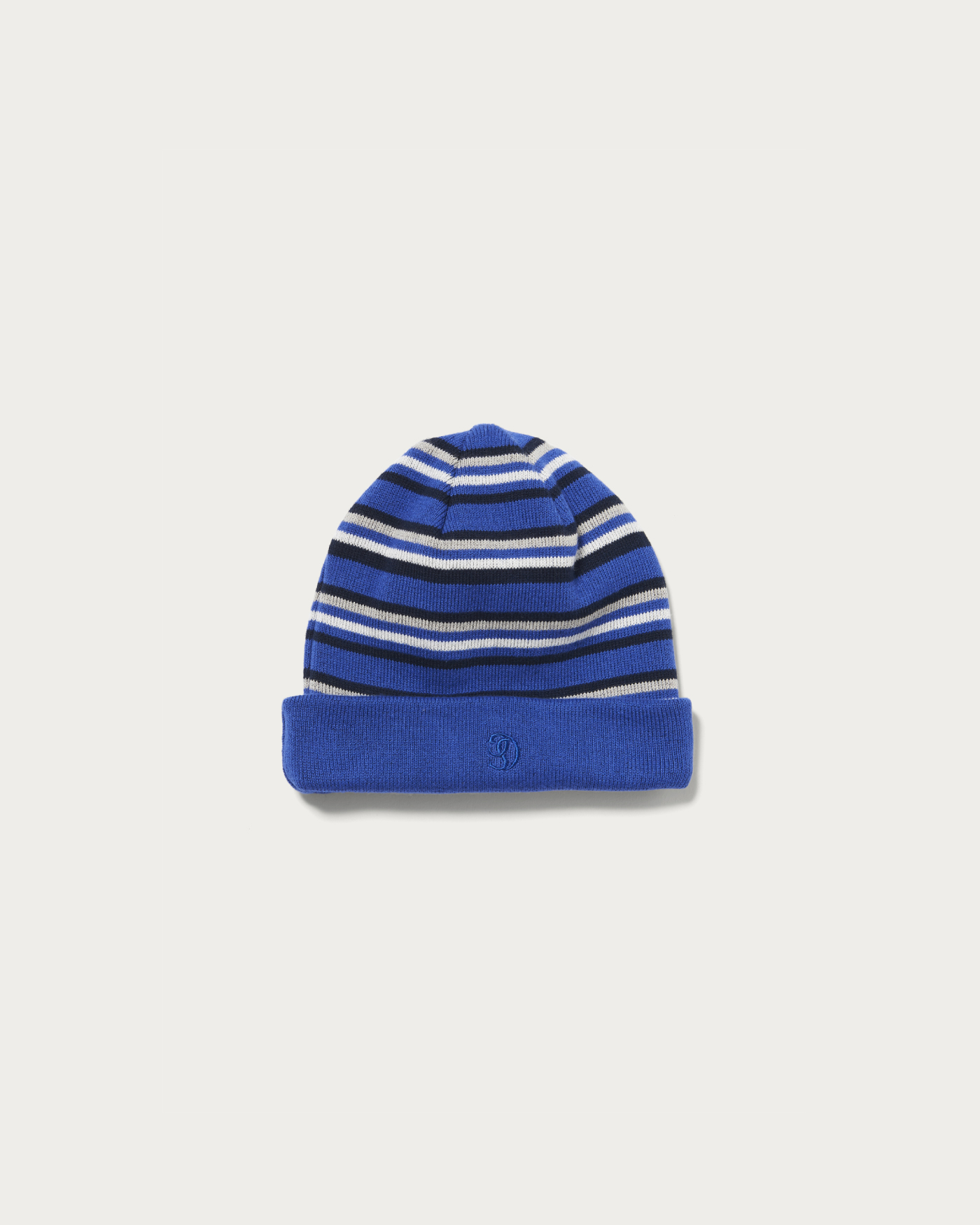 4配色のマルチボーダー柄のビーニーです。裏返して単色で被ることもできるリバーシブル仕様。単色側には同色系のワンポイントロゴ刺繍入り。伸び止めとしてゴム糸を少量入れて編み立てています。冬のシンプルな着こなしにアクセントとして使いやすいアイテムです。