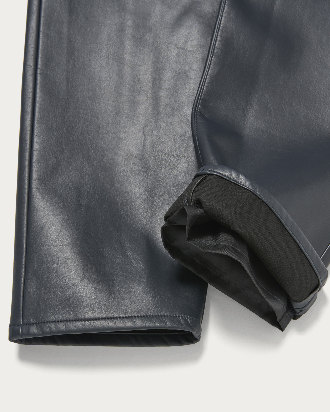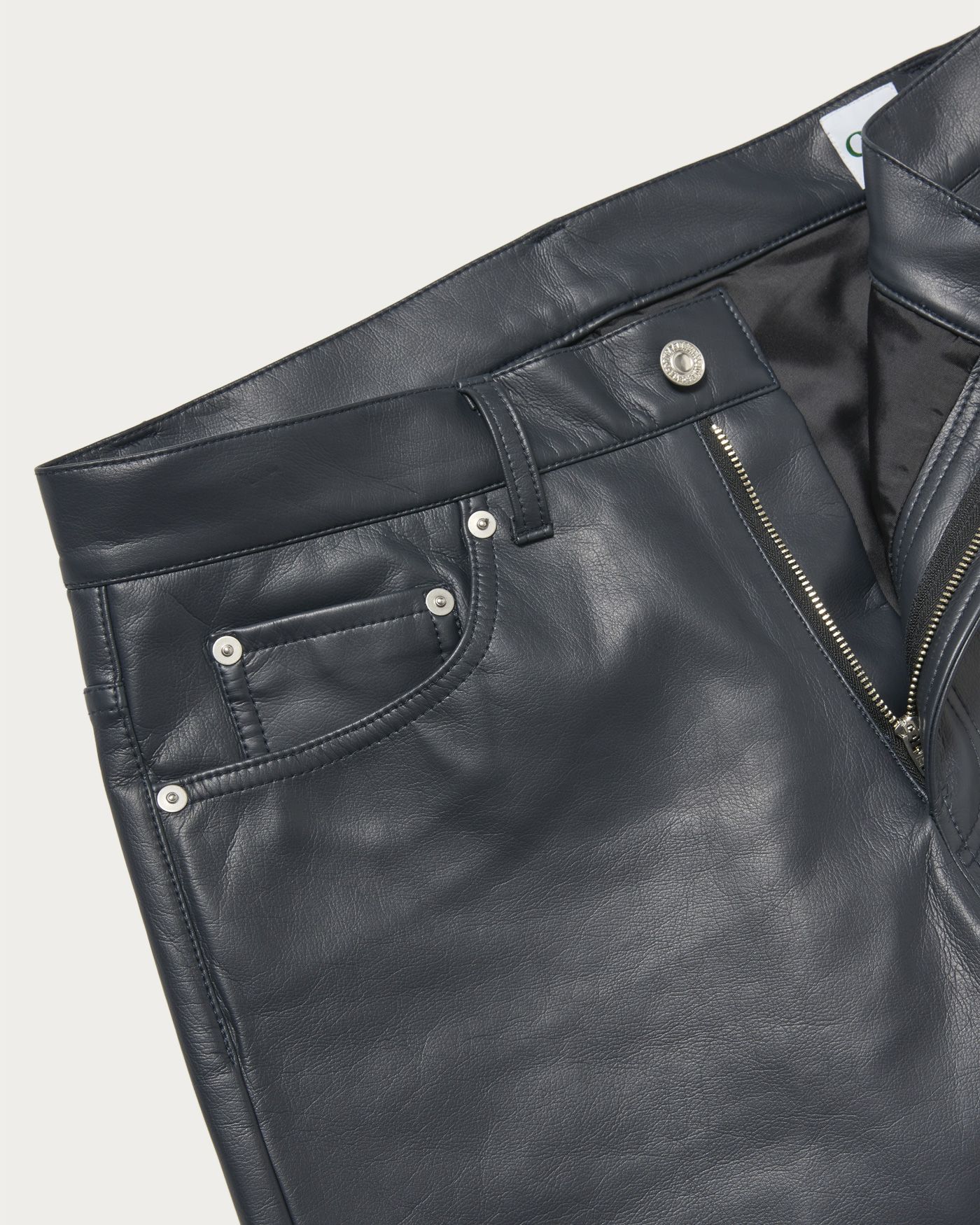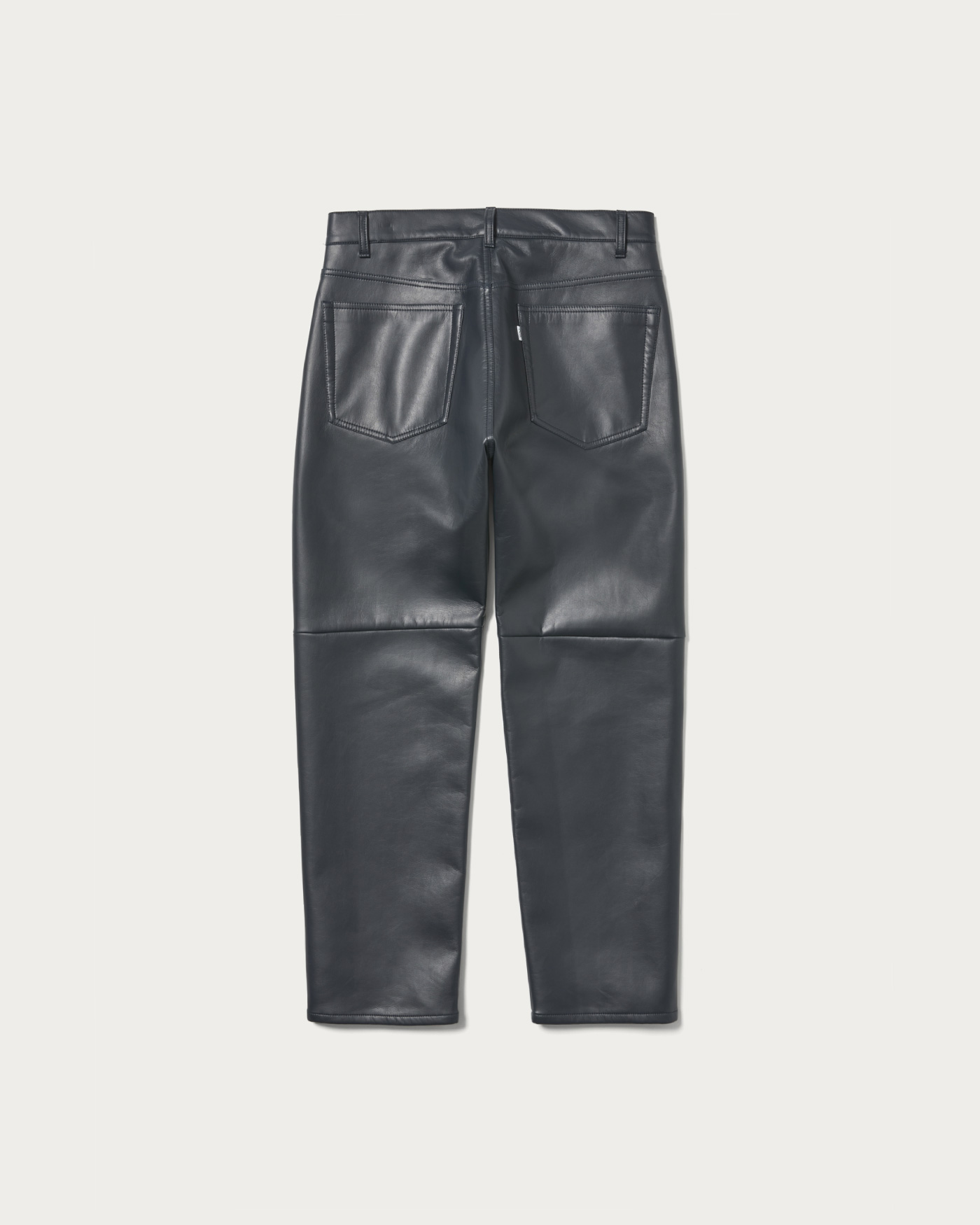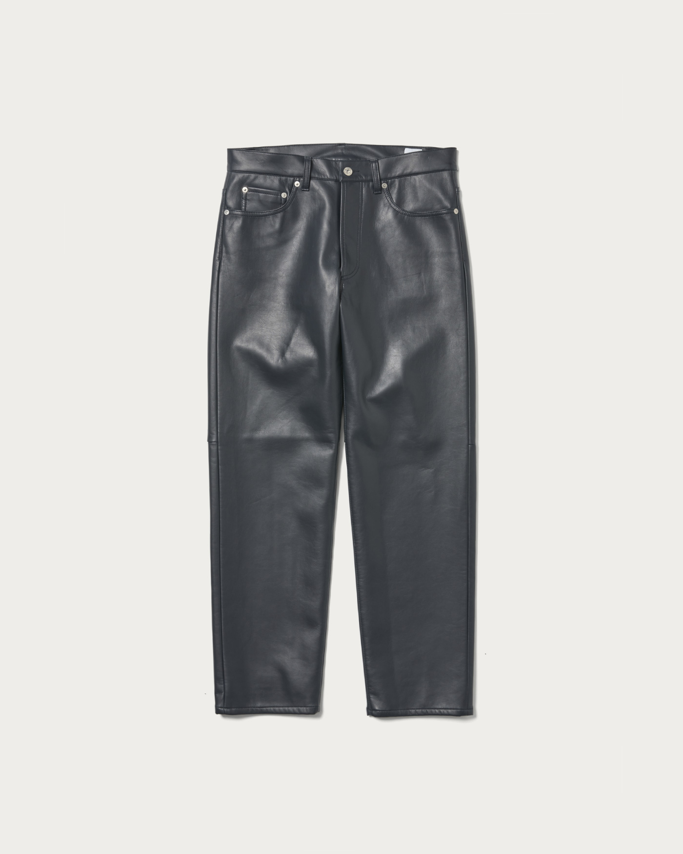〈CGS.〉定番の5ポケットパンツをレザー調の素材でリリース。素材はイタリアのLEATHERTEX社が中国で生産する合成皮革を採用。なめらかで上品な質感が特長で絶妙なネイビーの色味もポイント。ややコンパクトめなヒップ回りで裾にかけてはすっきりみえる絶妙なレッグラインのシルエットで総裏仕様です。ユニセックスで着用いただけて独特な存在感を放ち装いに特別な雰囲気を持たらせてくれます。