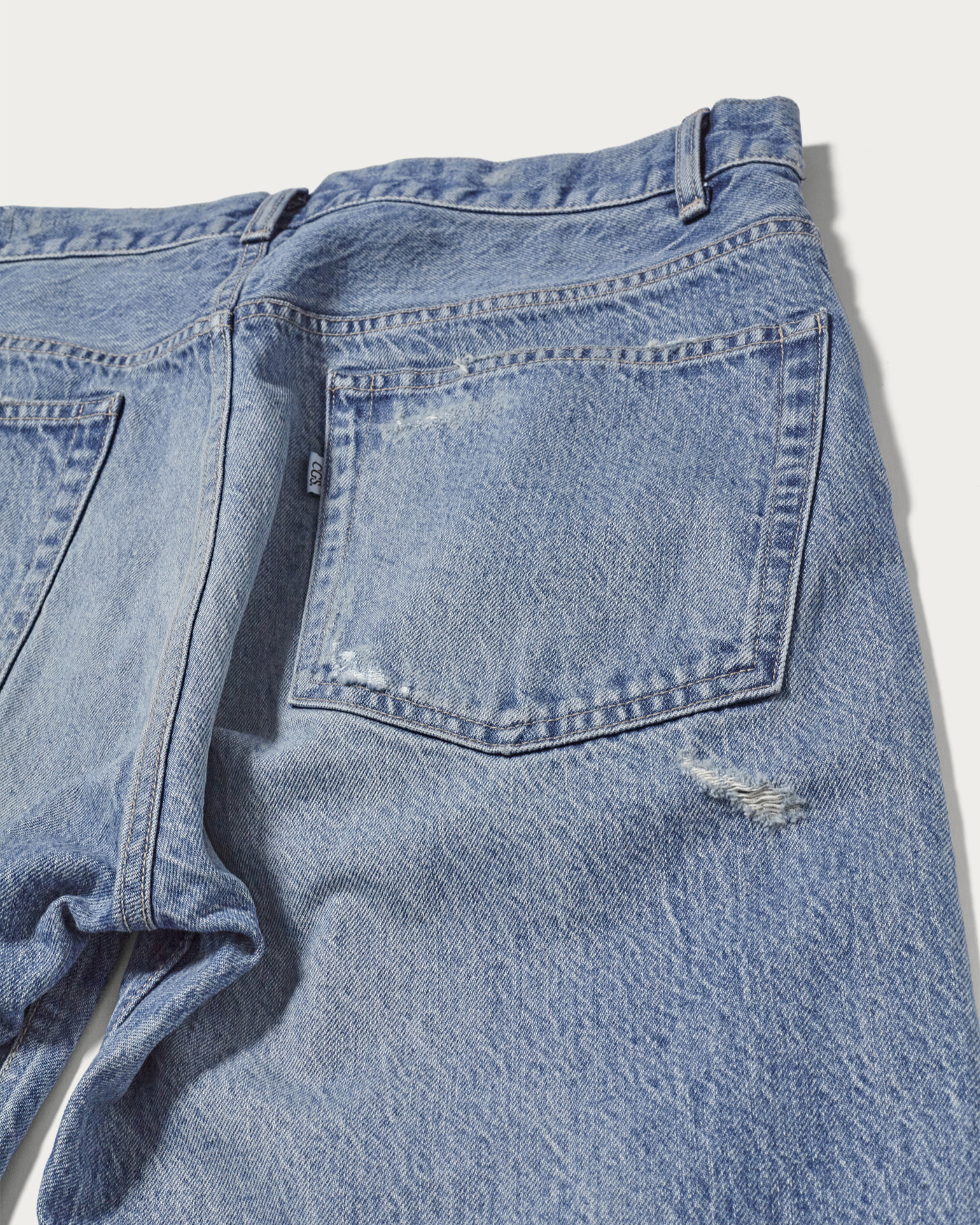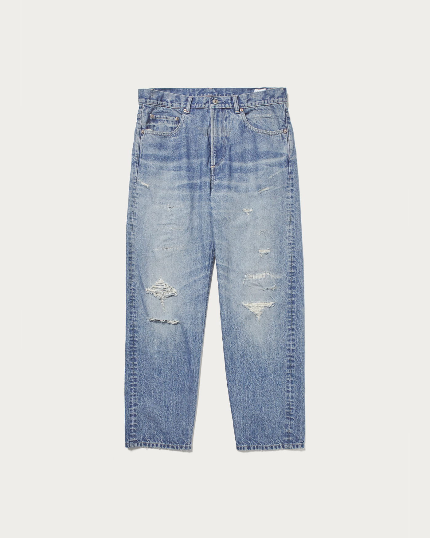 ヴィンテージデニムを参考にユーズド加工を施した5ポケットデニムパンツ。オーガニックコットン100%の13ozカイハラ社製デニムを使用。ややコンパクトめなヒップ回りで、渡り幅〜膝幅〜裾にかけてすっきりみえる絶妙なレッグラインのオーセンティックなシルエット。生地、縫製、加工まで”MADE IN JAPAN”でこだわり貫いた一着です。