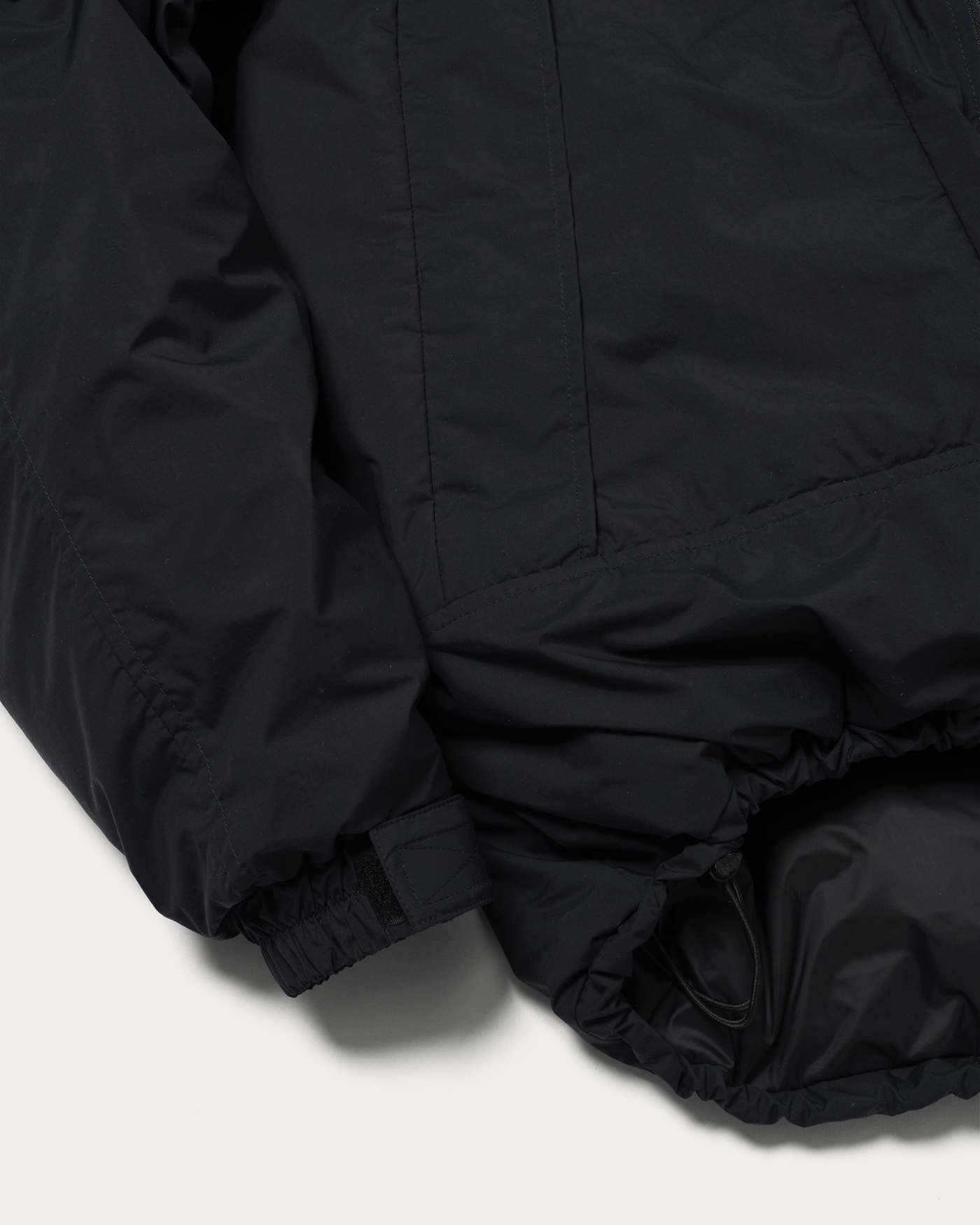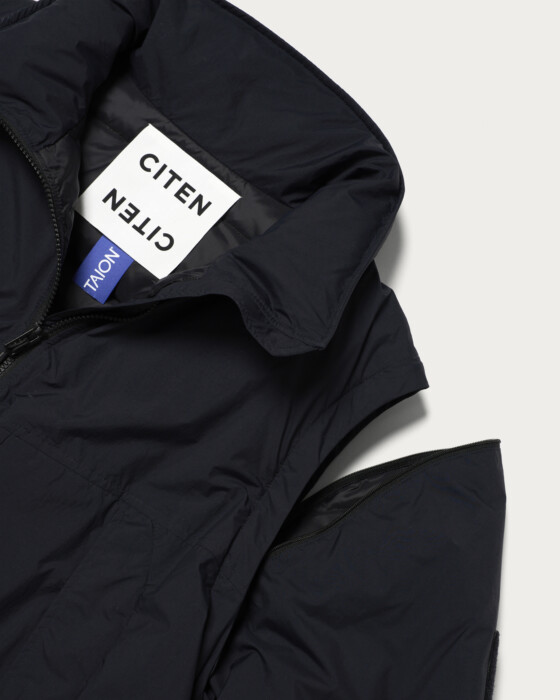 ショートタイプのモンスターパーカーから着想を得て現代的なパターンとディテールで別注したダウンジャケット。オリジナルカラーで染め上げた北陸の合繊生地メーカー「コマツマテーレ」社製の撥水機能付きのナイロン素材を採用。ダウンには800フィルパワーのホワイトダックダウンをふんだんに使用し、ボリューミーな見た目に反して実用性のある軽さが特徴です。