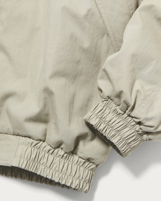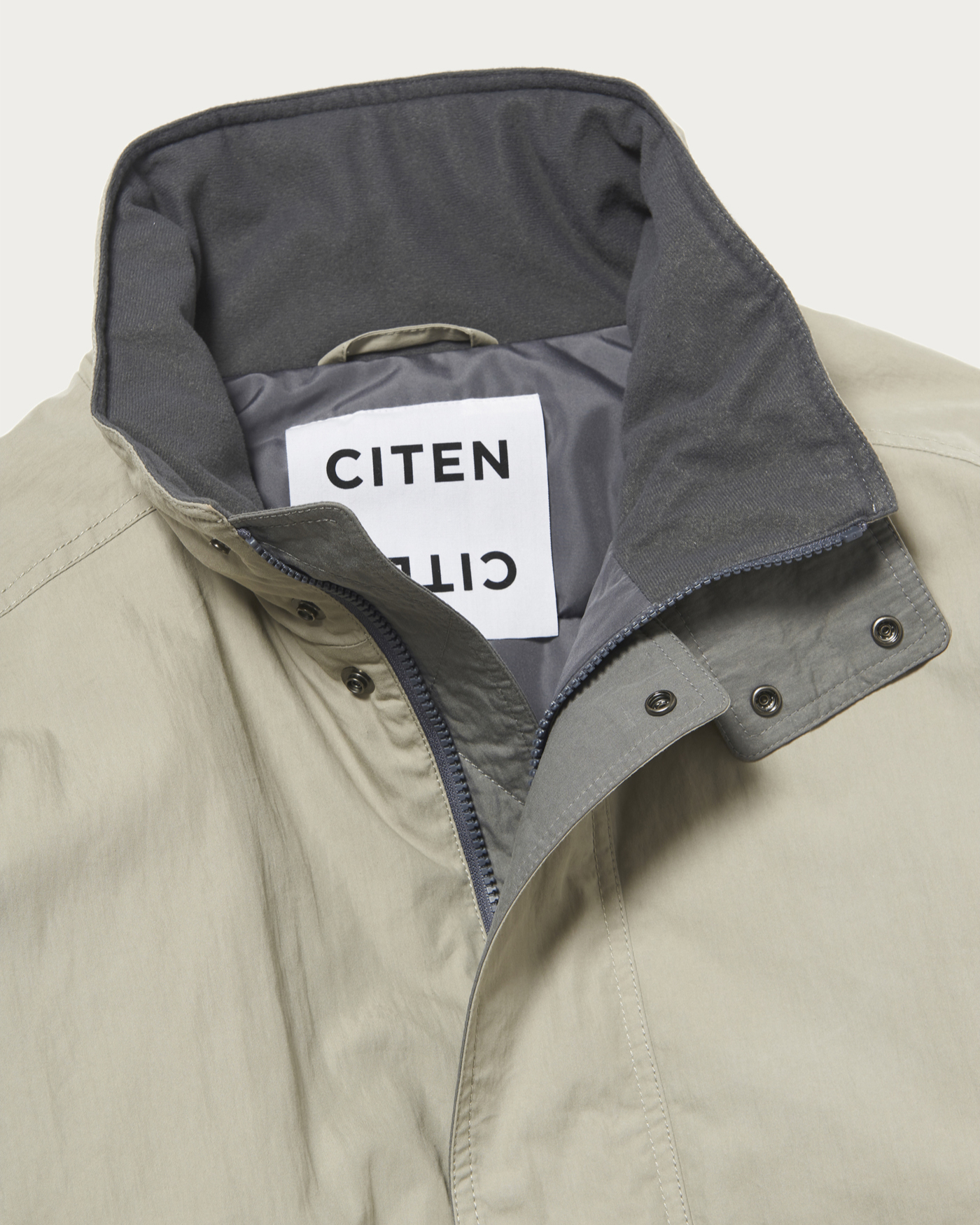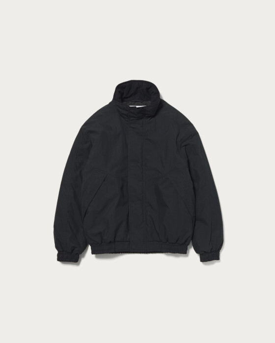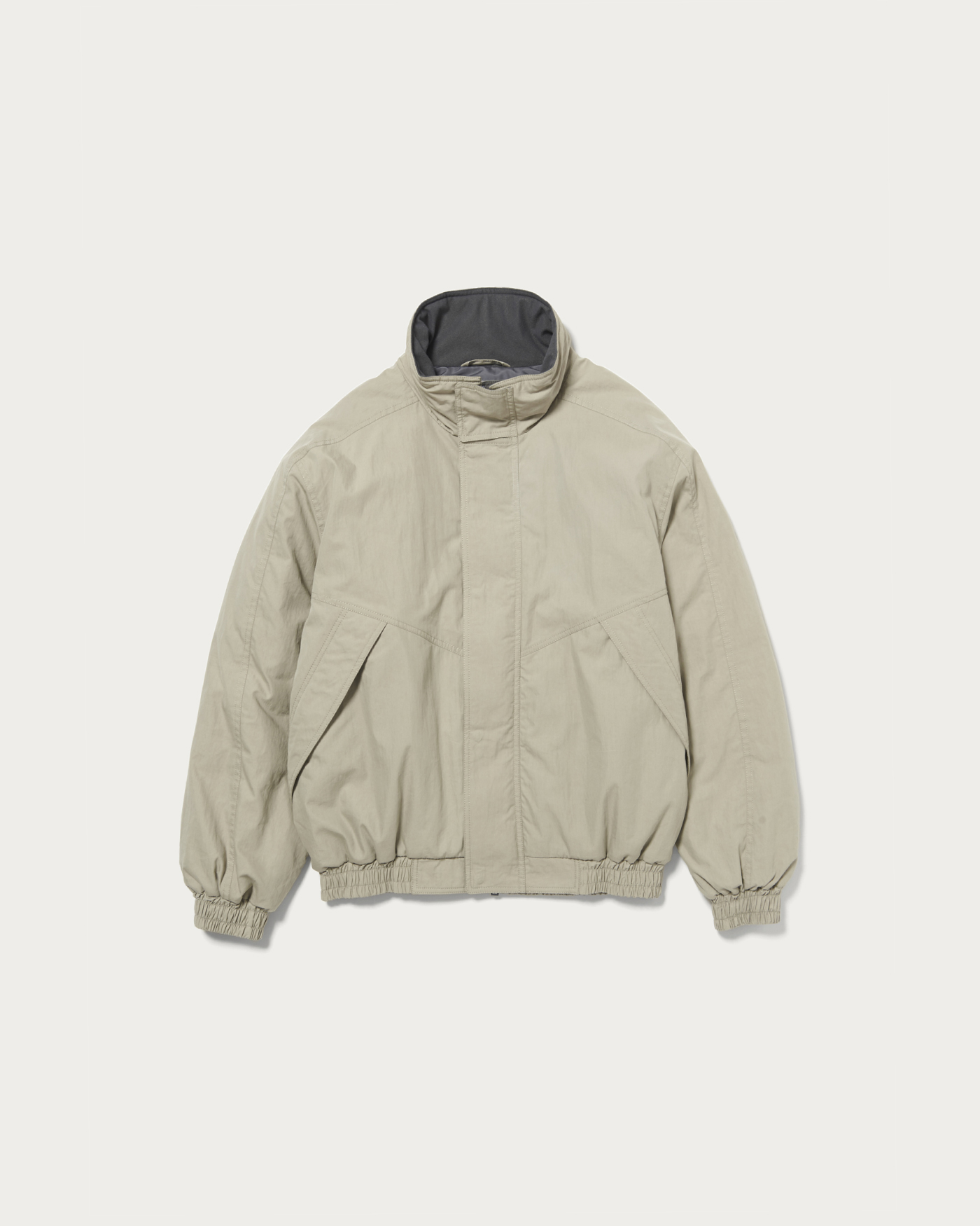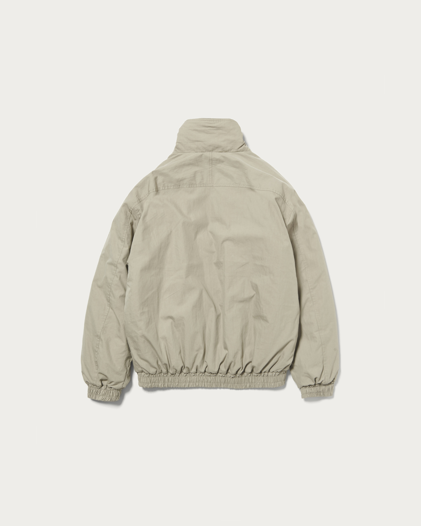 コットンナイロン素材を使用したショートレングスの中綿入りブルゾン。ネック部分とボディ部分にそれぞれセパレートしてデザインされた比翼の前立ては前開き後にネック部分だけを止める事で温度調節もしやすいデザインに。本格的な冬のシーズンの着用も想定して、衿裏側の起毛生地や中綿もしっかり入れたつくりにしています。