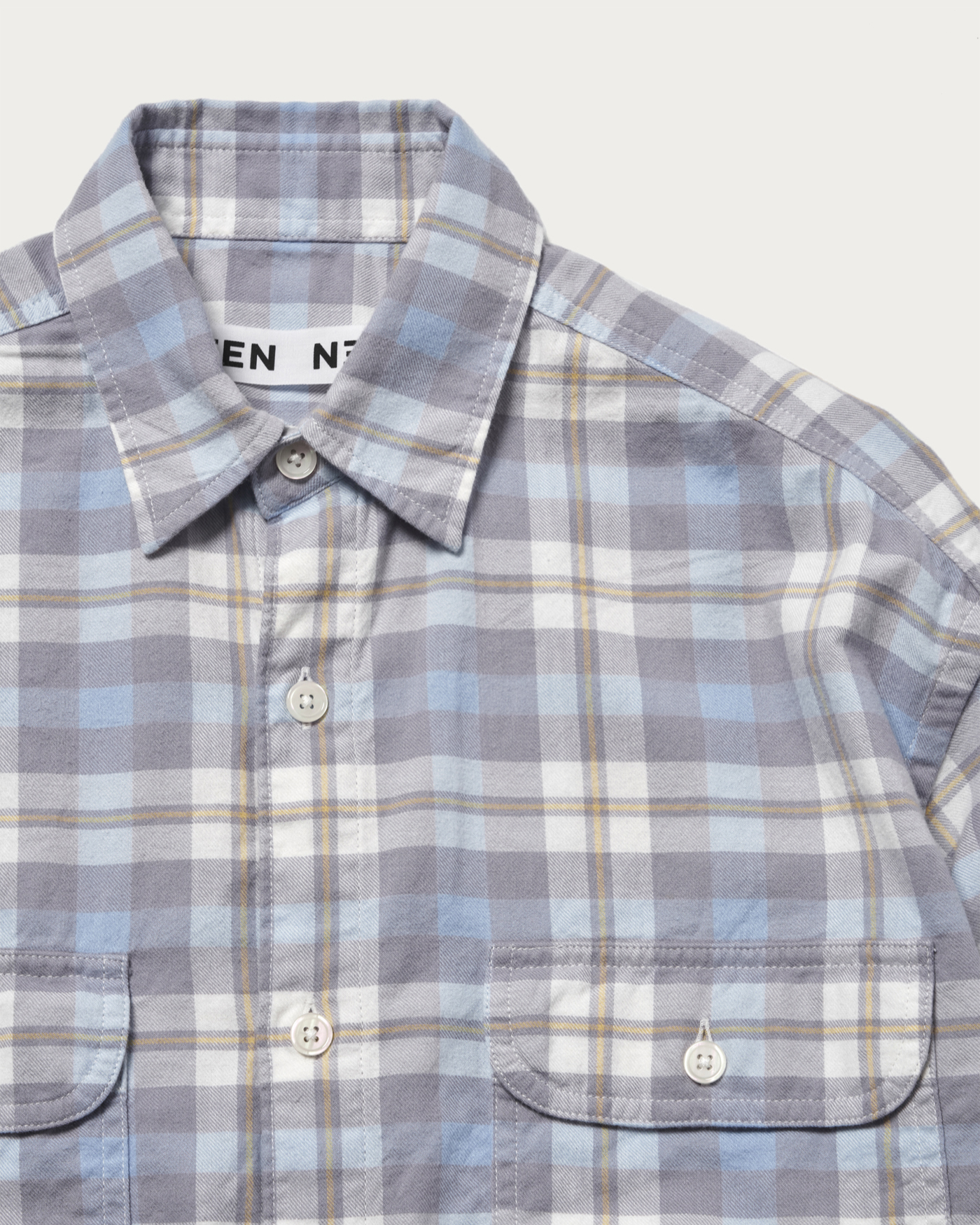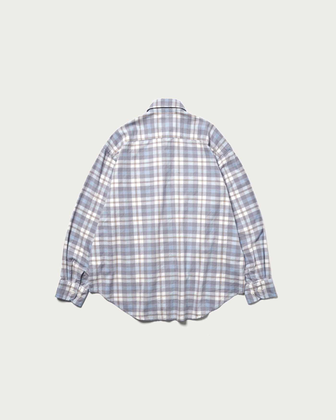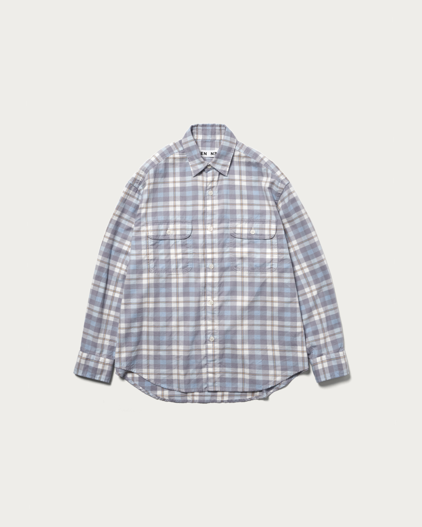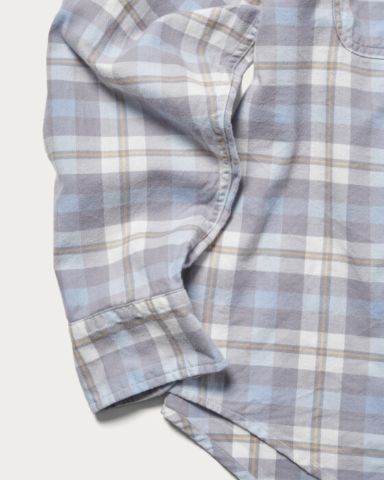 イエローの挿し色が映えるブルーのグラデーションが特徴的なオリジナルのチェック柄を使用したダブルポケットシャツ。起毛感のあるコットン素材で温かみがあるタッチに仕上げました。
