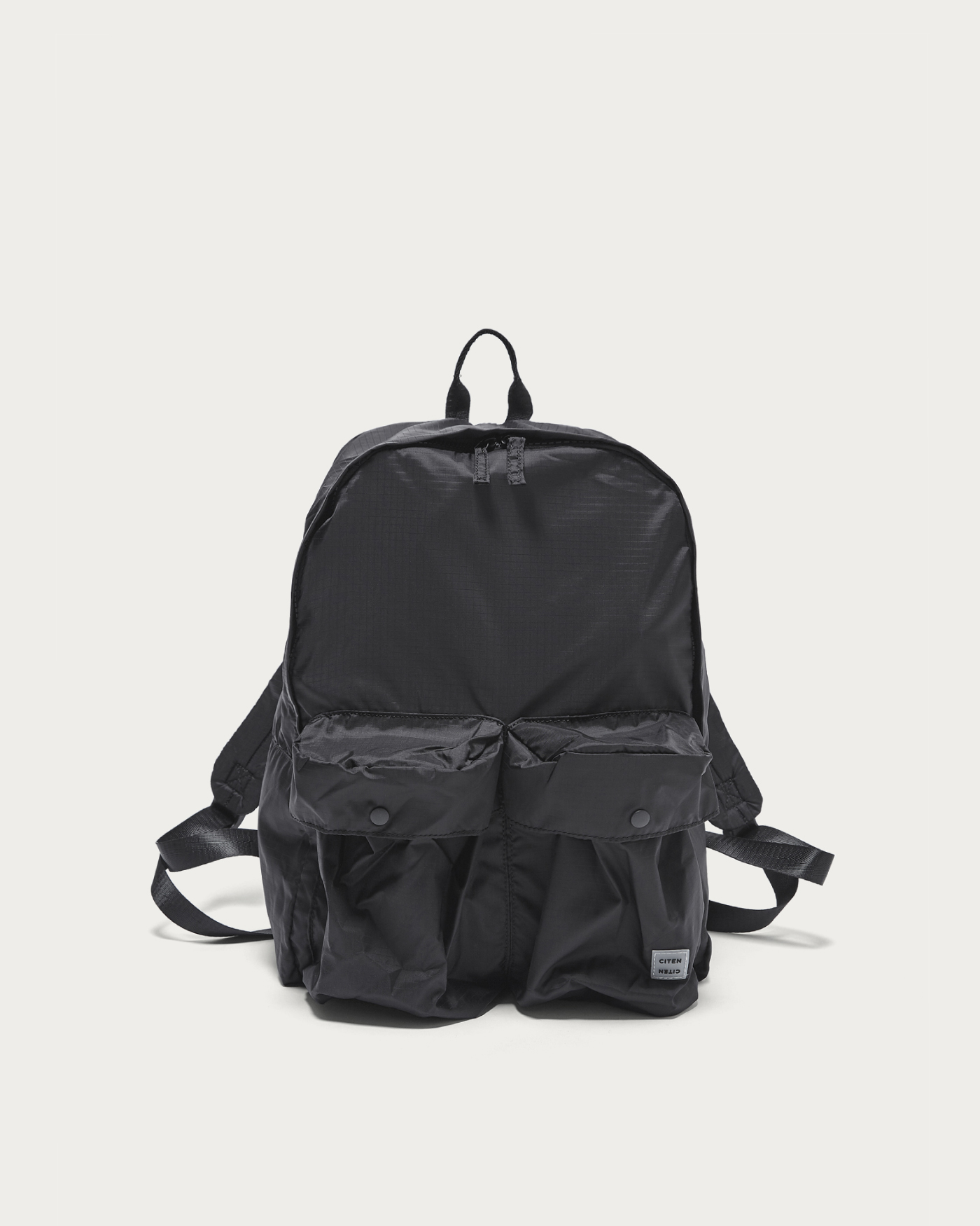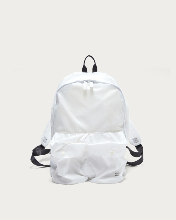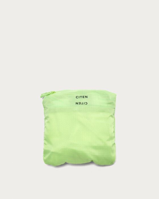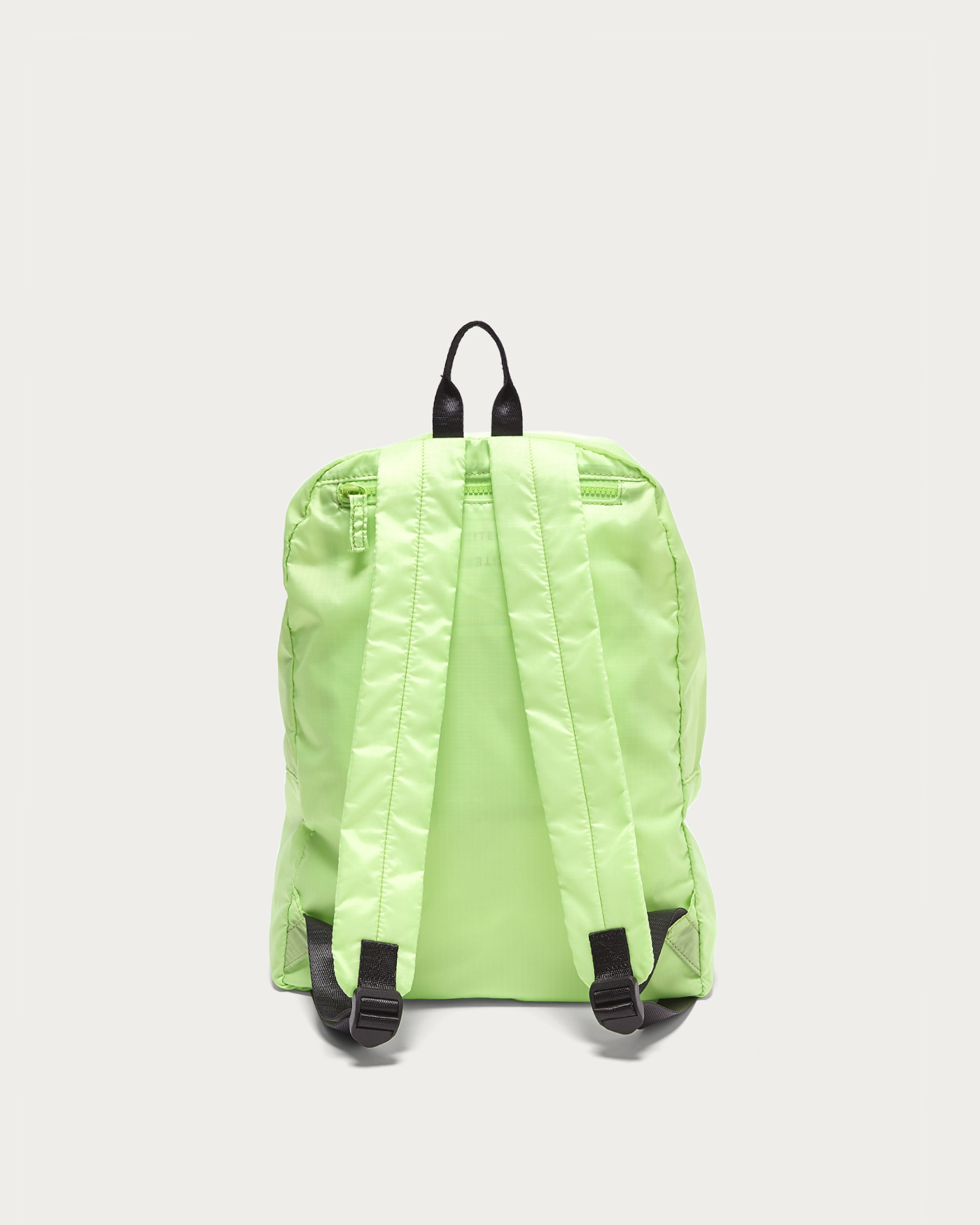 背面のジップのなかにしまうことで持ち運びに便利なパッカブルになるロゴ入りリュック。ベーシックカラーのほか映えるライムカラーも展開します。