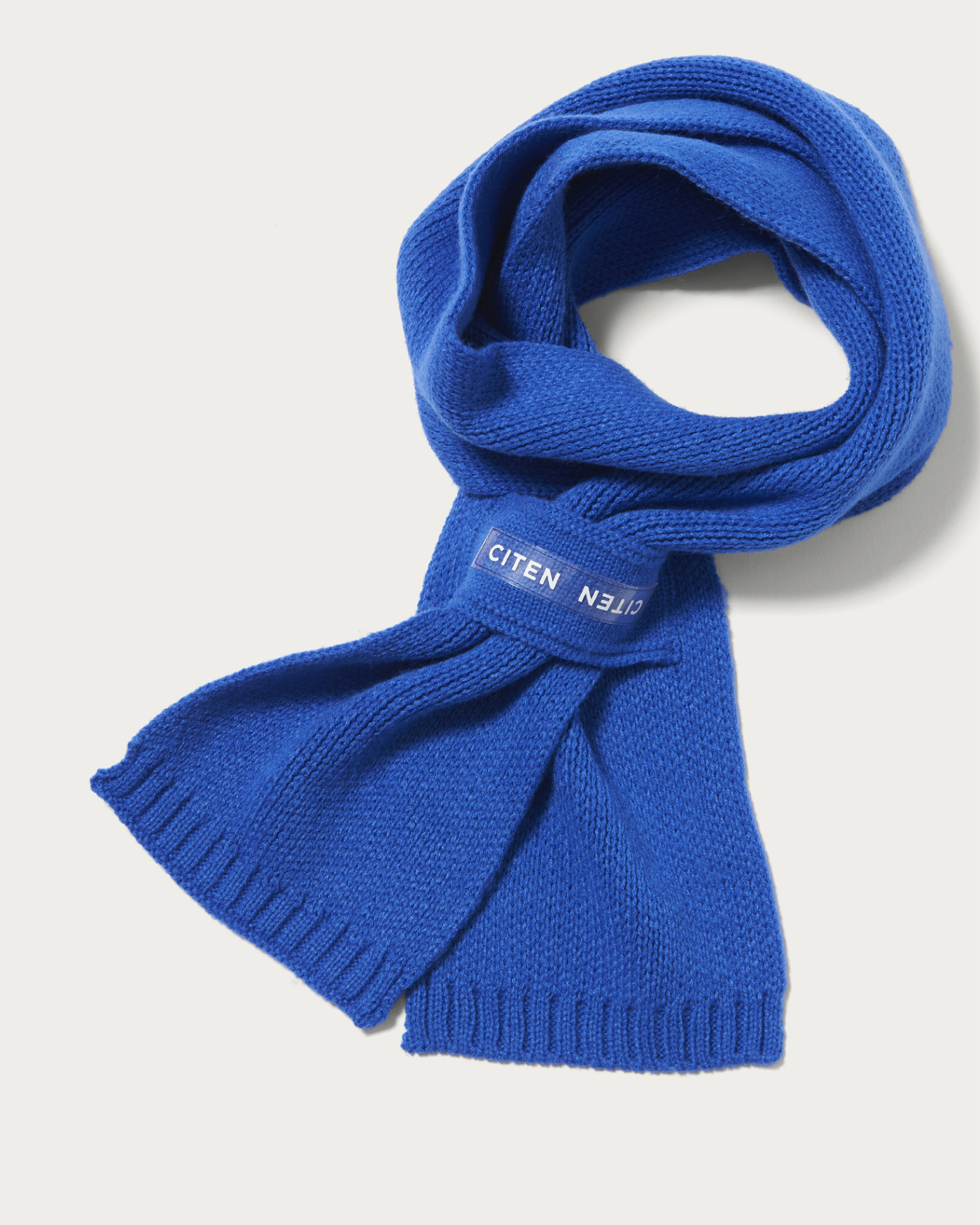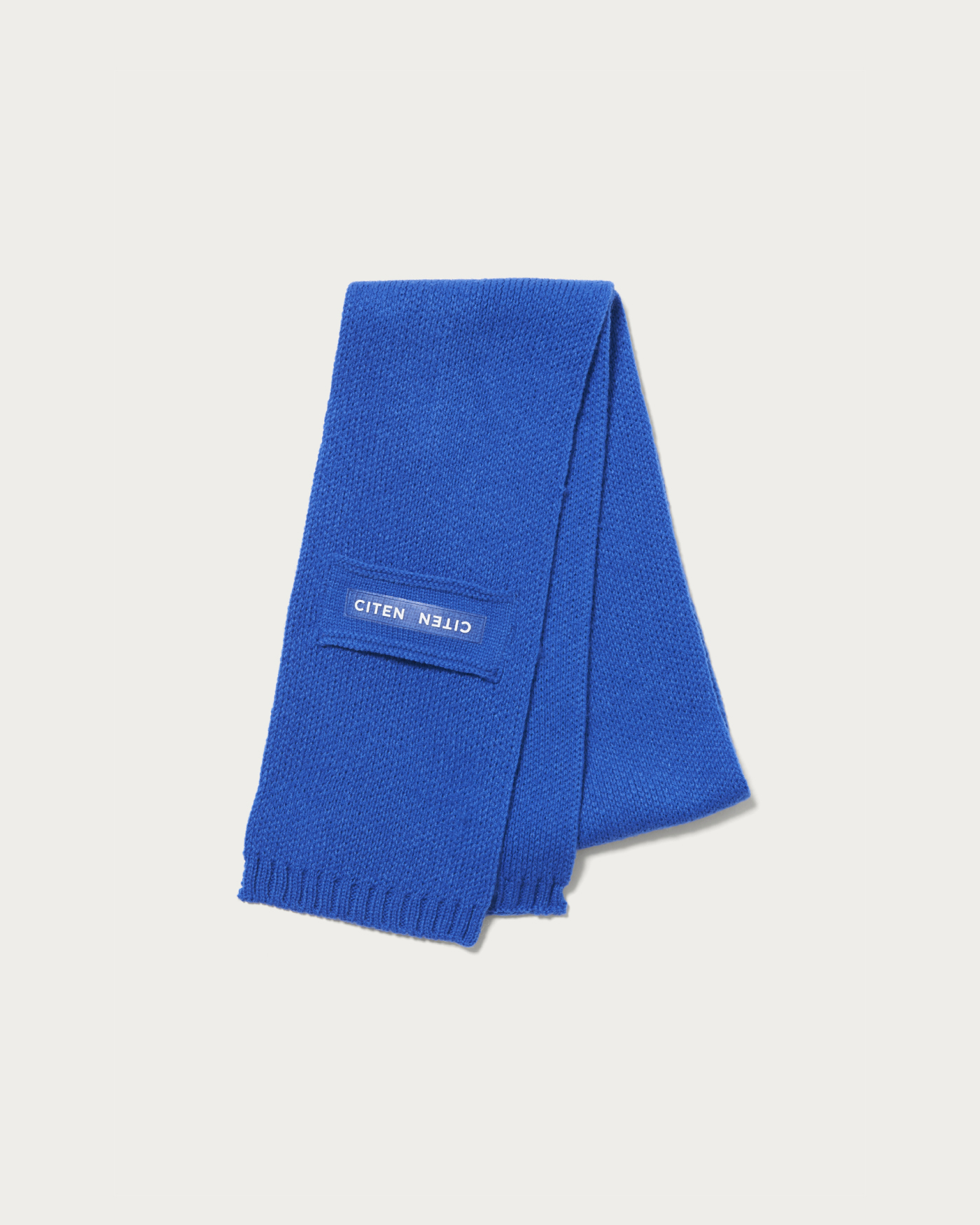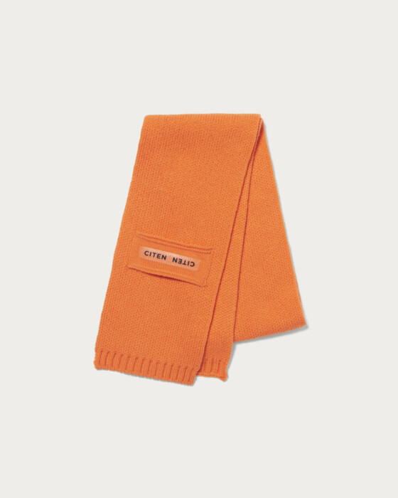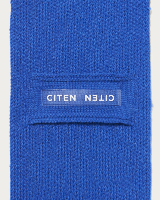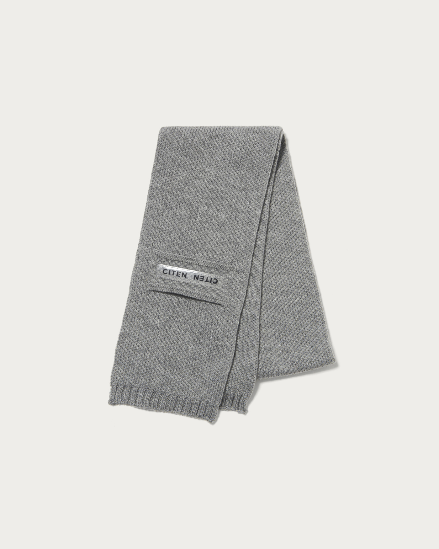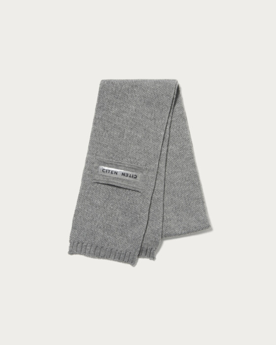 CITENのクリアロゴがアクセントのニットマフラー。細身で巻きやすく差し込み用のパーツに通すだけで簡単に着用可能なデザインに仕上げています。