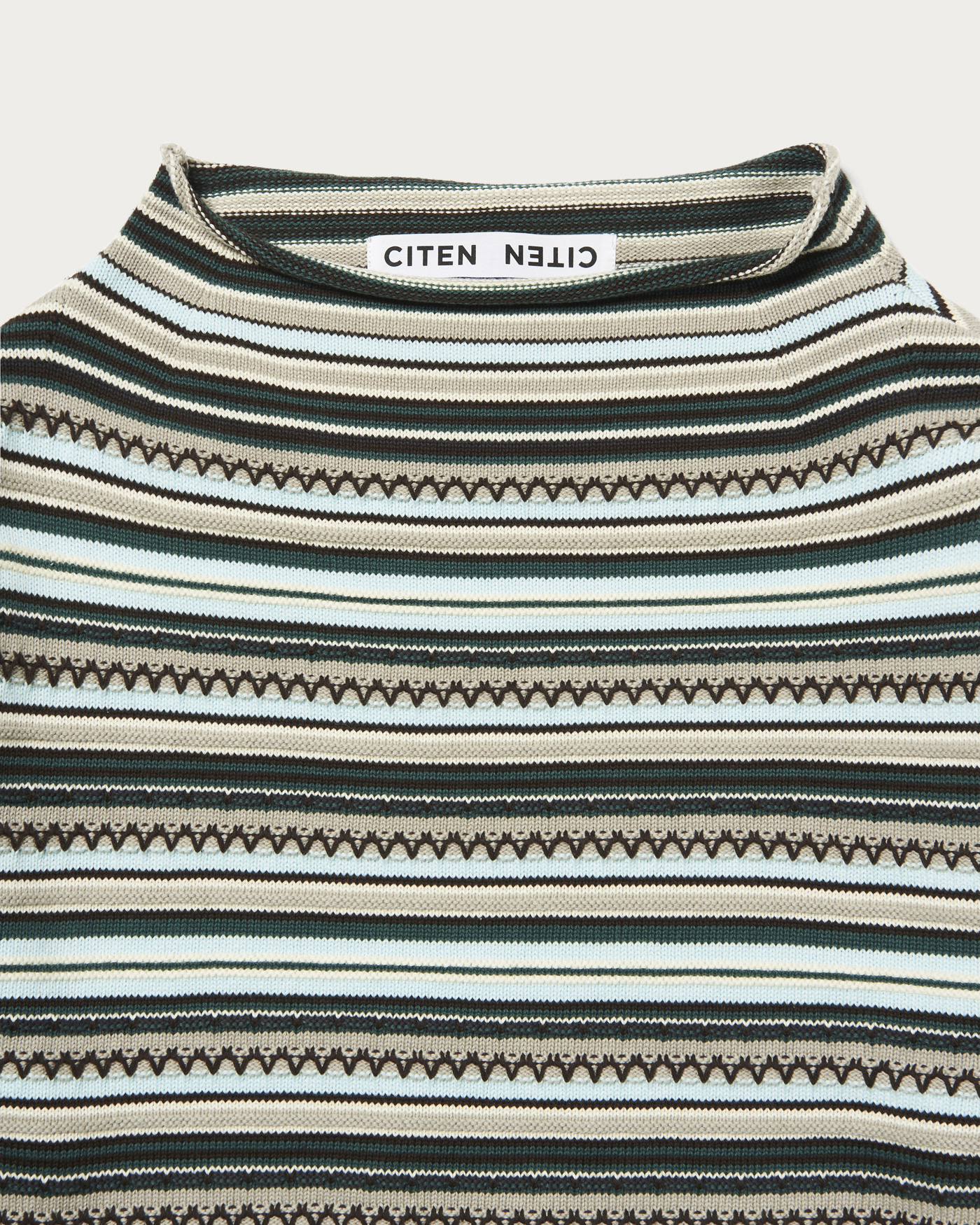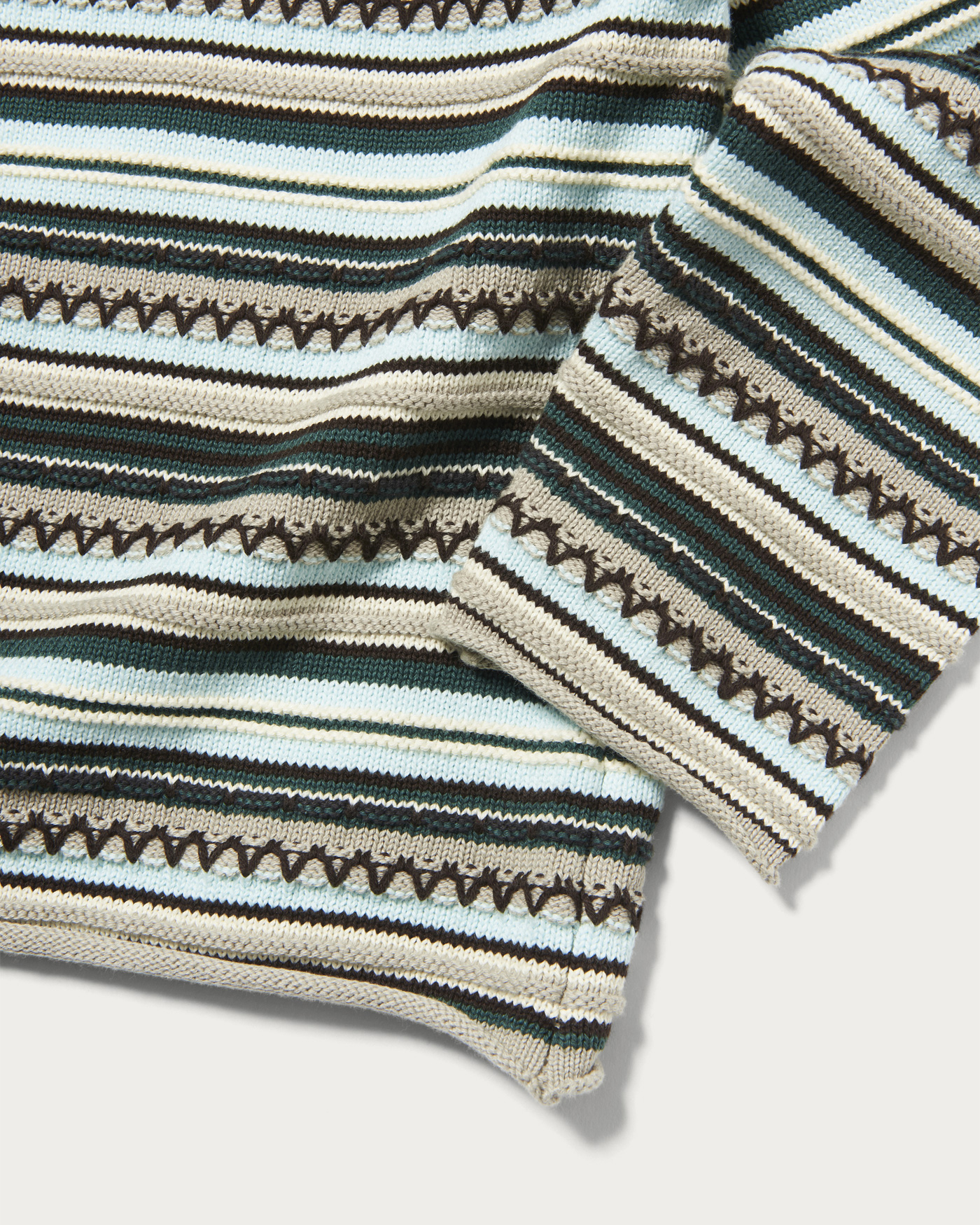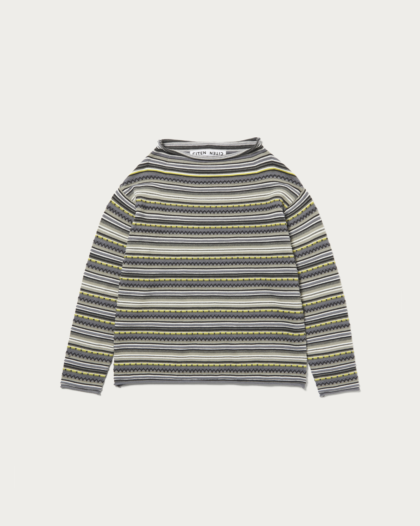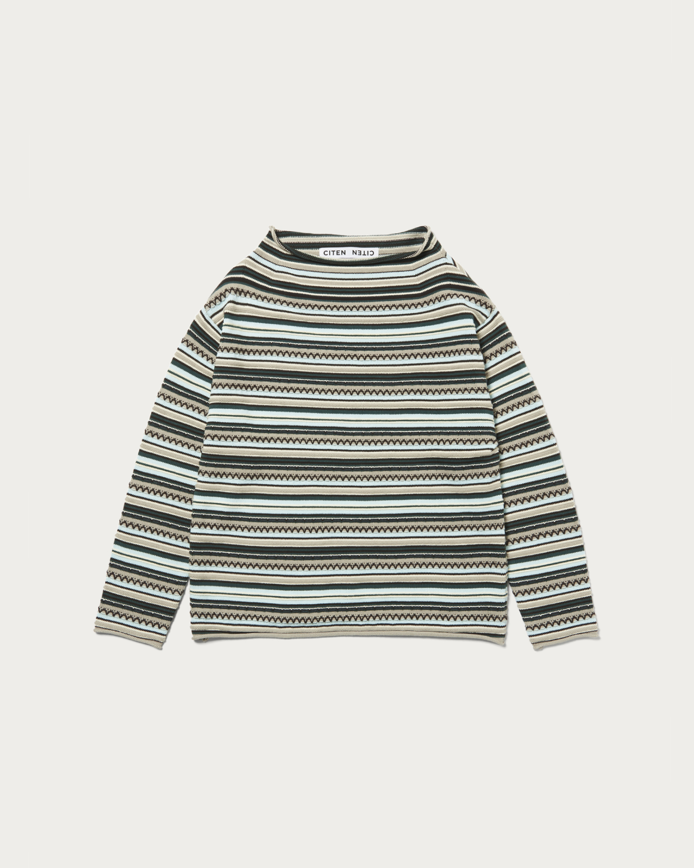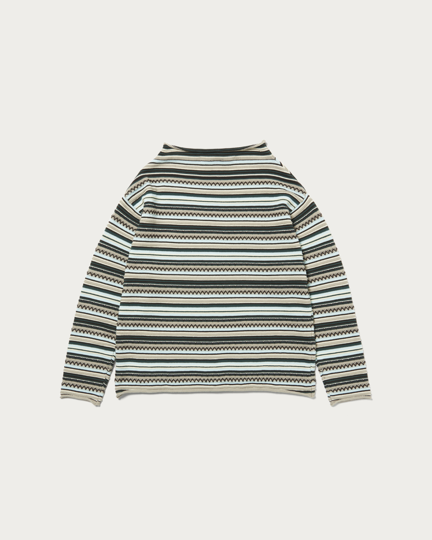 ヴィンテージアーカイブから着想を得たロールネックデザインは拘りのディテール。ウール糸を活かしたざっくりとした編地が際立ちます。首元と袖はあえてゆるくして、大人が着られるリラックスシルエットを意識しました。