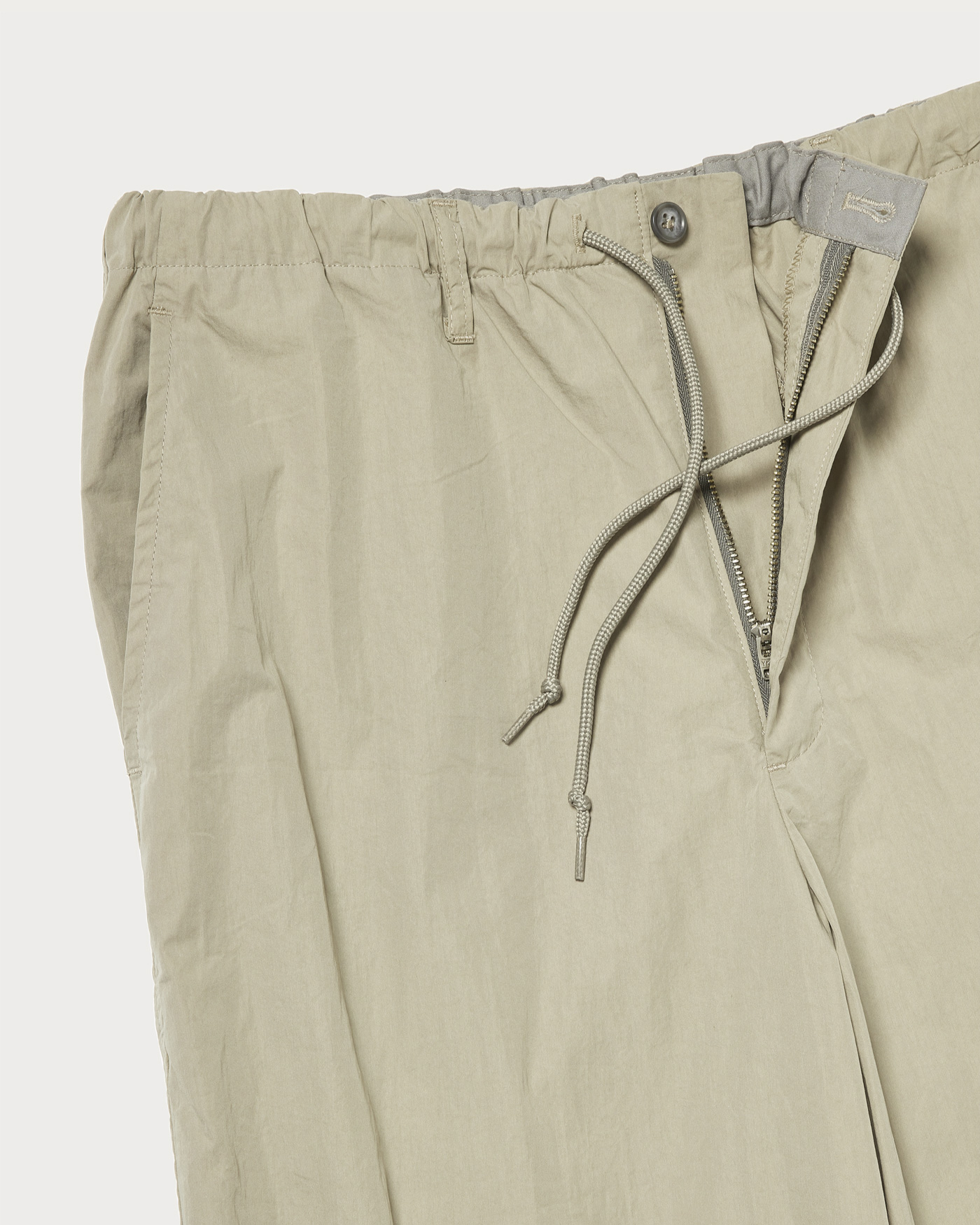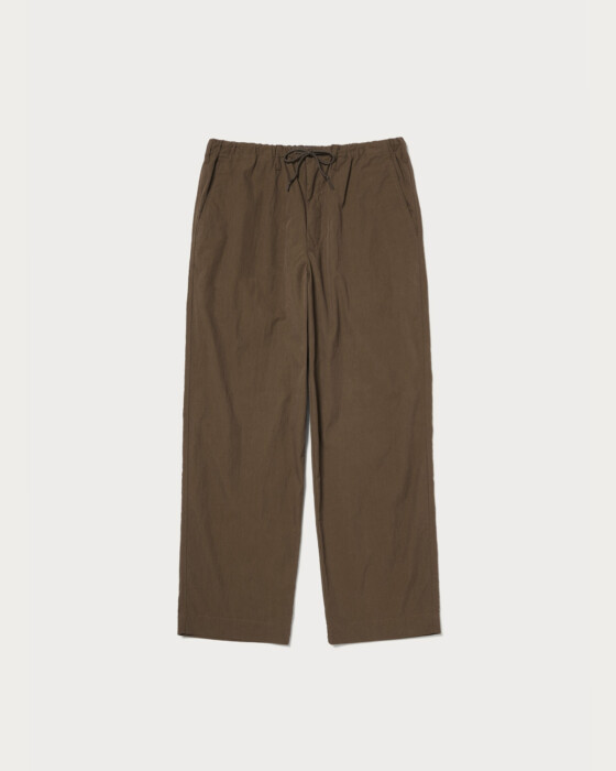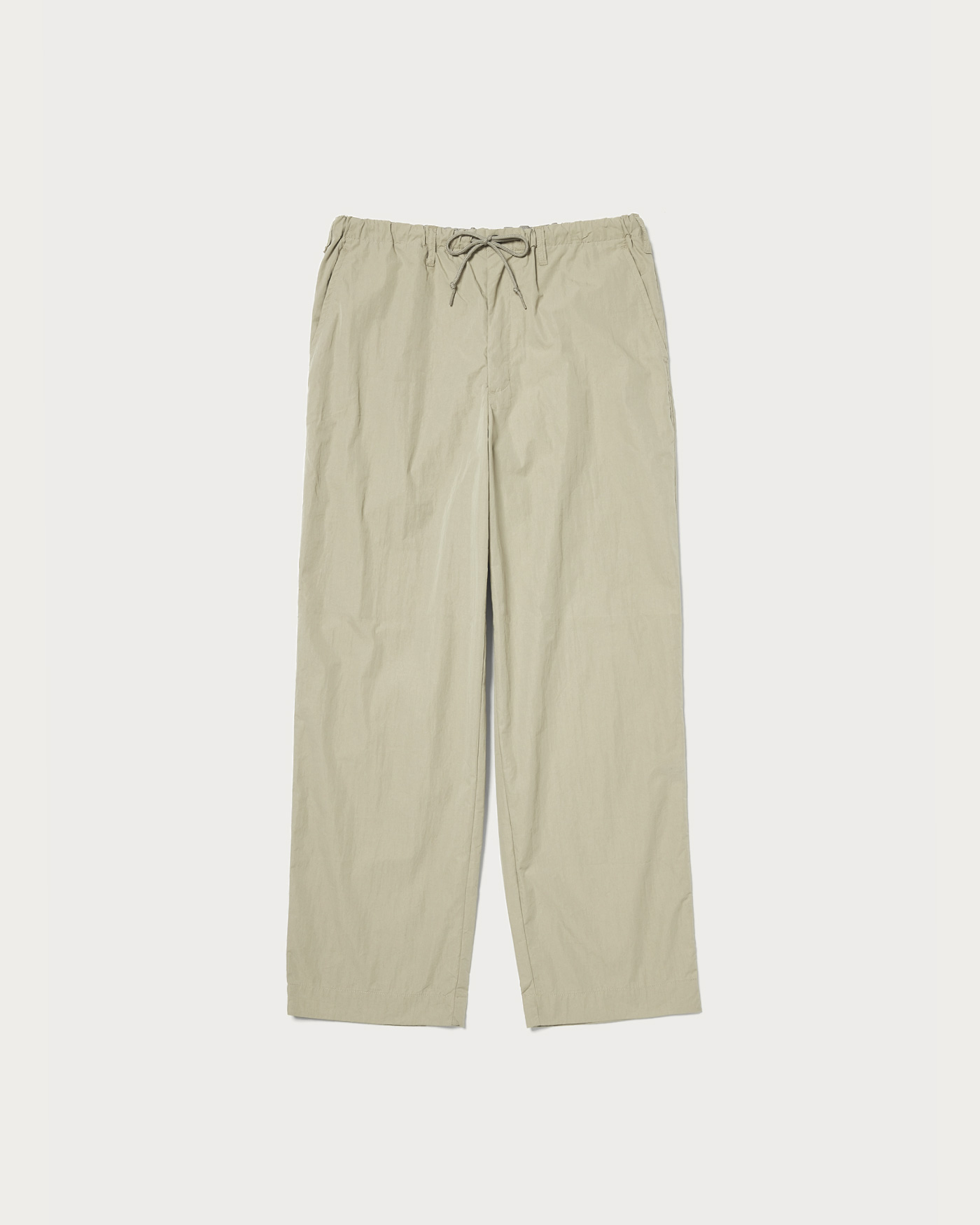 ドライでサラッとしたタッチ感が特徴のコットンナイロン素材を使用したイージーパンツ。フェード感がある特徴的な見え方がポイントの素材です。 すっきりとしたテーパードシルエットながらも、ウエスト部をゴムとスピンドル仕様にすることでイージー仕様に。ベルトレスでも着用いただけます。