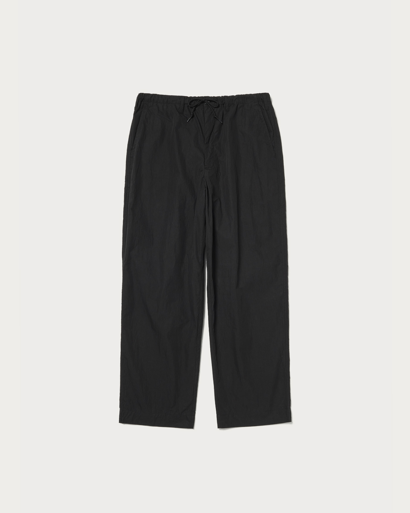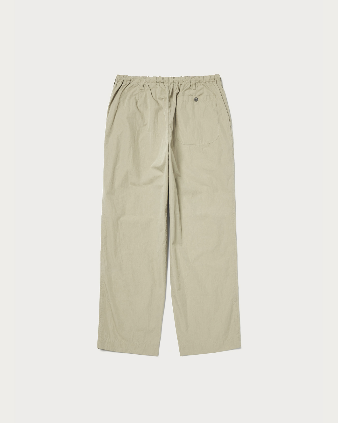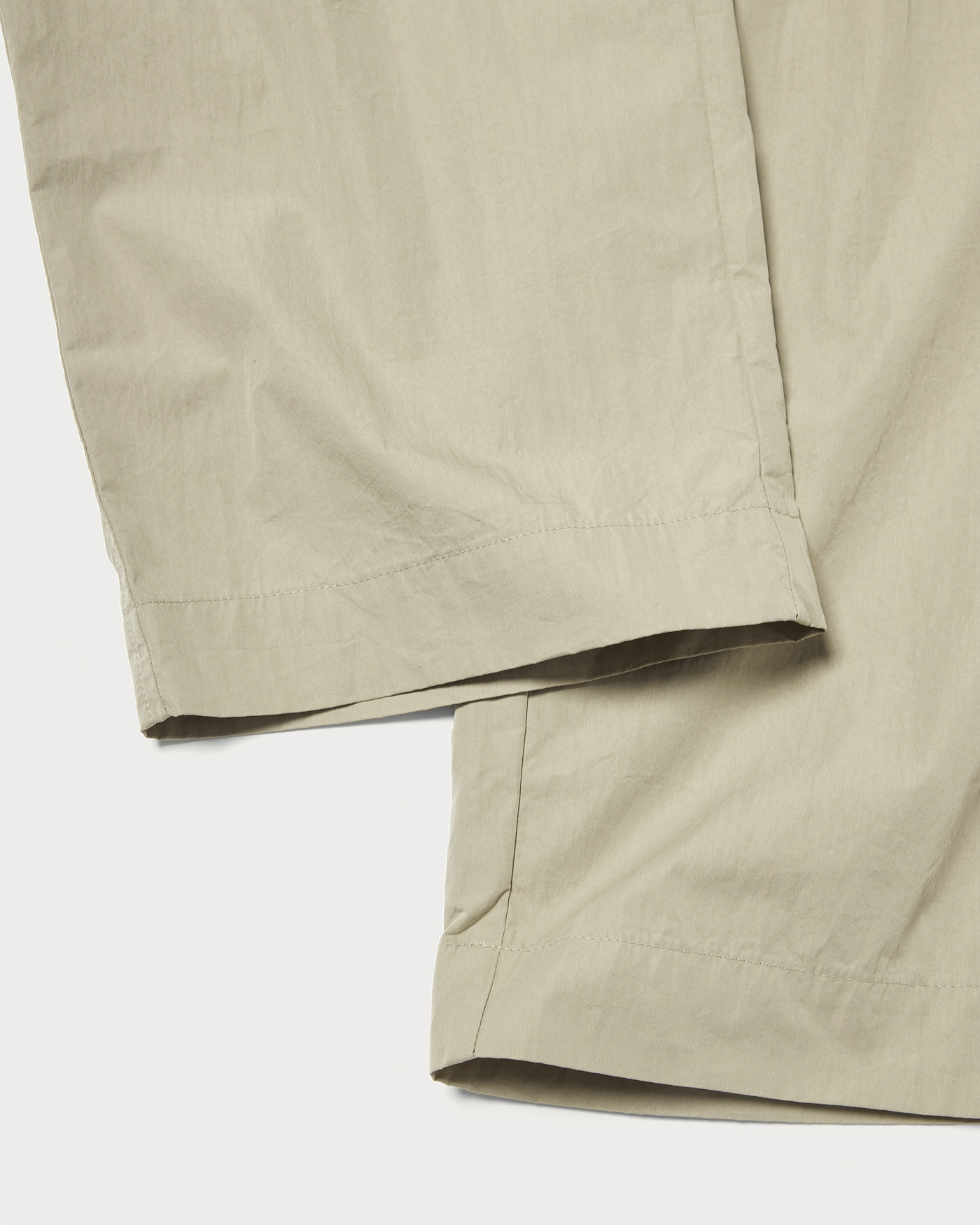 ドライでサラッとしたタッチ感が特徴のコットンナイロン素材を使用したイージーパンツ。フェード感がある特徴的な見え方がポイントの素材です。 すっきりとしたテーパードシルエットながらも、ウエスト部をゴムとスピンドル仕様にすることでイージー仕様に。ベルトレスでも着用いただけます。