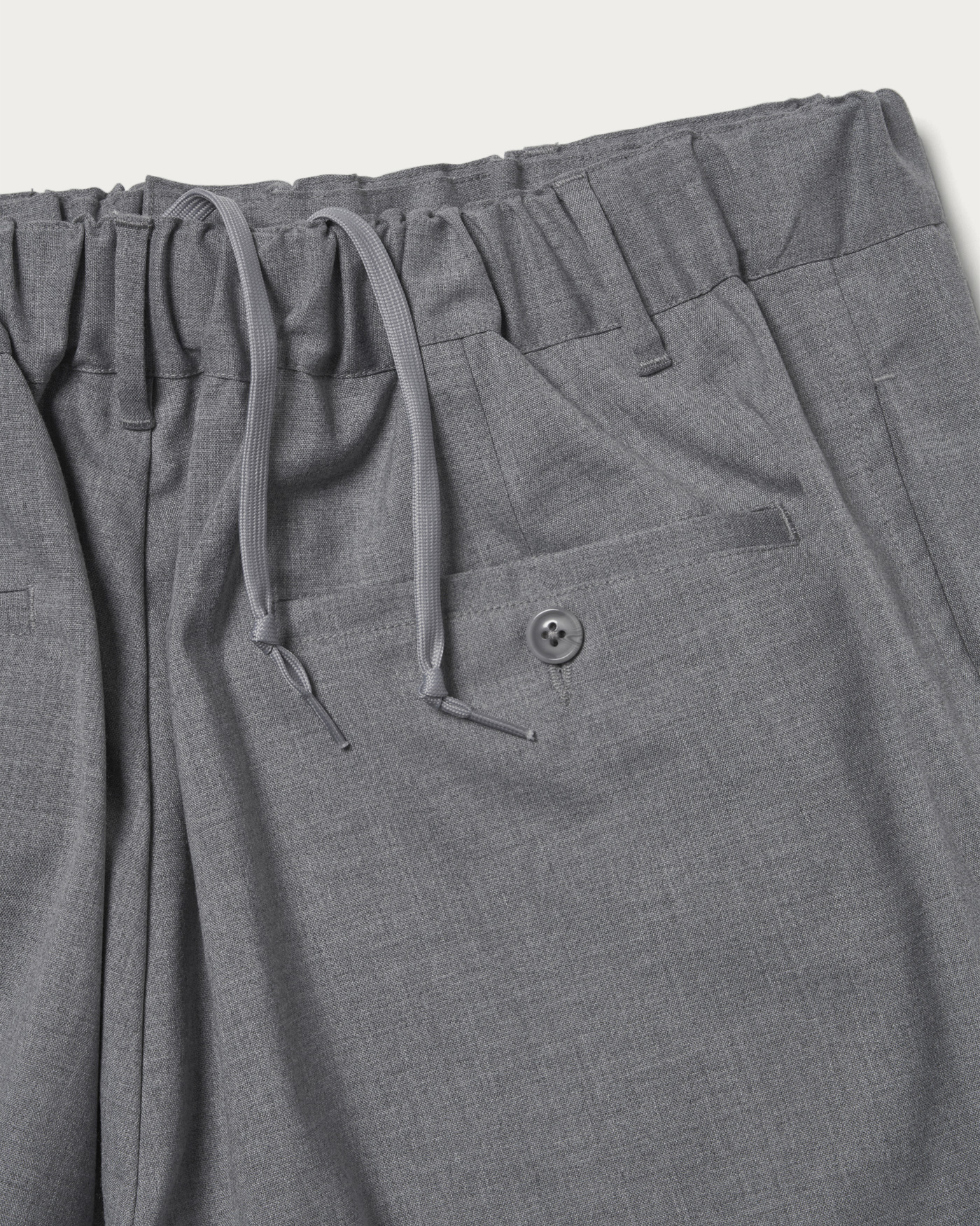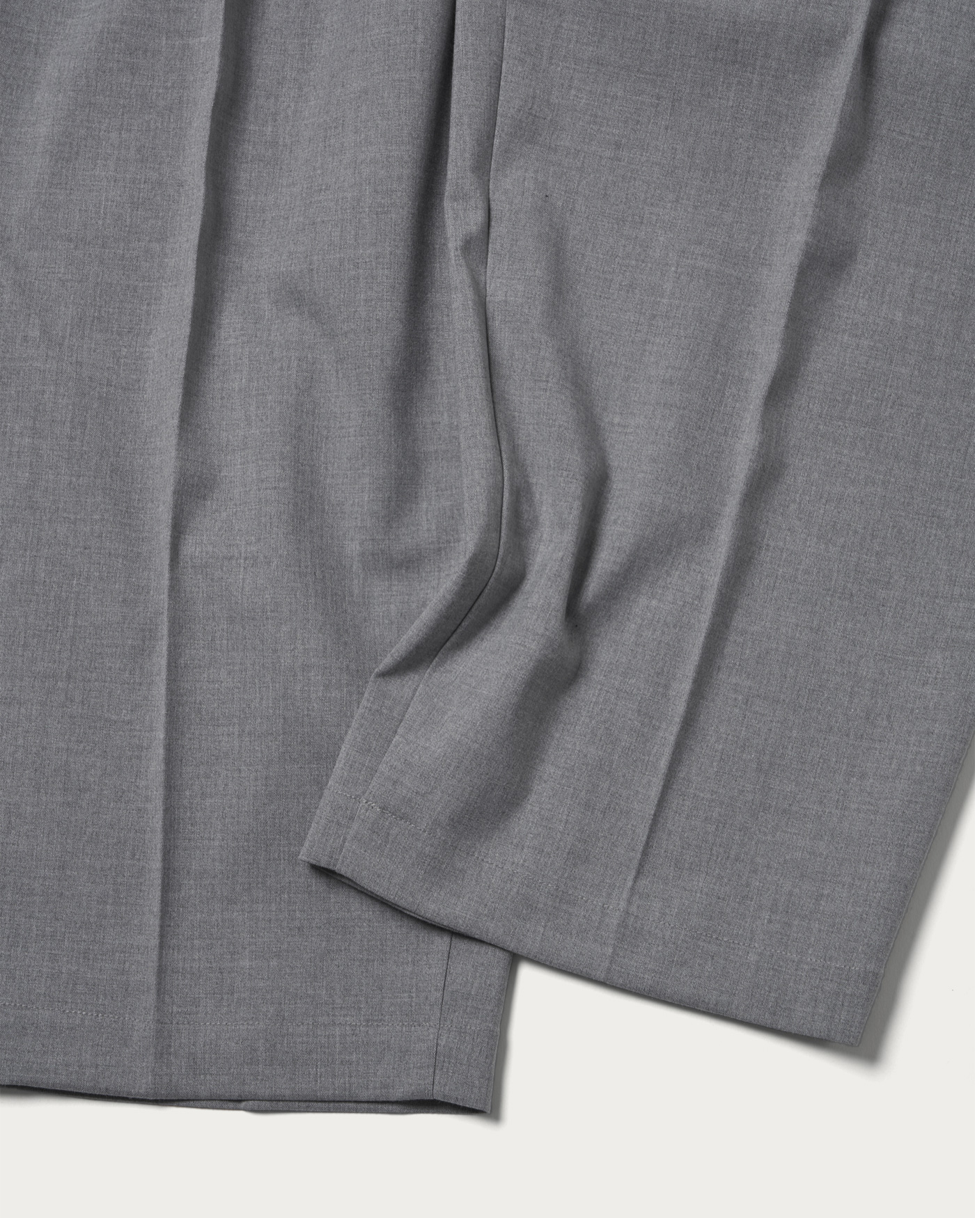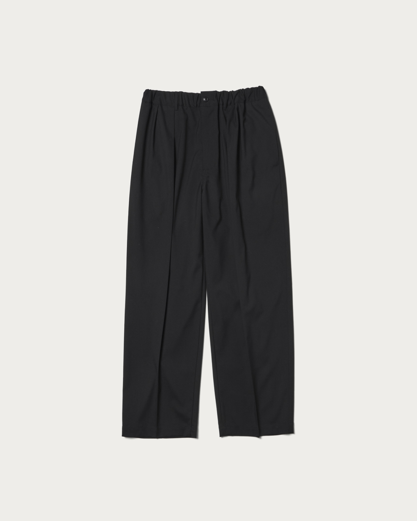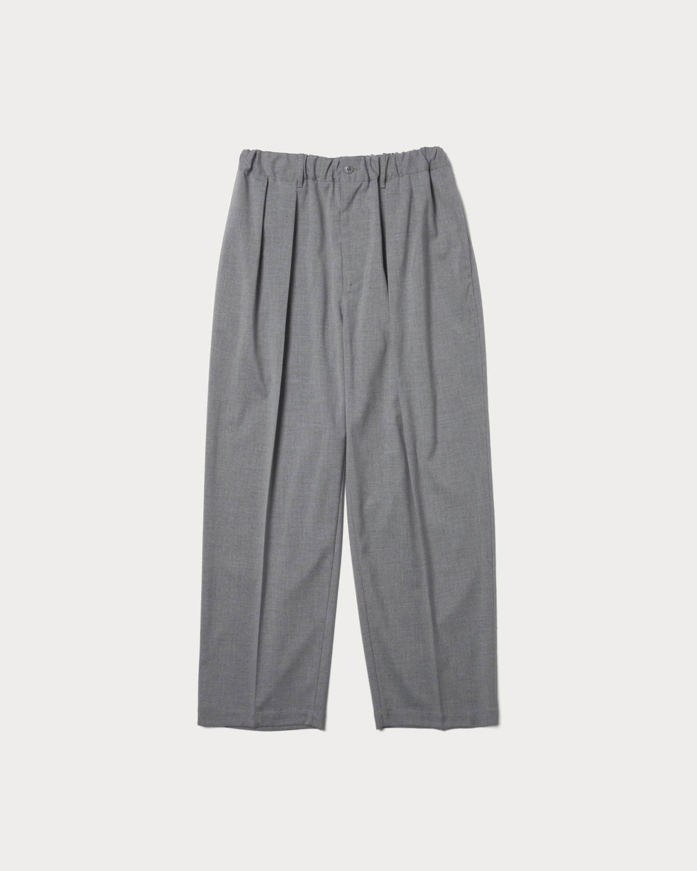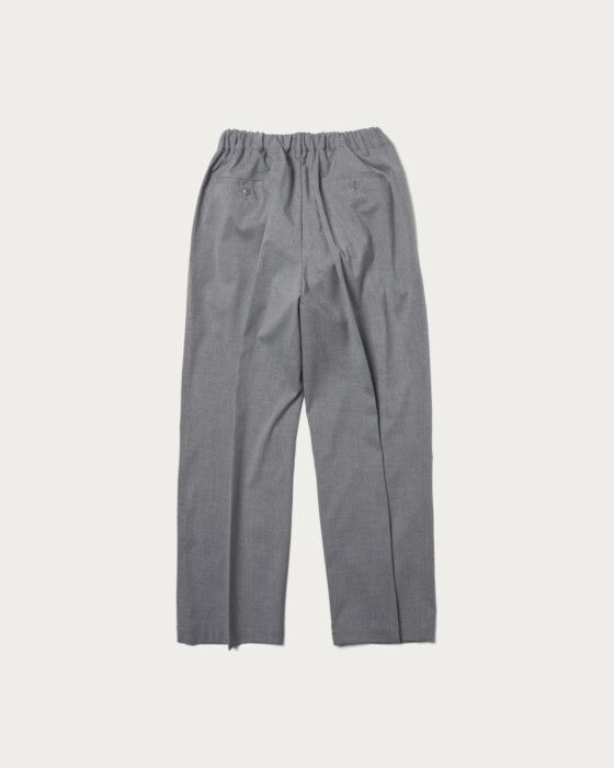 キャリーマン社のポリエステルレーヨン素材を使用したきれいめの2プリーツパンツ。ウエストから裾までゆとりを持たせたフォルムが特徴的でウエストのゴムとスピンドルが着こなしの幅を広げます。