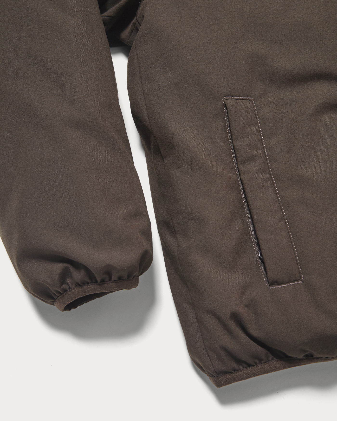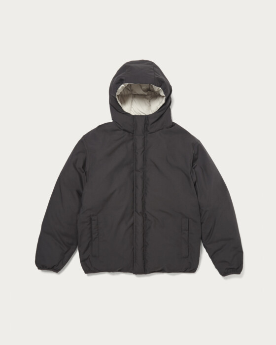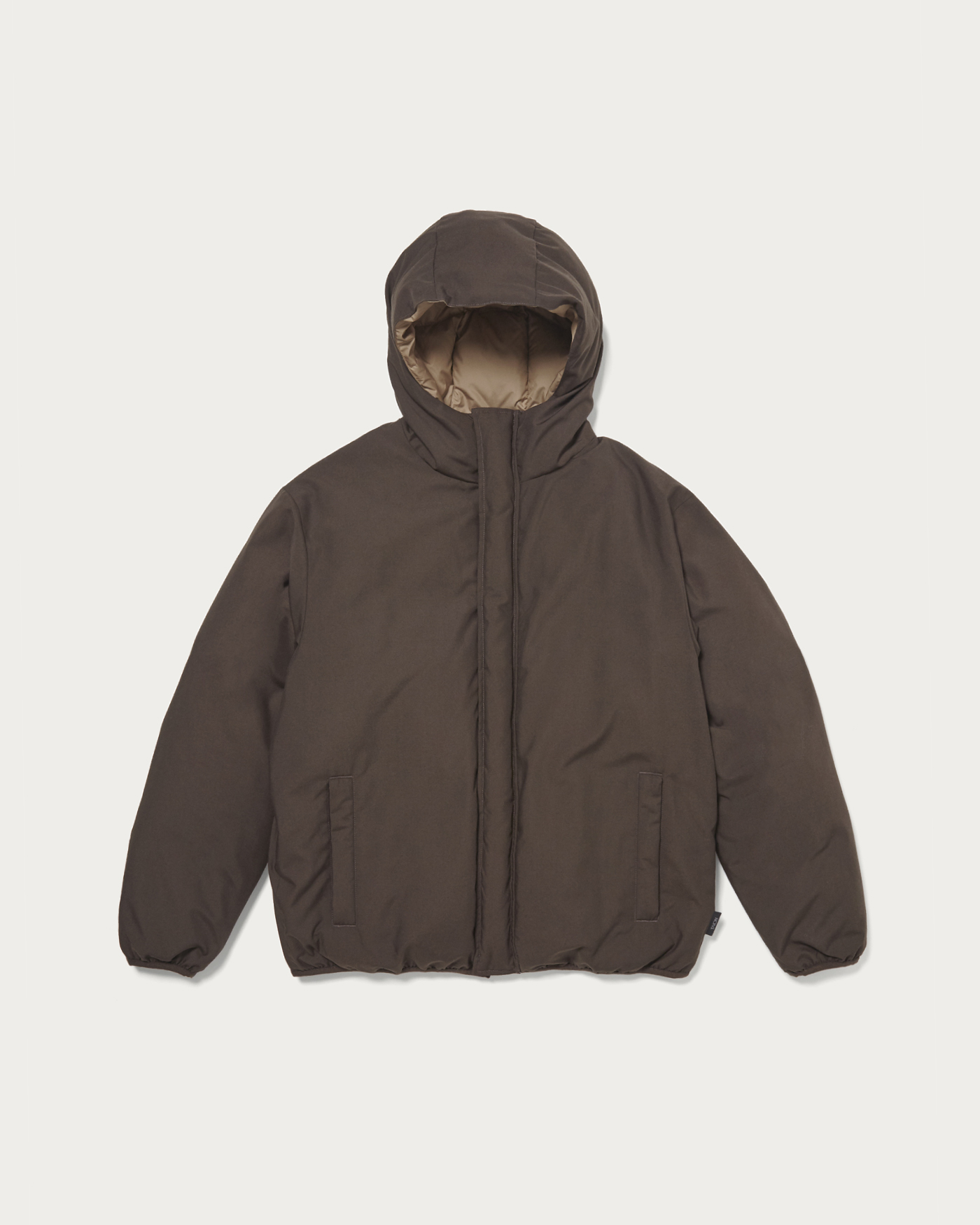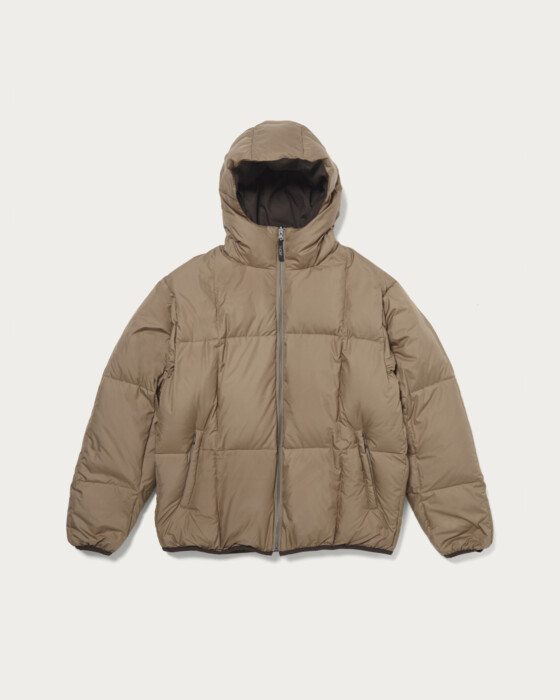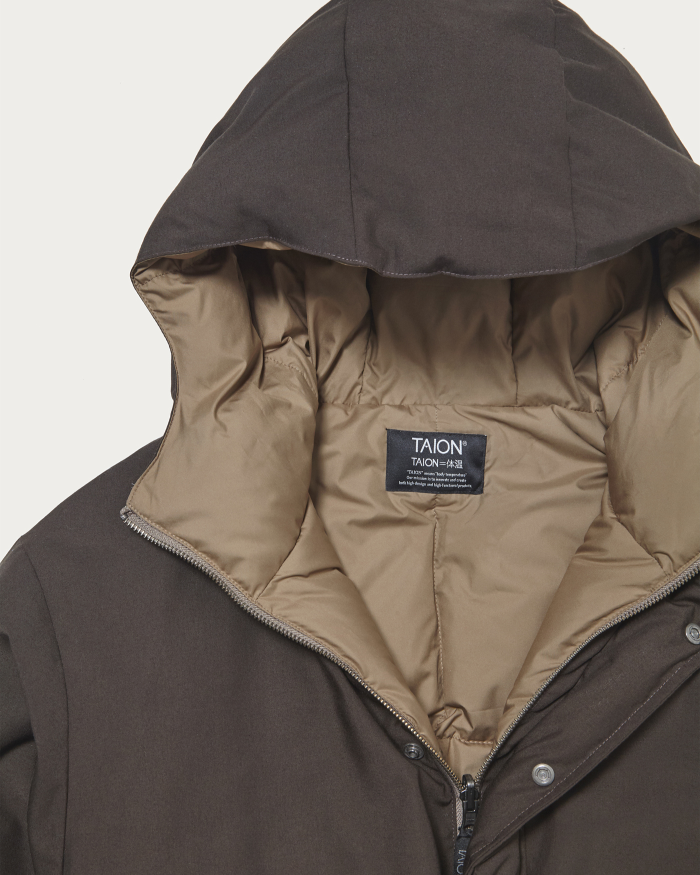〈TAION(タイオン)〉との別注企画。型も別注で、高コスパダウンの快適さとグリーンレーベル リラクシングのキレイめカジュアルを融合。リバーシブル仕様で、上品な表情のT/R素材を楽しめる。定番ブラックに加え、今期トレンドカラーのブラウンも展開。程よく薄手の生地としっかりしたダウン量のバランスで、軽やかさと真冬の暖かさを両立。