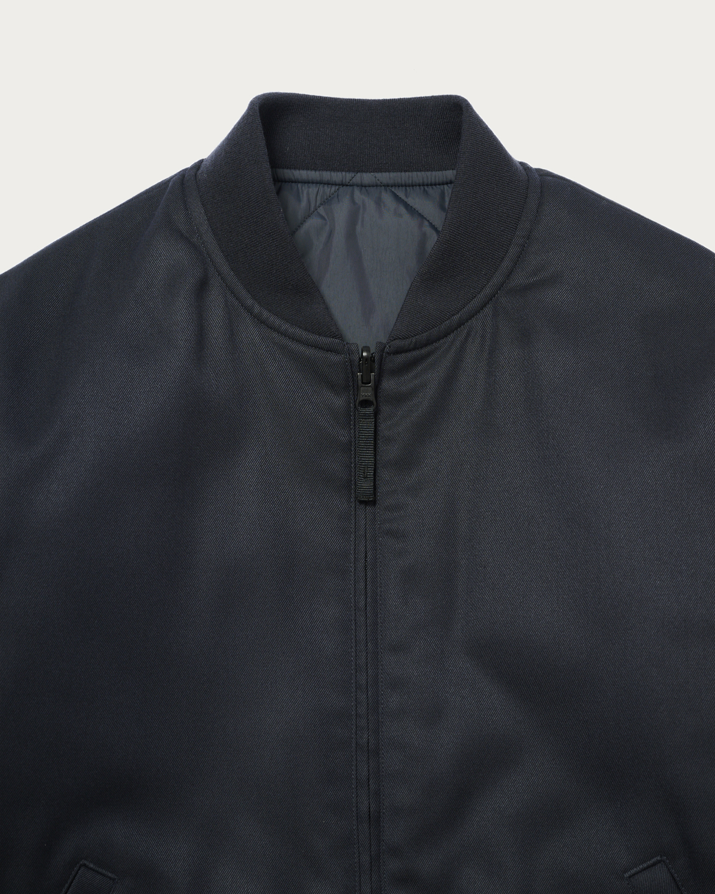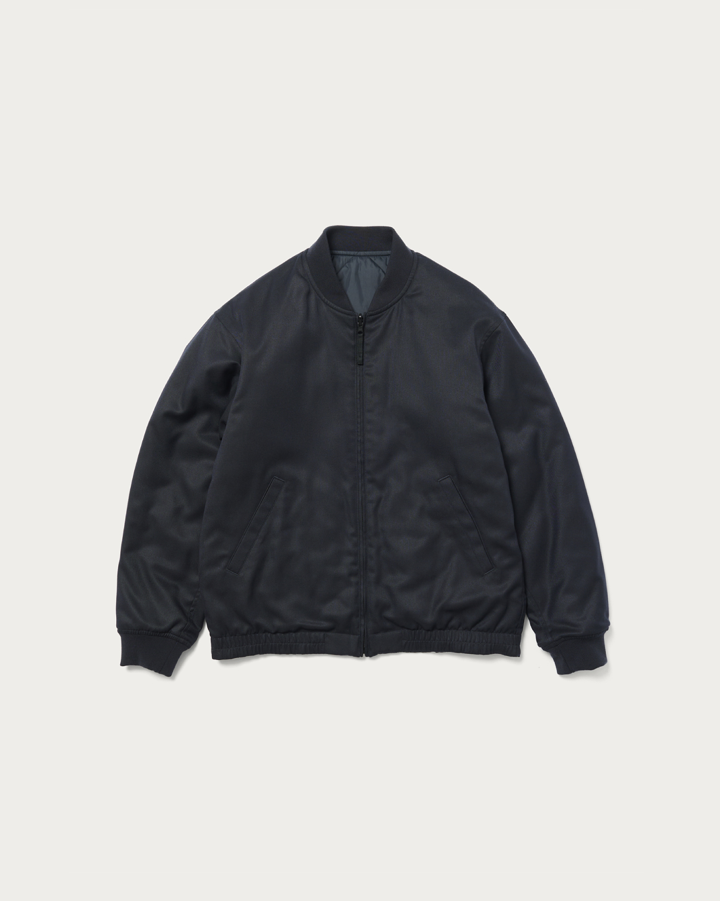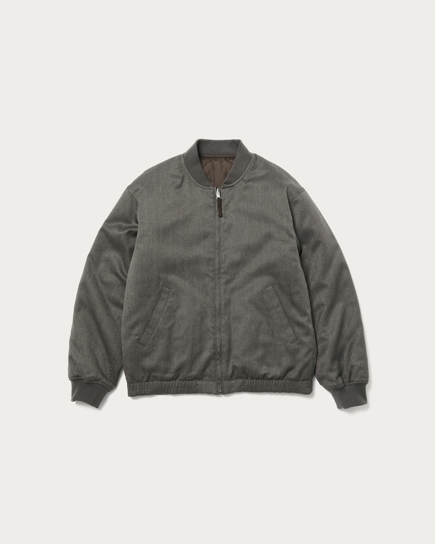 表が滑らかな表面で上品な光沢感の梳毛調素材、裏が光沢がありハリのあるナイロンタフタ素材のリバーシブルブルゾン。裾はリブ仕様ではないため、インナーを選ばず自然なレイヤードスタイルが楽しめる一着。カジュアルにもきれいめにも対応でき、デニムやスウェットとの相性も抜群。