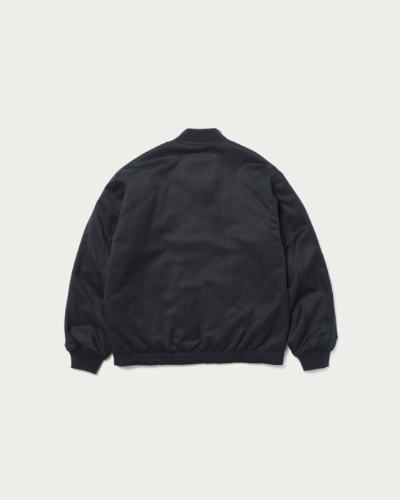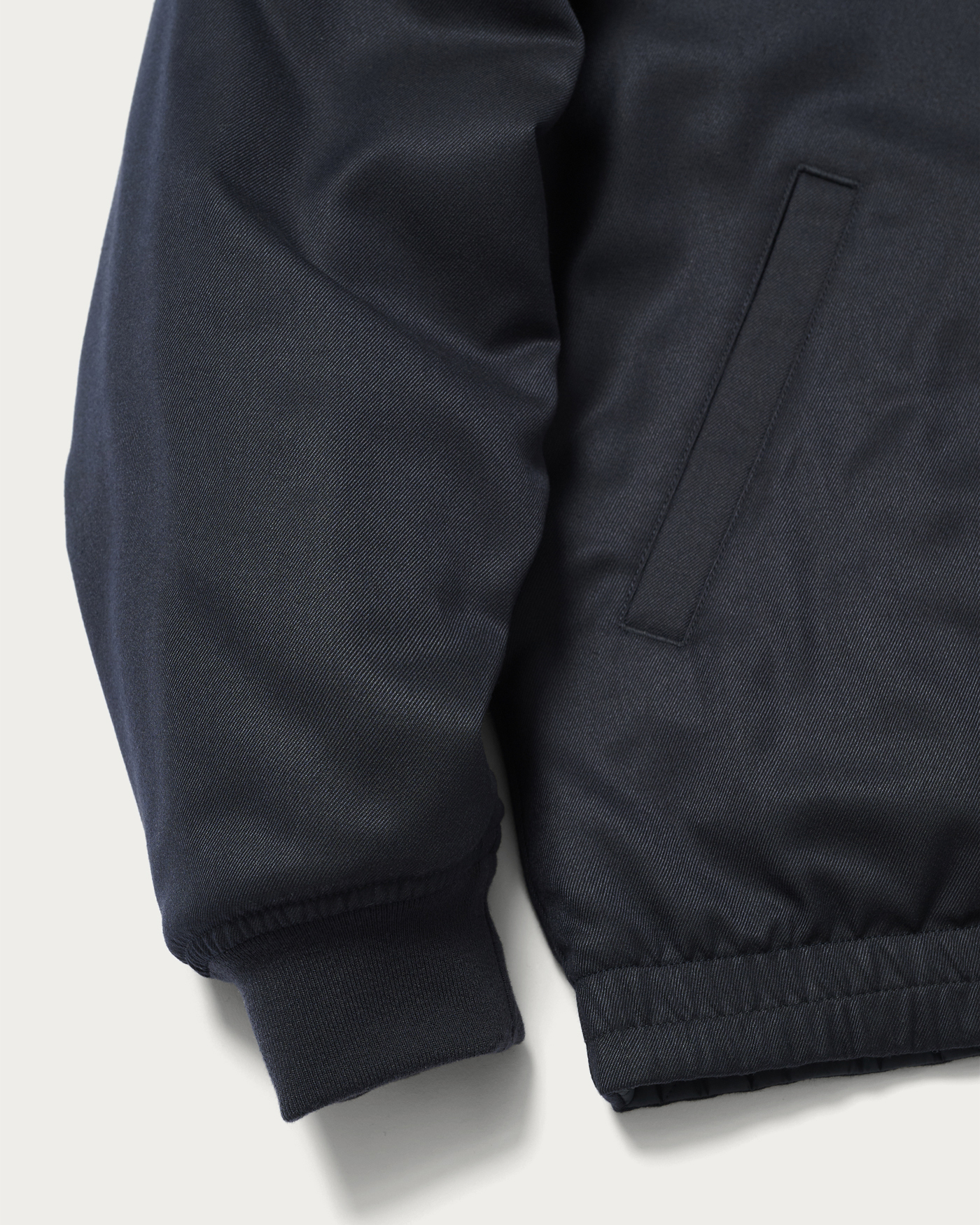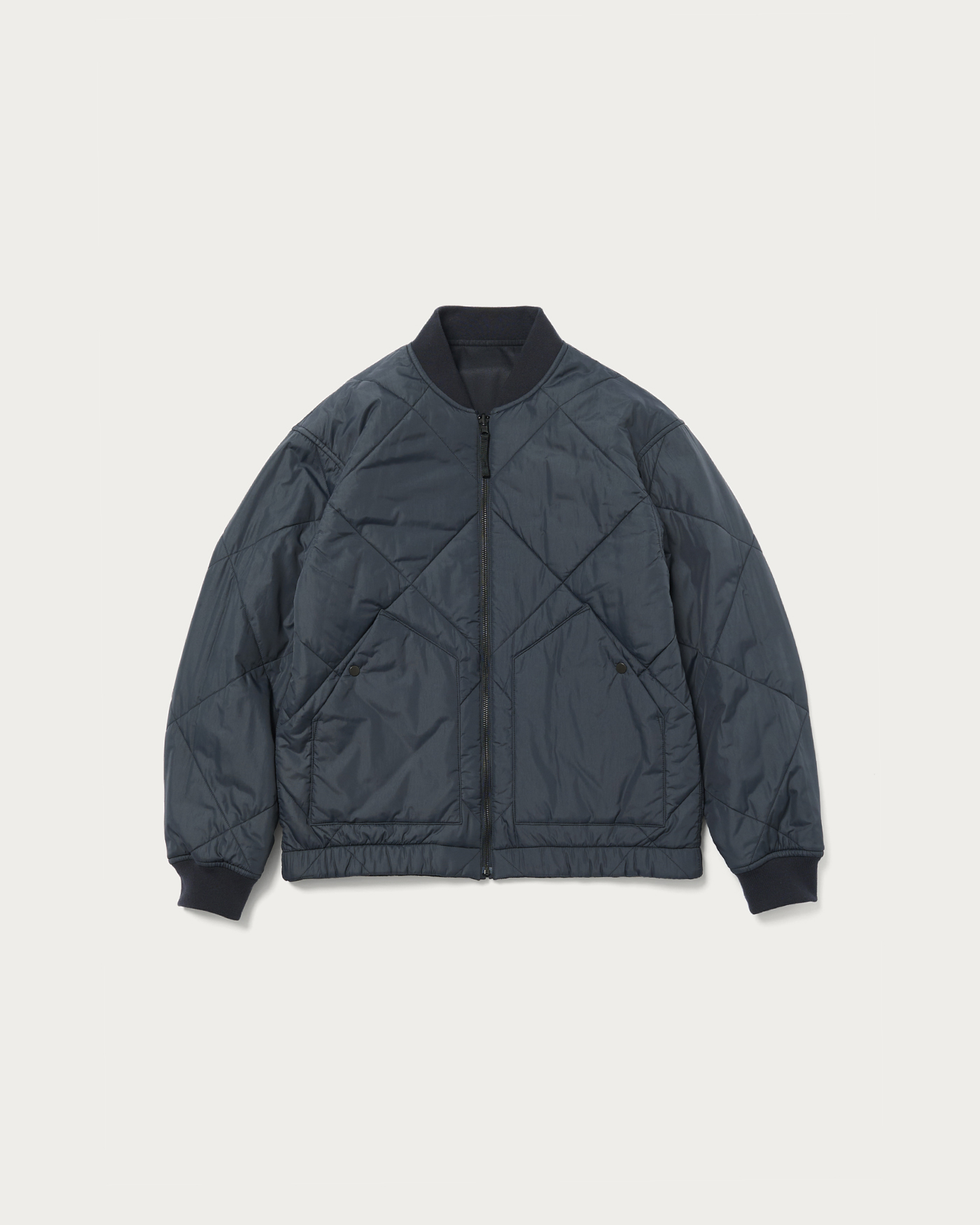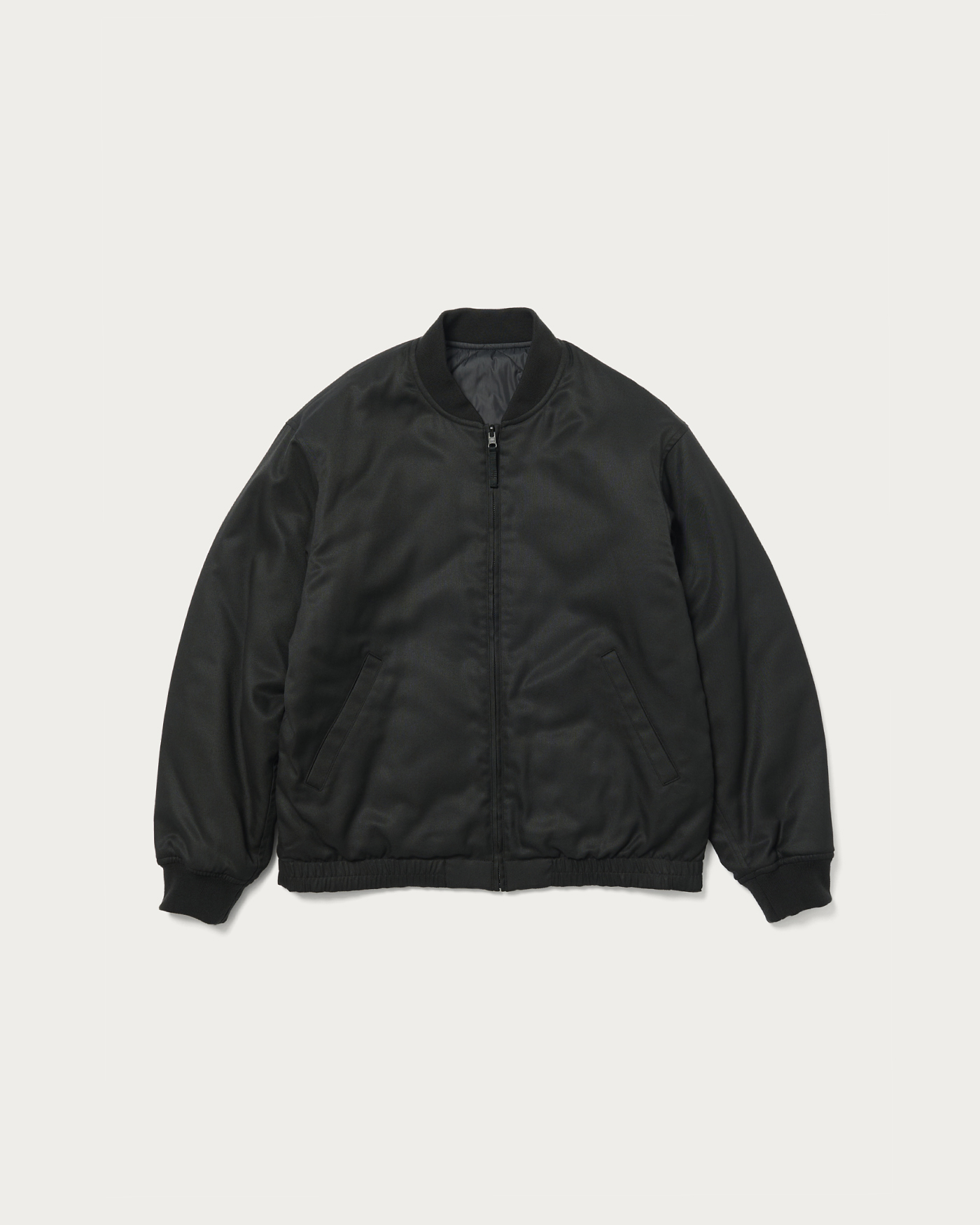 表が滑らかな表面で上品な光沢感の梳毛調素材、裏が光沢がありハリのあるナイロンタフタ素材のリバーシブルブルゾン。裾はリブ仕様ではないため、インナーを選ばず自然なレイヤードスタイルが楽しめる一着。カジュアルにもきれいめにも対応でき、デニムやスウェットとの相性も抜群。