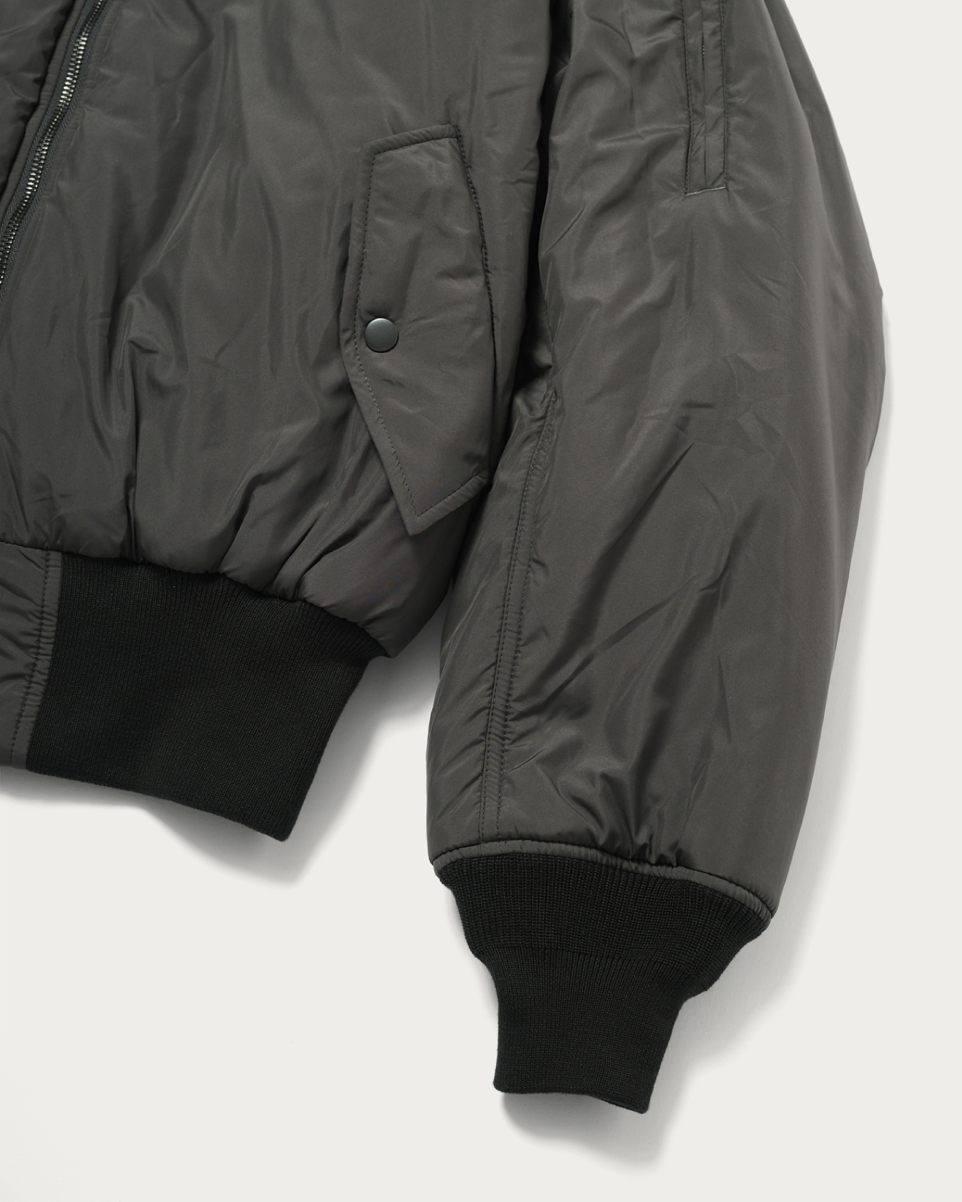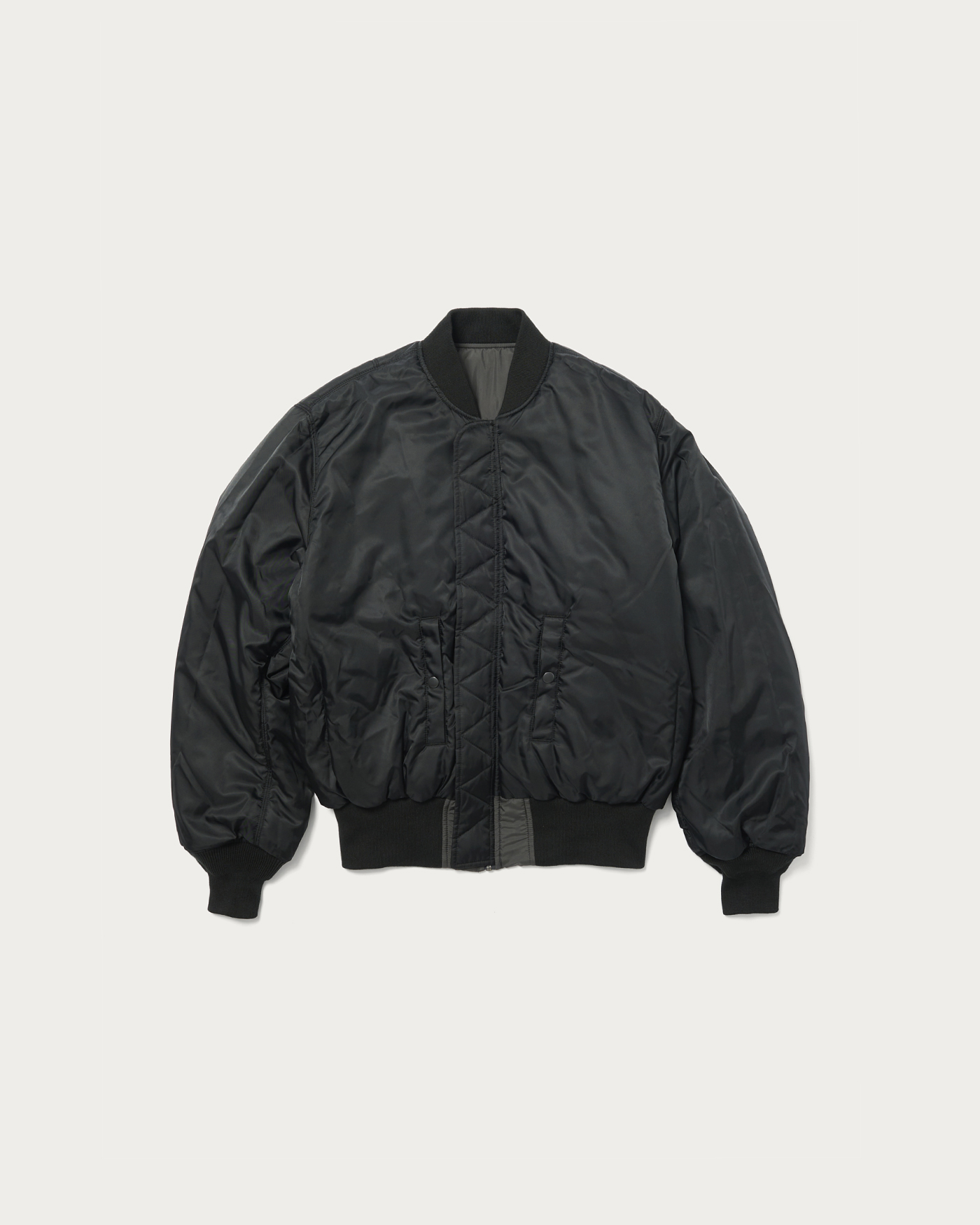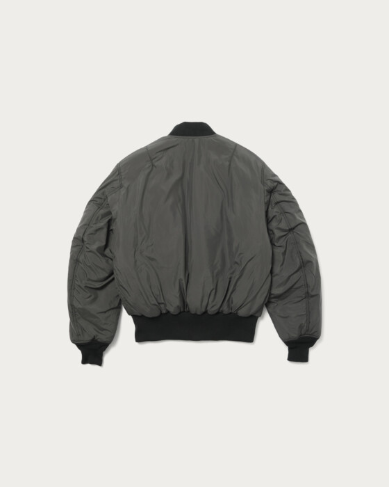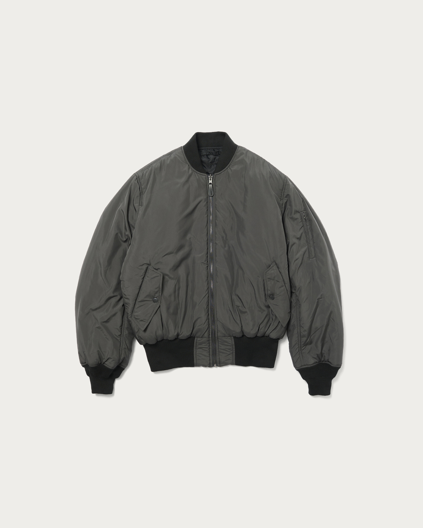 〈ALPHA(アルファ)〉との別注企画。大人仕様のクリーンなMA-1ジャケット。定番ツイル素材ではなく、ソフトなタッチの合成素材に置き換えることで、きれいめで洗練された印象にアレンジ。シガレットポケットやファスナーを簡素化・サイズダウンし、品のある仕上がりに。カジュアルになりすぎず、大人の着こなしに最適な一着。