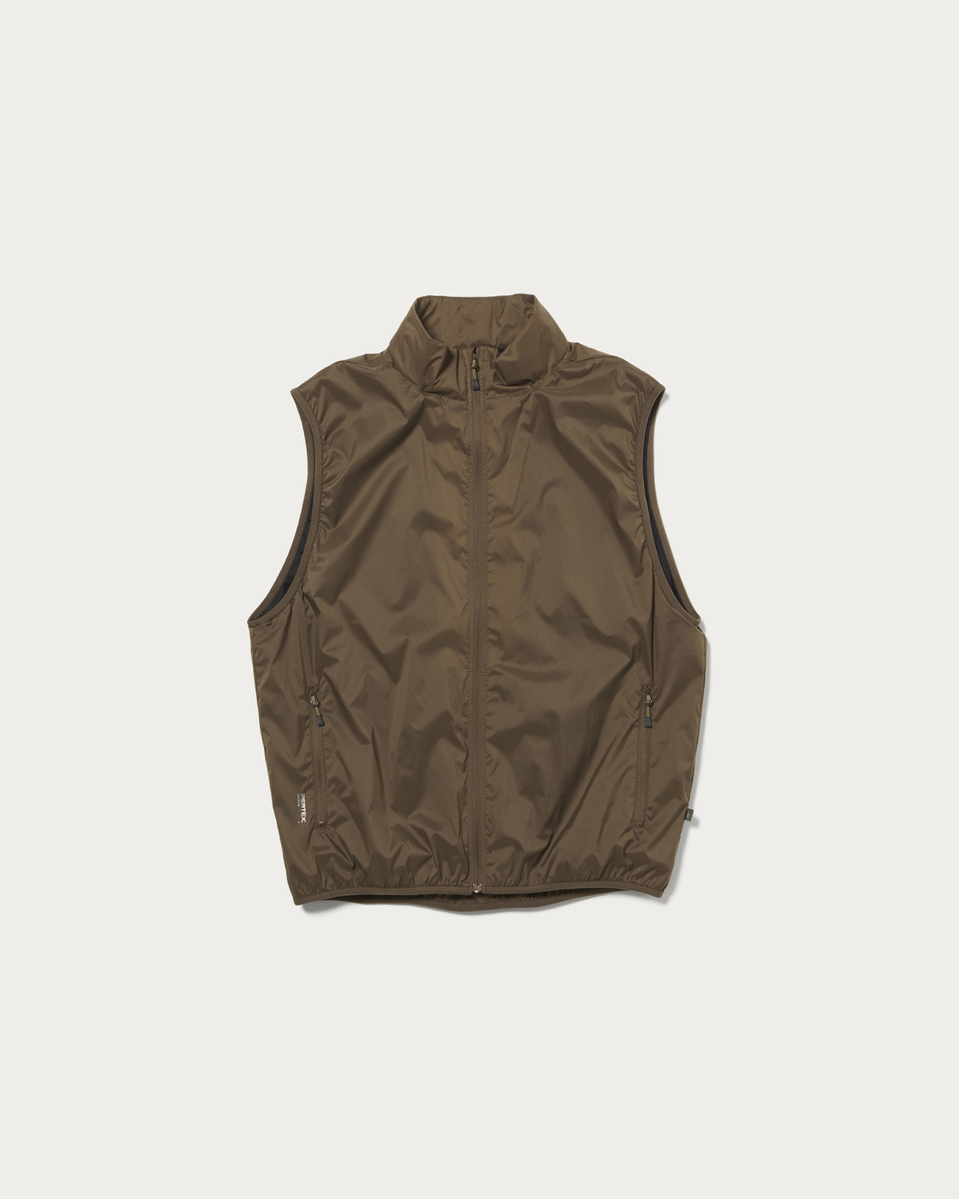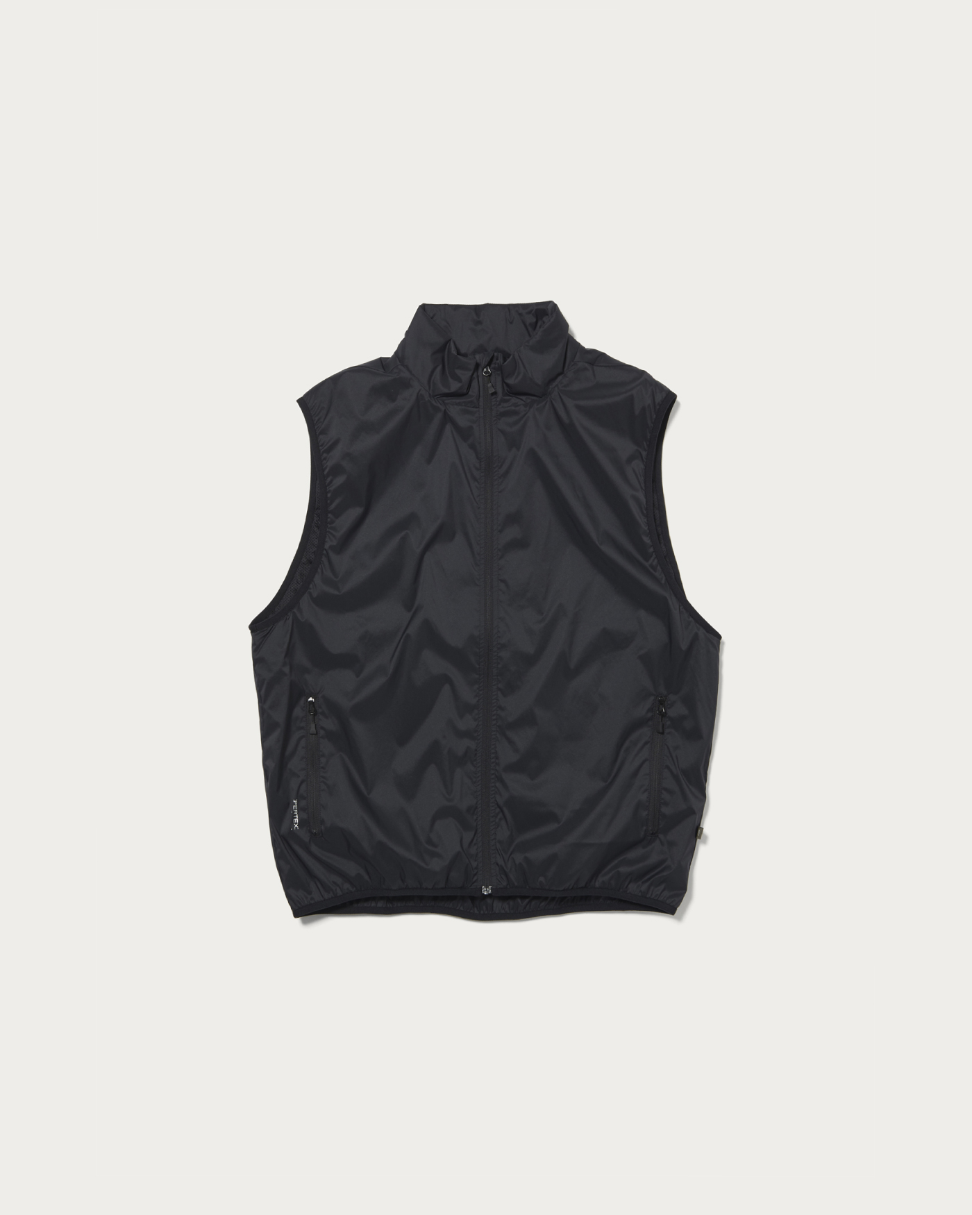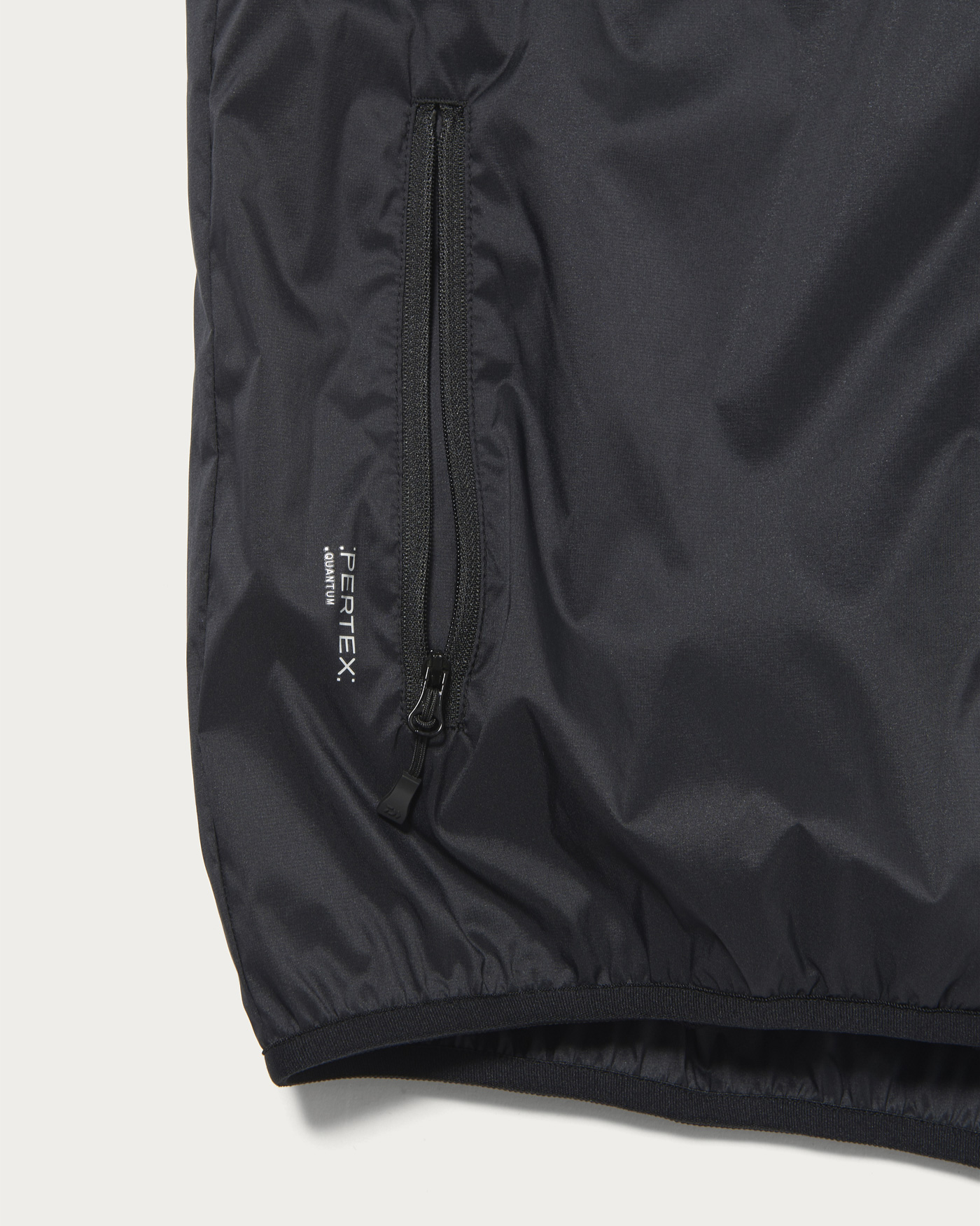 冷たい風や小雨、汚れから身を守るライトウェイトベスト。旅行にも便利です。表地には撥水・防風性を備えたPERTEX® Quantumを使用し、裏地は中綿と一体化した軽量トリコット素材。中空糸の特殊構造が多くのデッドエアを含み、軽量ながら高い保温性を実現。同素材ジャケットとのレイヤードもおすすめです。