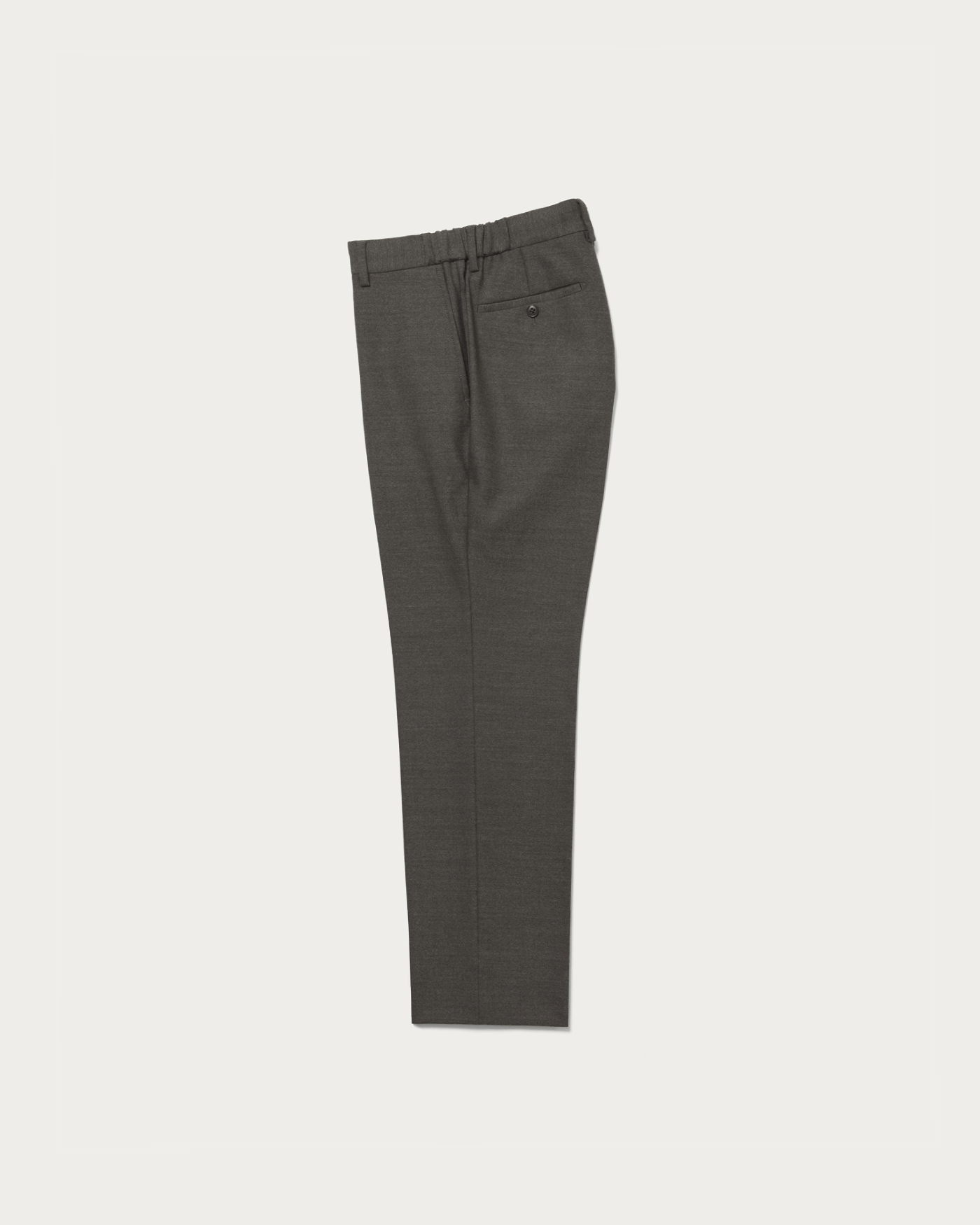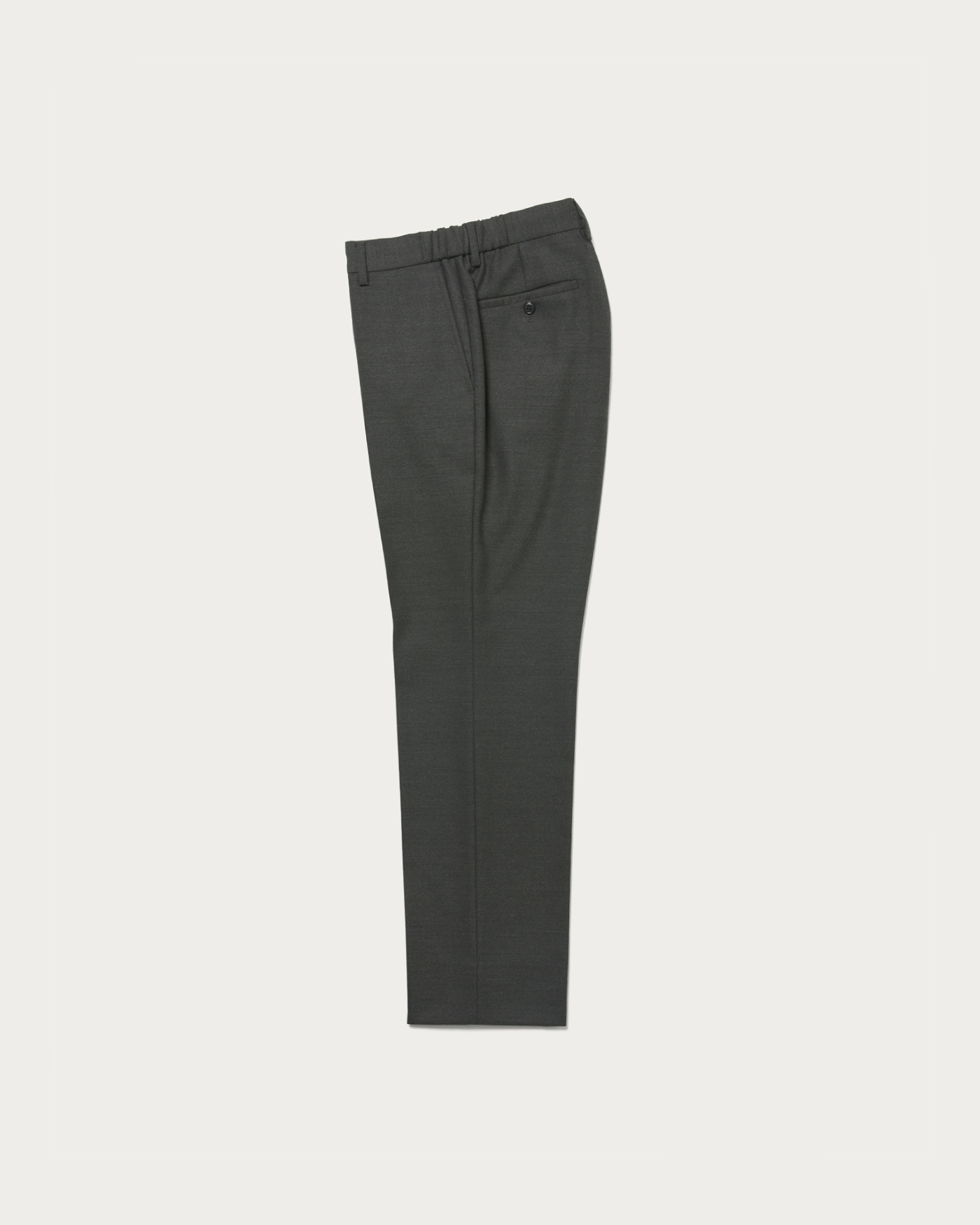 梳毛を使用したホームスパン素材。梳毛ならではのきれいでソフトな風合いが特徴で、同素材ジャケットとのセットアップはもちろん、単品スラックスとしても活躍。スタンダードシルエットにウエスト脇シャーリング仕様とドローコードを備え、快適な穿き心地ときれいなシルエットを両立。ビジネスからカジュアルまで幅広く対応する一本。