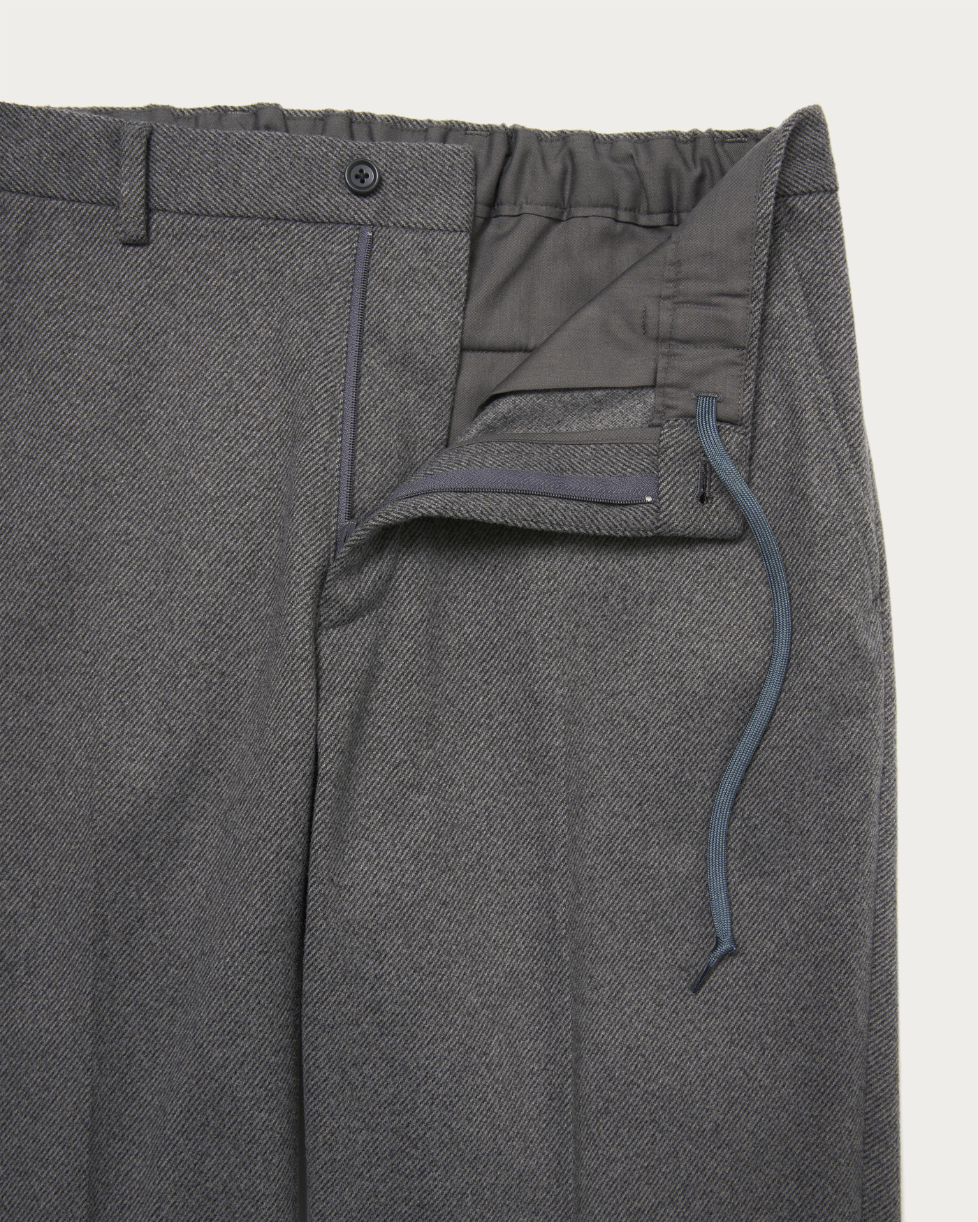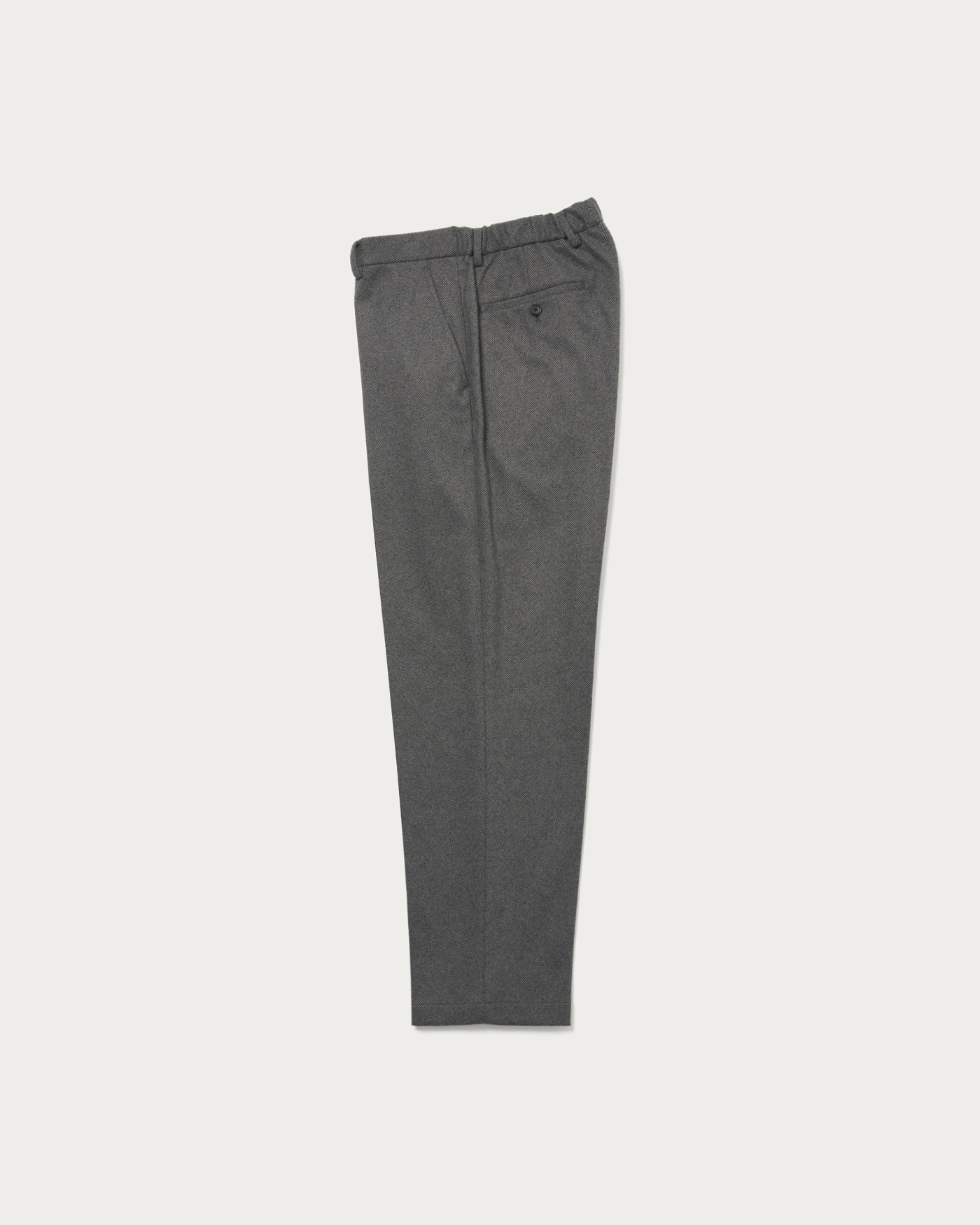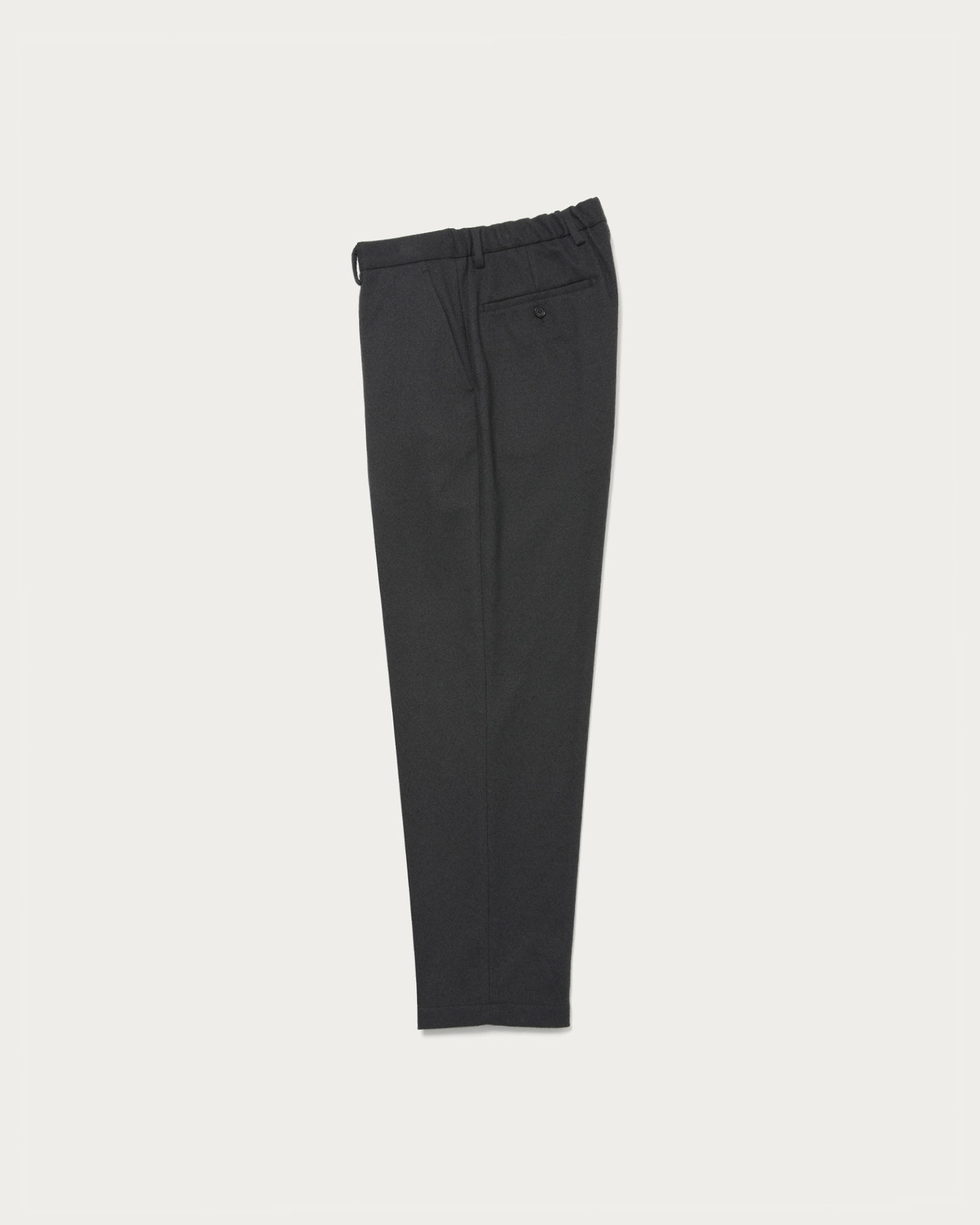 秋冬のワンダークロスシリーズ。色の濃さの異なるポリエステル糸を組み合わせて織り、深みのある表情を実現。さらに起毛加工で毛並みを整え、ウールのような高級感のある素材に仕上げた。程よく太めのシルエットから裾に向けて自然にテーパードし、品よく上品に穿ける一本。