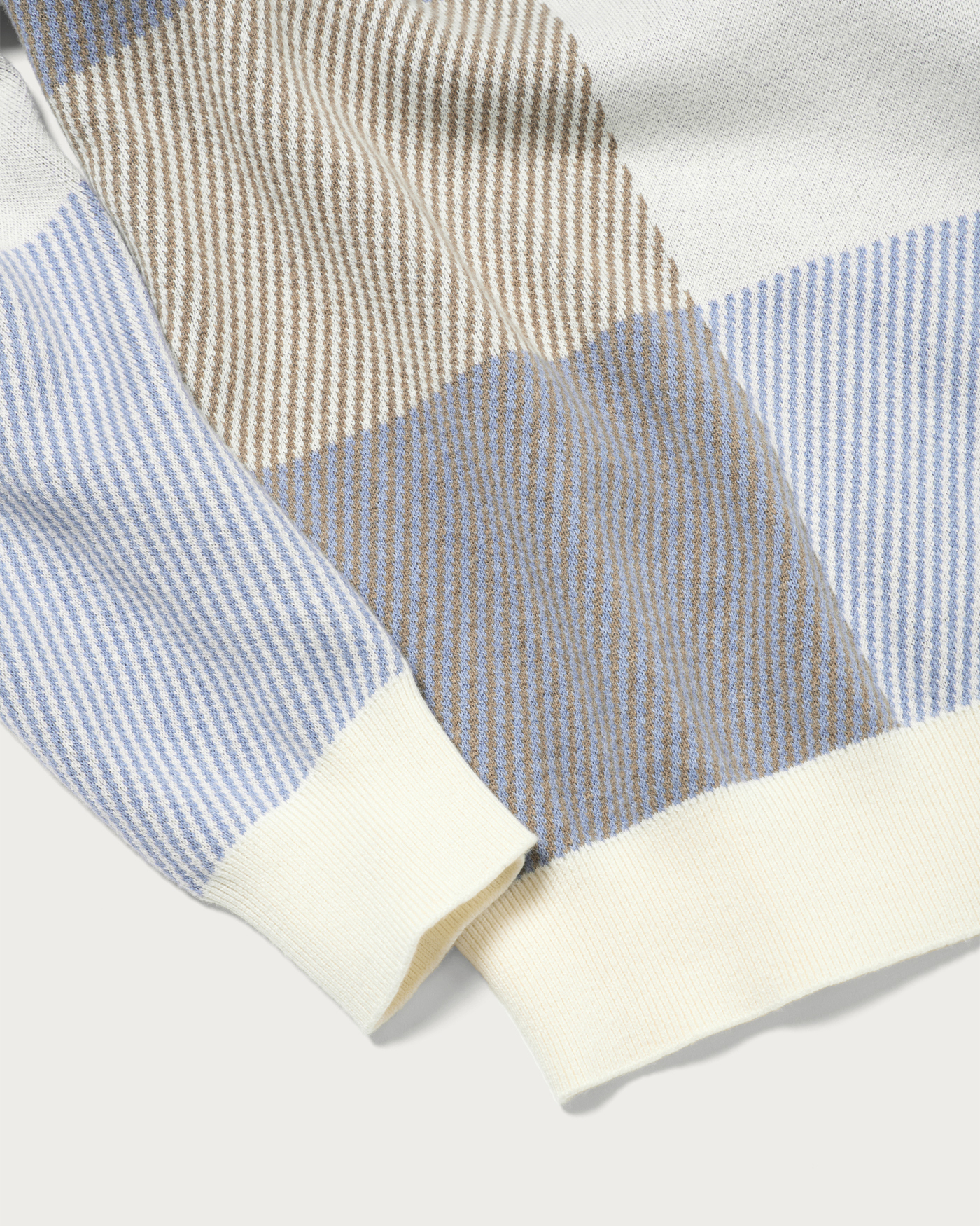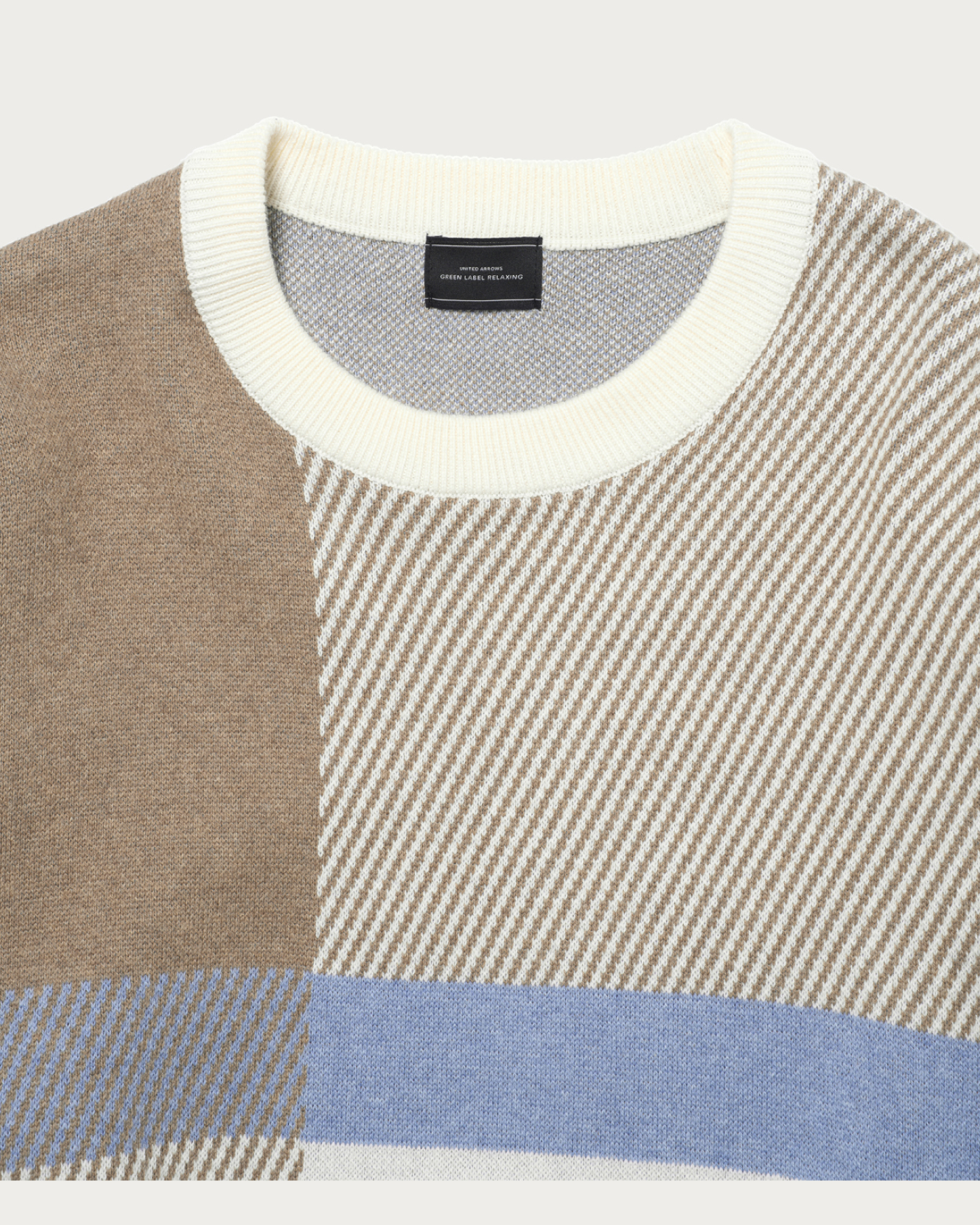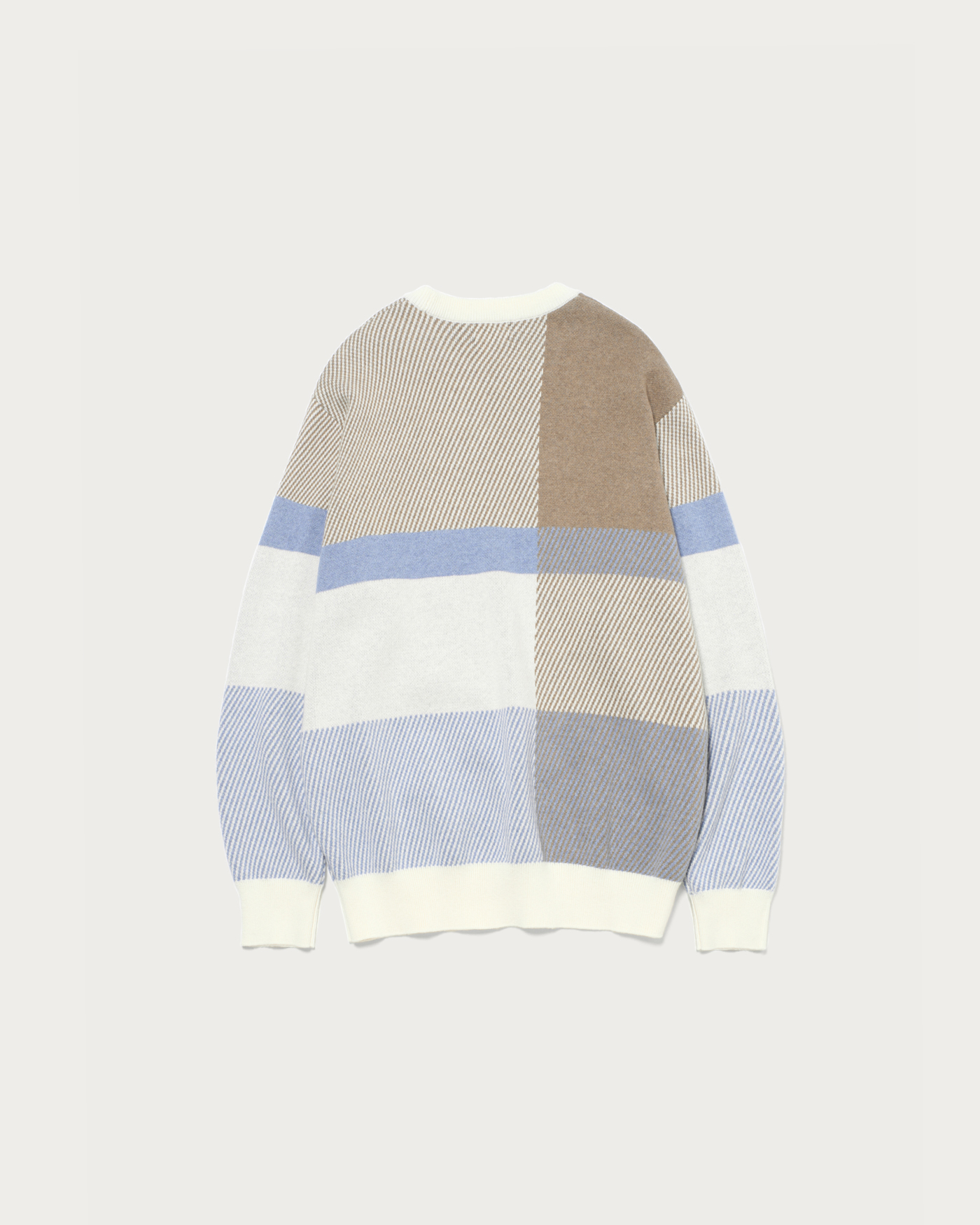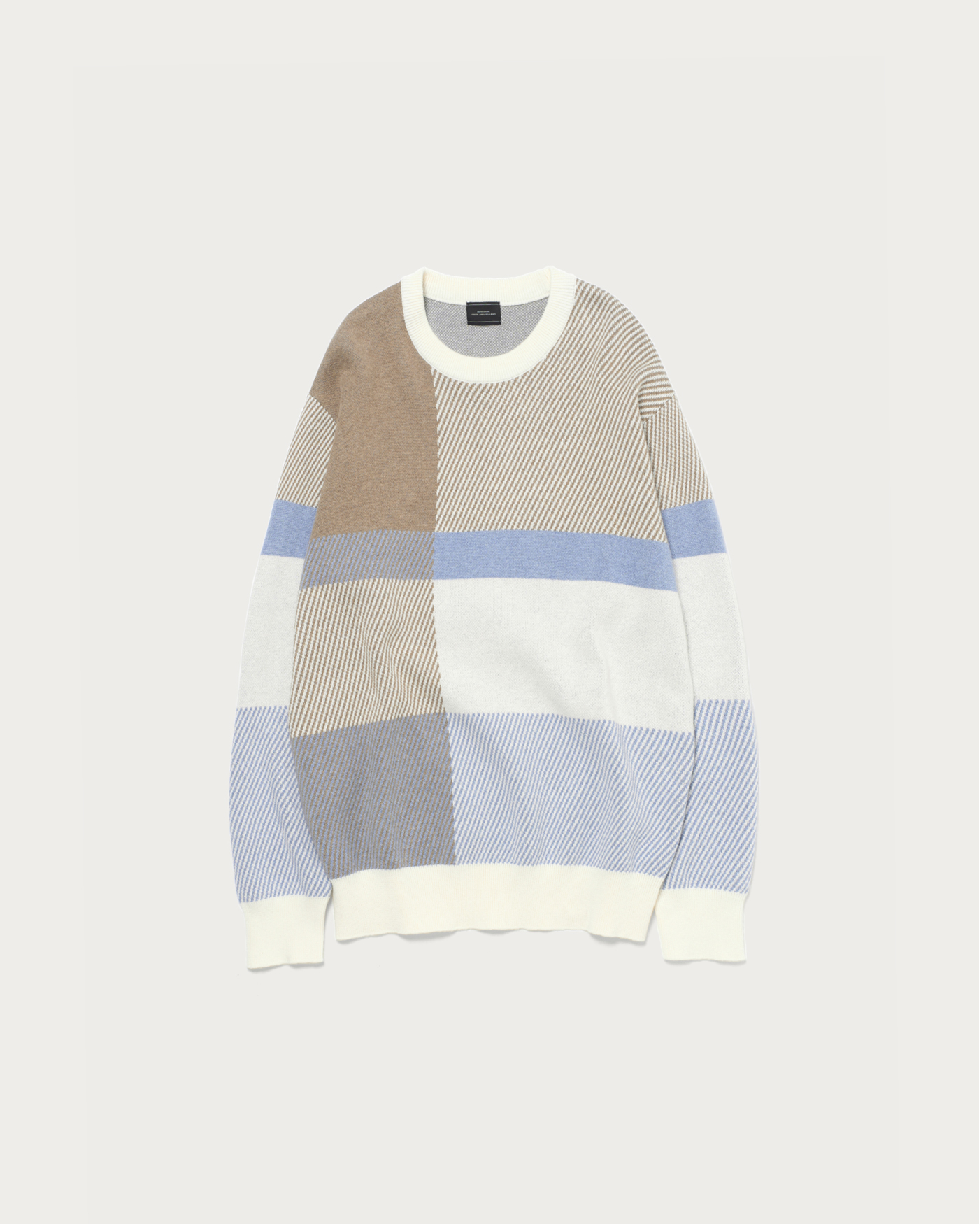 大きめのブロック柄をジャカード編みで表現。コットンベースの糸を使い、ほどよく膨らみがあり、やわらかな肌触りが特徴。着用シーズンが長く、一枚着でもサマになり、コートのインナーとしても活躍。ギフトにも最適な一枚。