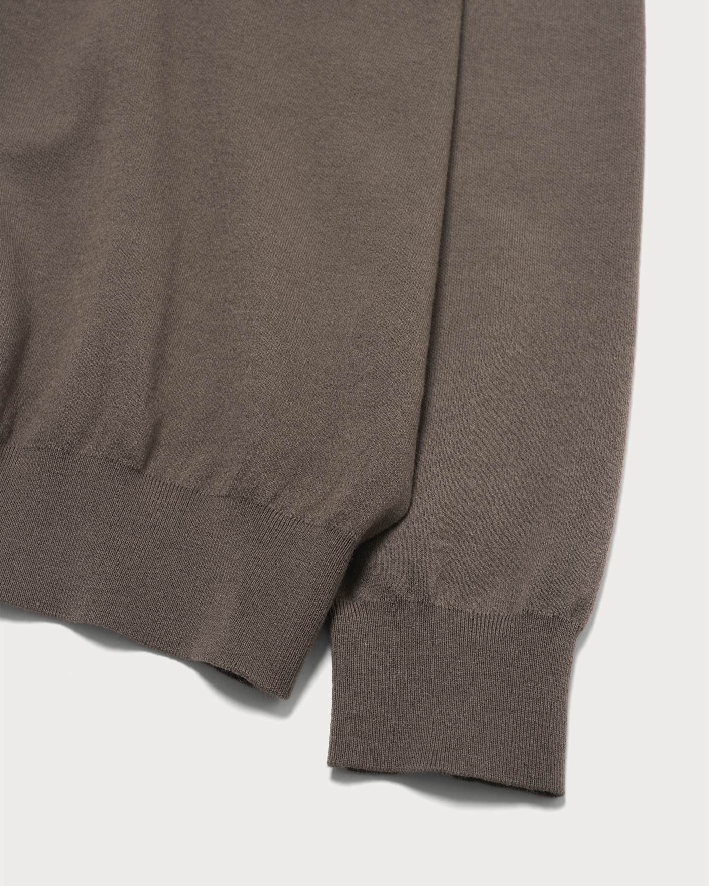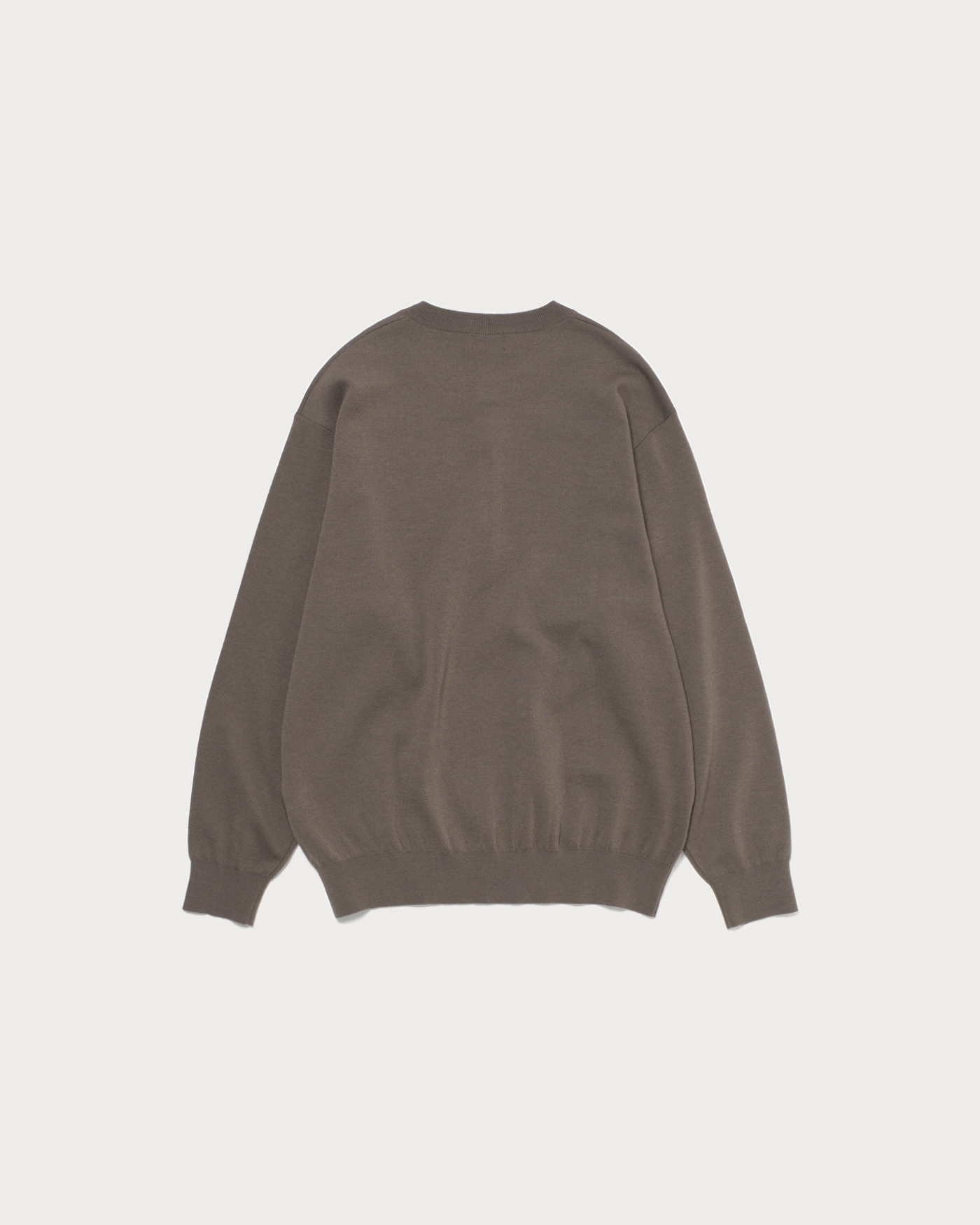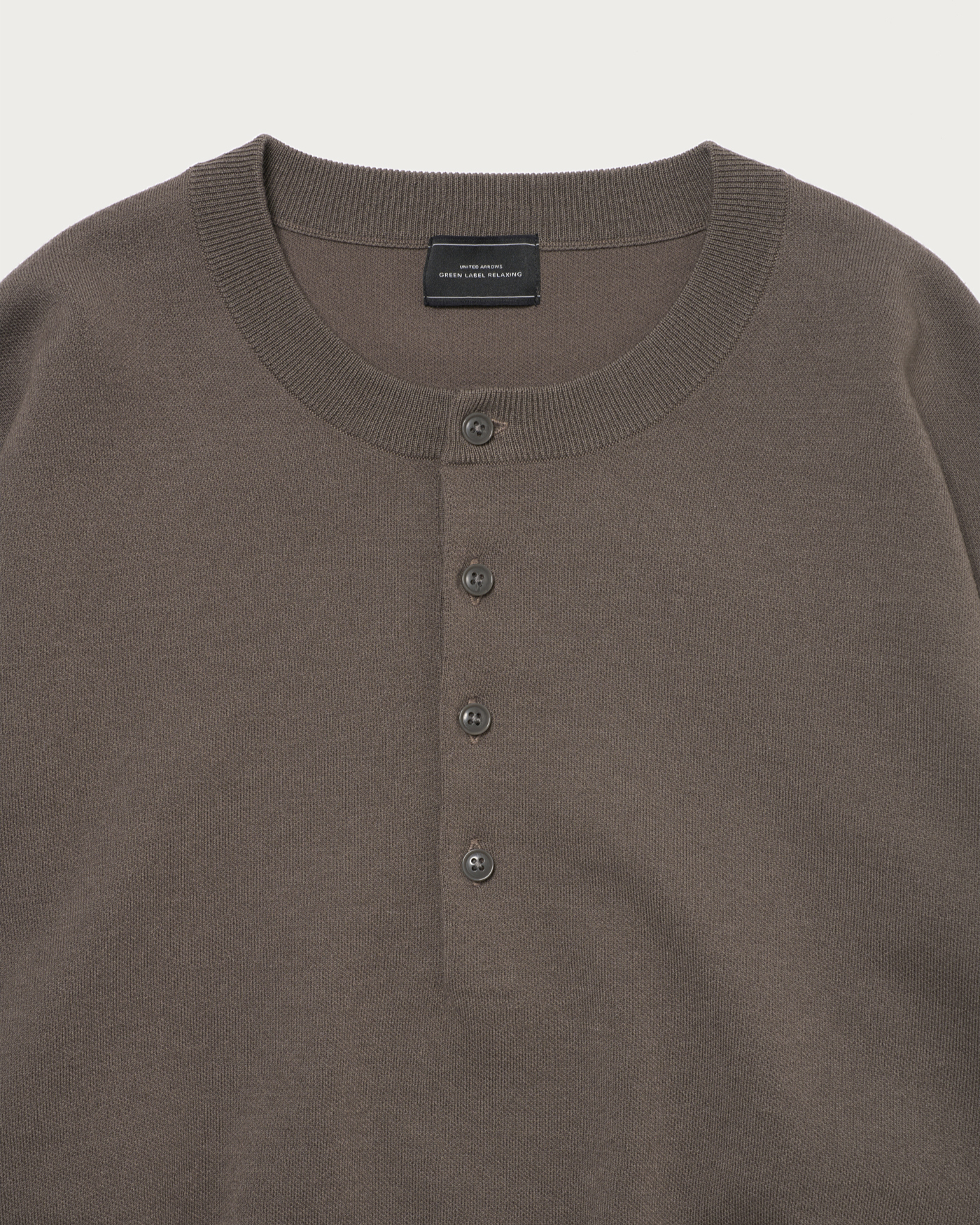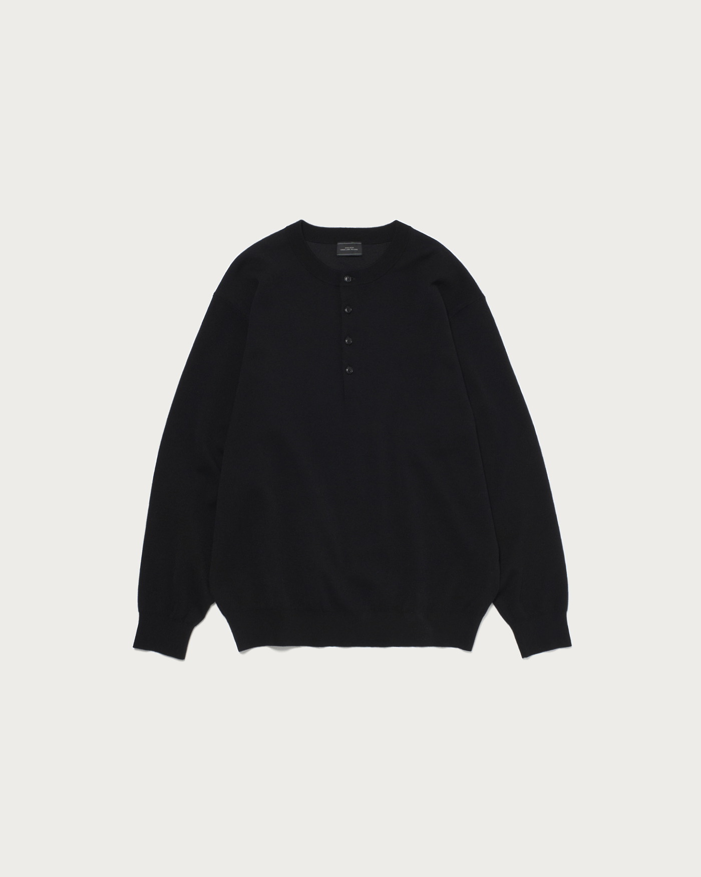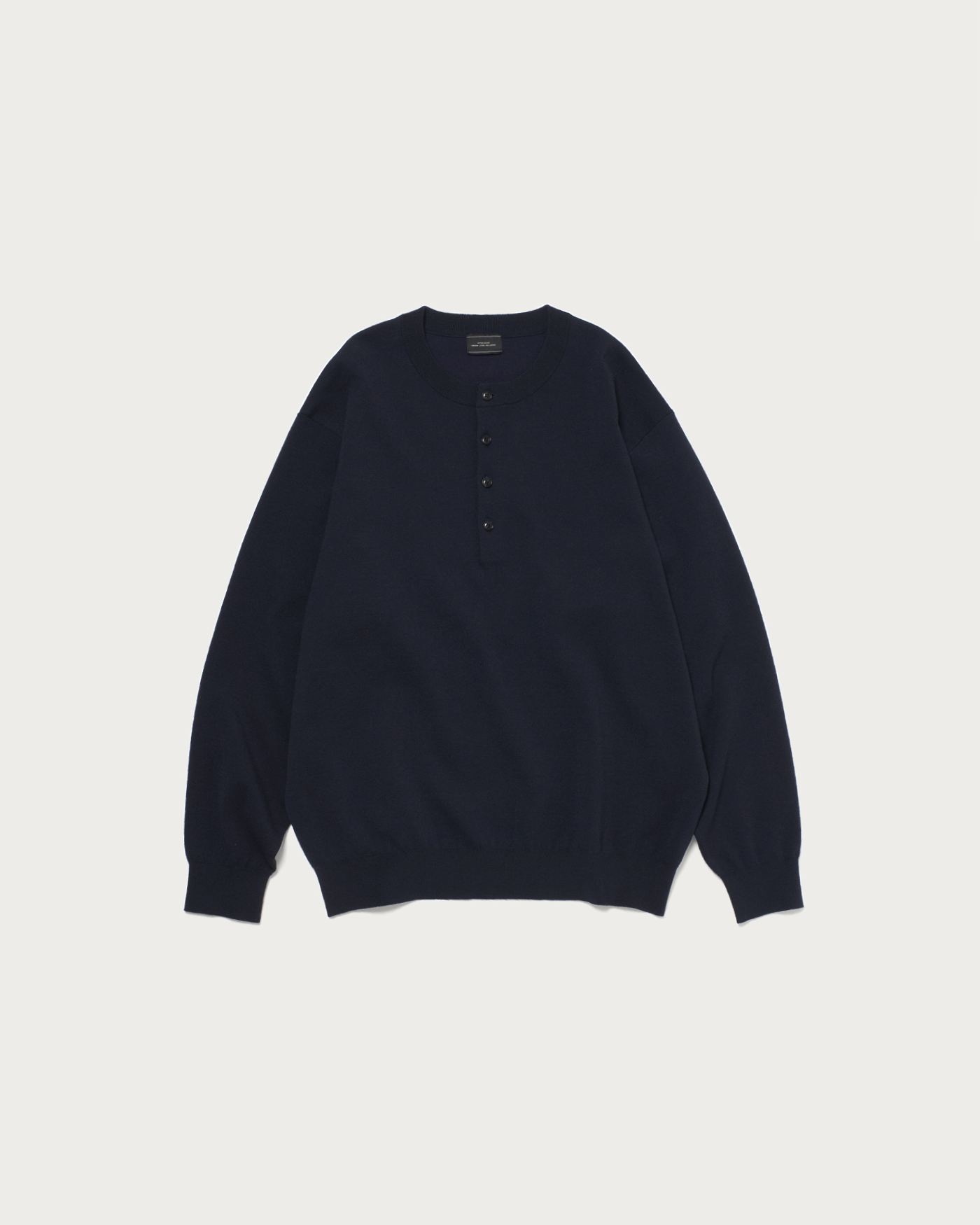深めのヘンリーネックがアクセントとなるデザイン。程よくゆとりを持たせたシルエットで快適な着心地。表側はウールの微強撚糸、裏側はポリエステル糸を使用したダブルフェイス編みで、ウールの上品な表情にポリエステルの安定感と滑らかな着用感をプラス。