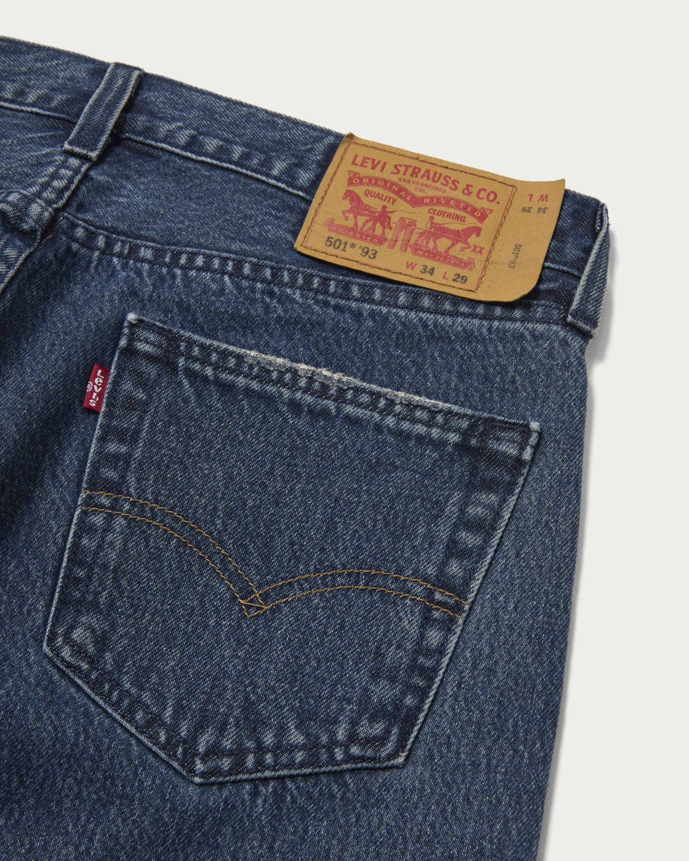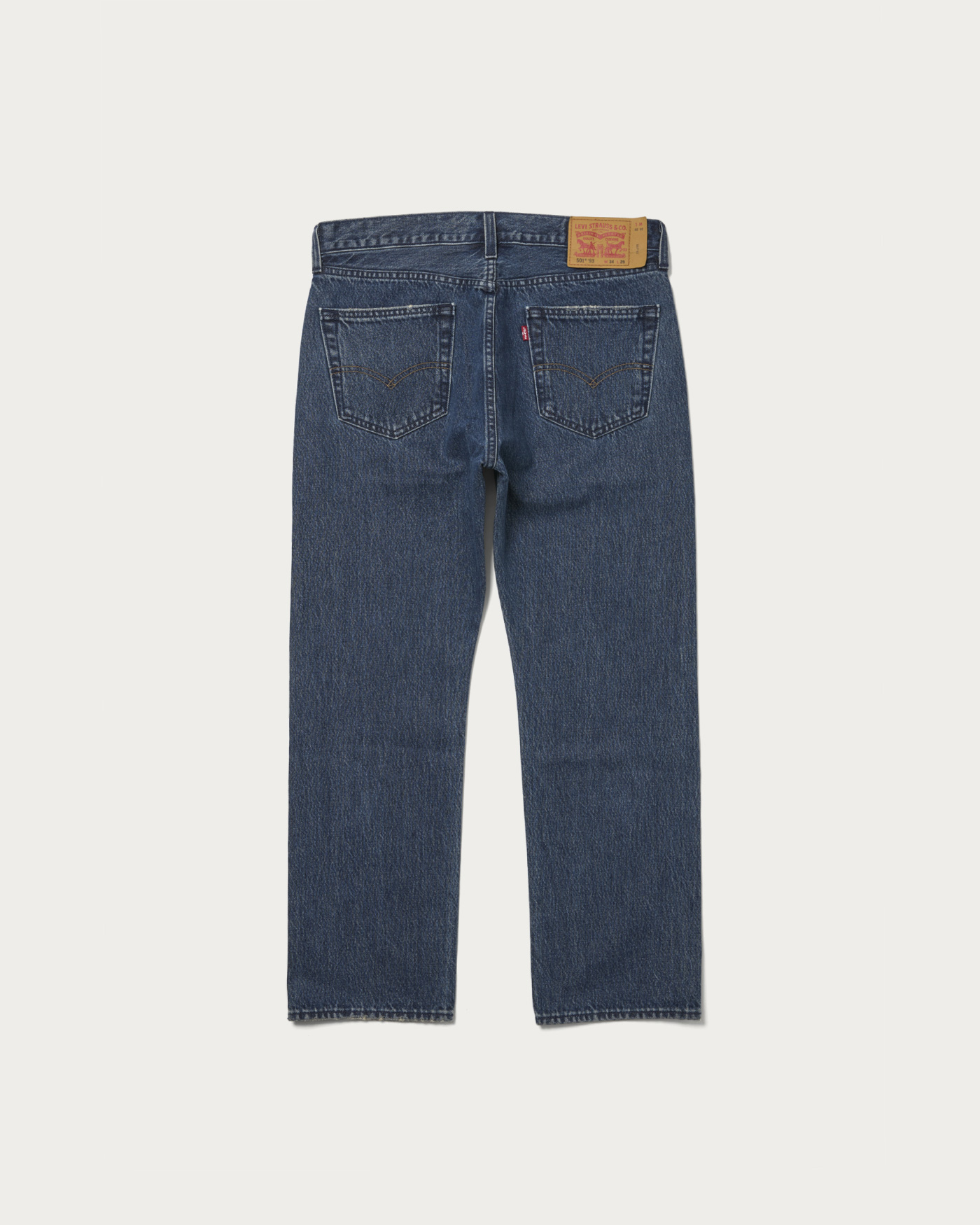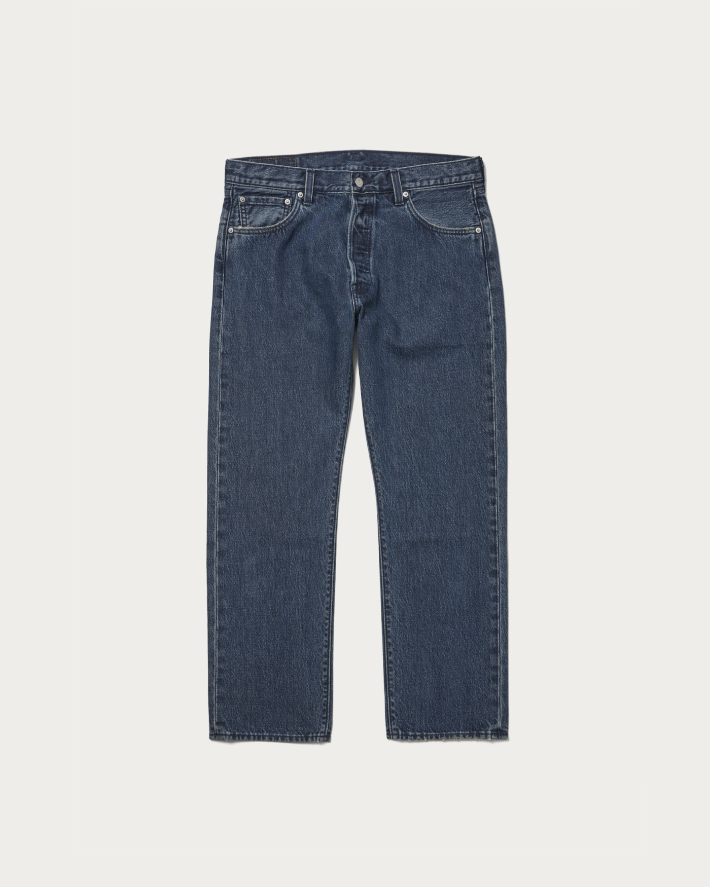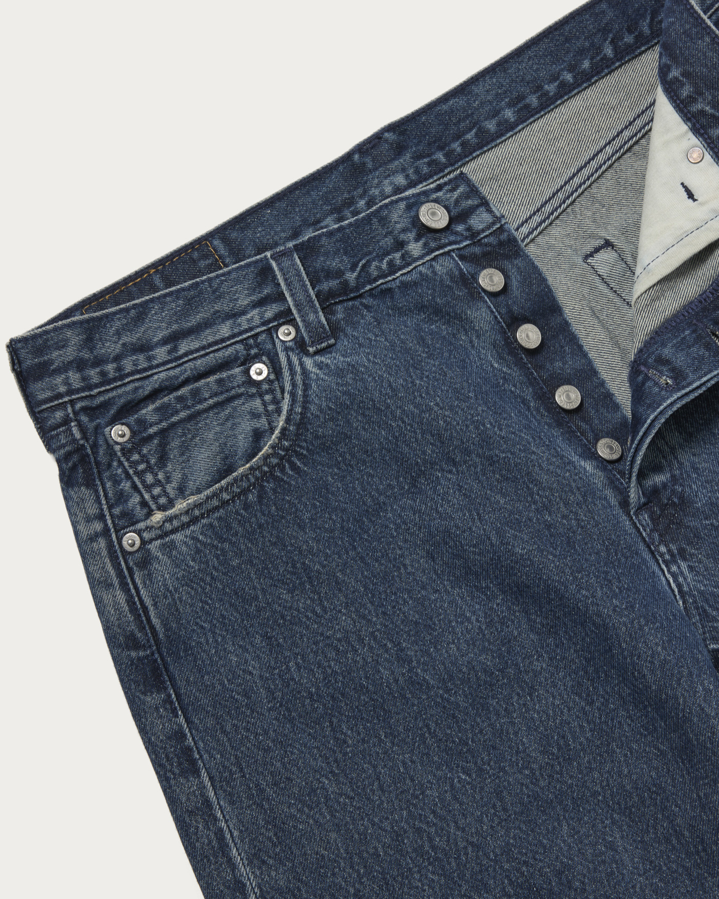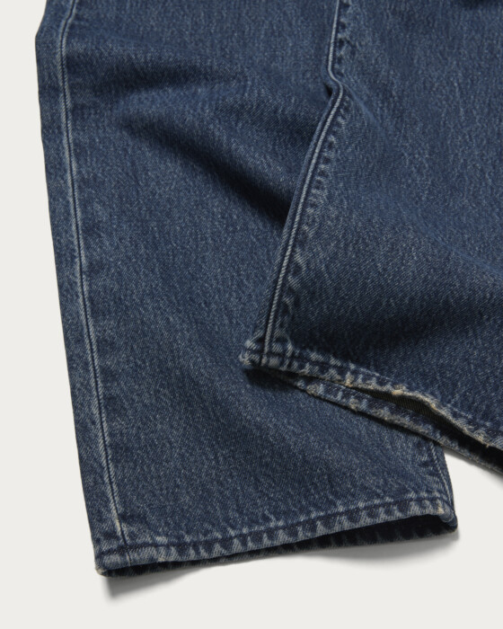 別注第三弾となる濃いめブルーのジーンズ。ヒゲ加工を控えめにし、バックポケットのアーキュエイト以外はトーナル配色のステッチに。シルバーのボタンとリベットで、ジーンズながらもほんのりクリーンな表情が特徴。レングスは29インチで裾を切らずに履けるちょうど良い長さです。