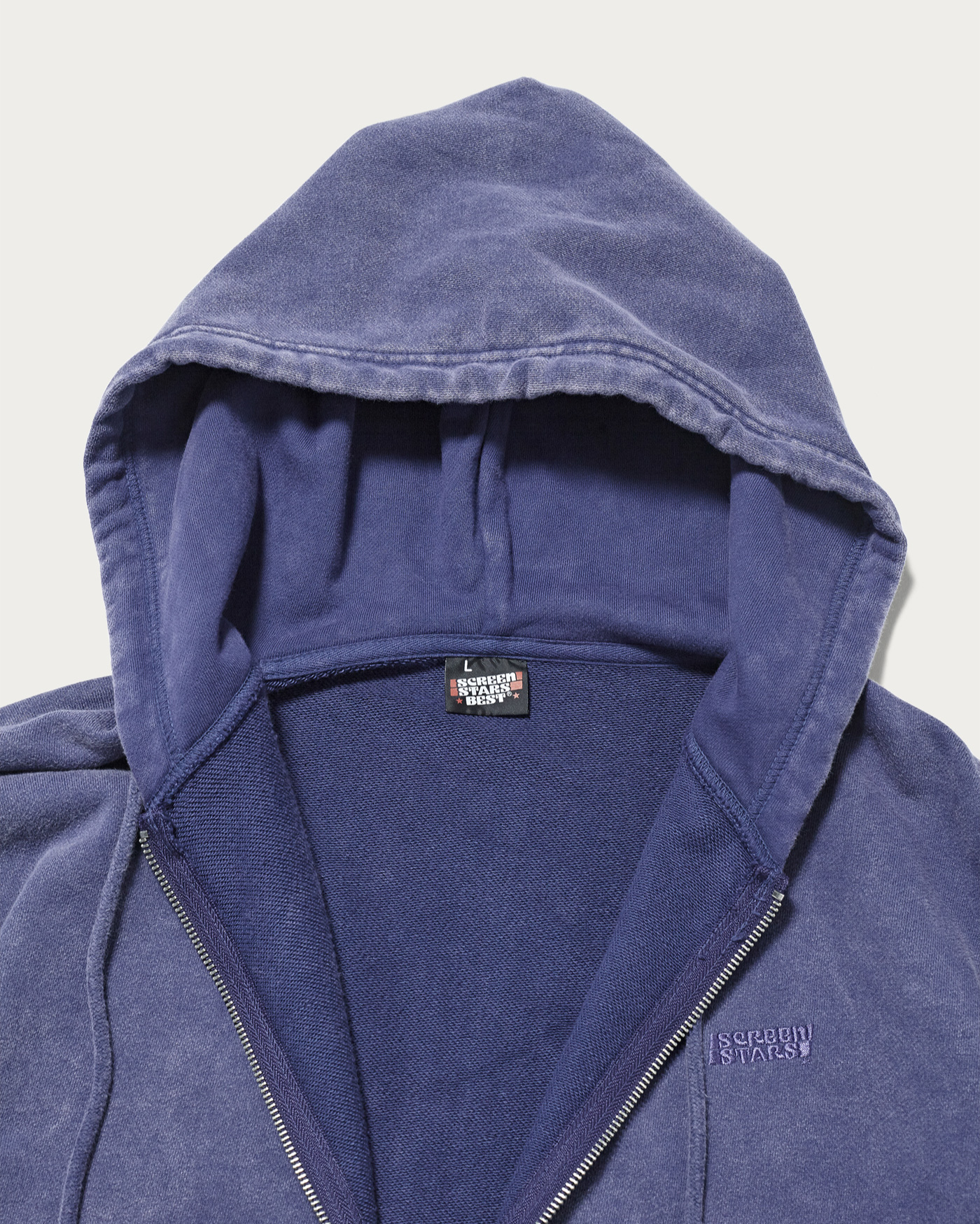 〈スクリーンスターズ〉の別注フーディ。ヴィンテージライクなフェード感が魅力で、クリーンなスタイリングに今っぽさをプラス。暑い時は羽織り、寒い時はアウターのインナーとして活躍する、フルジップ型の便利な一着です。