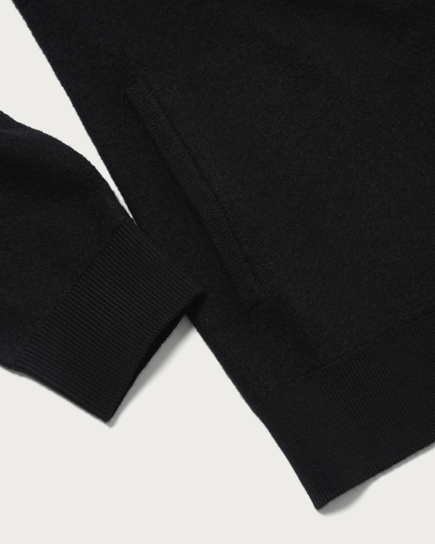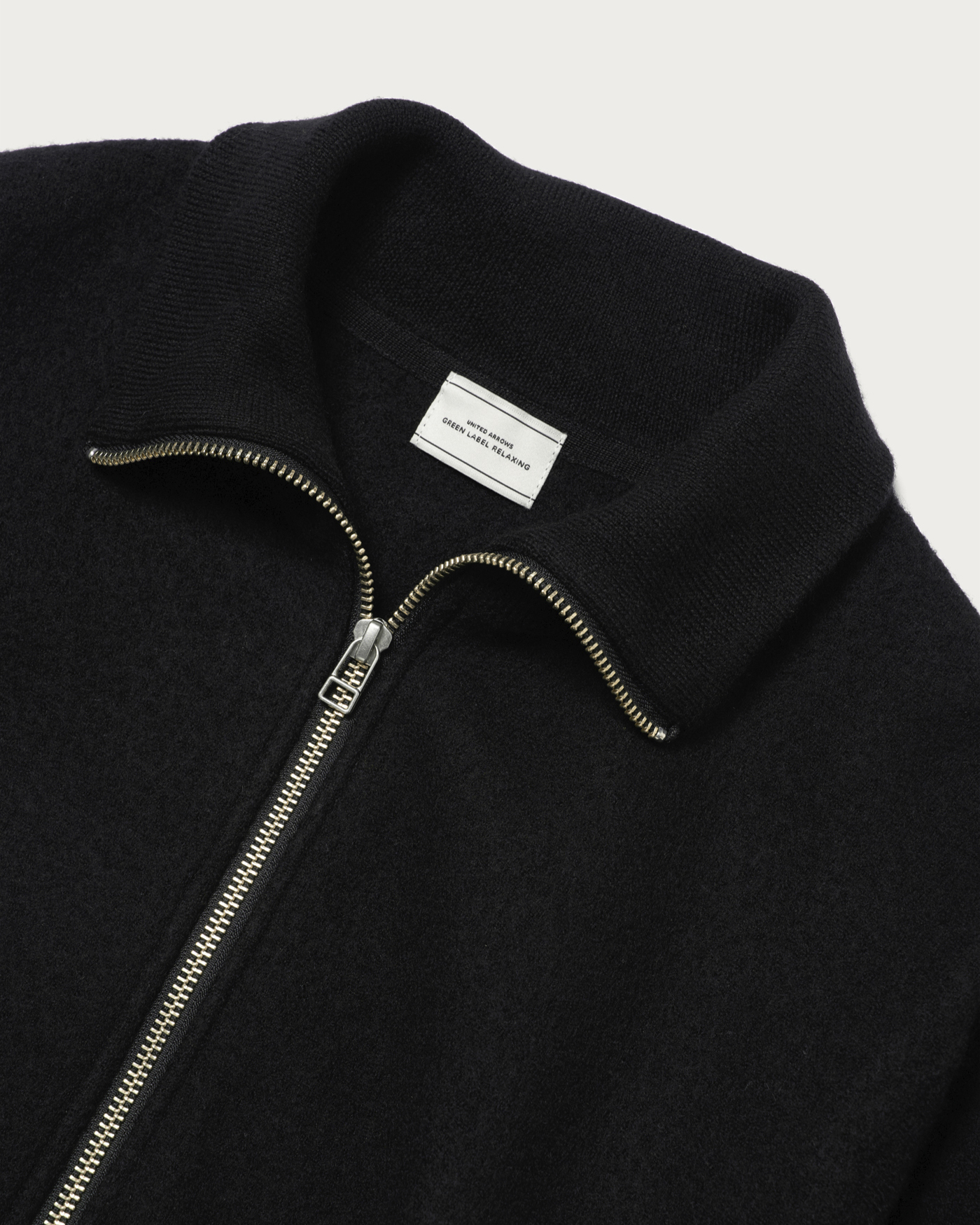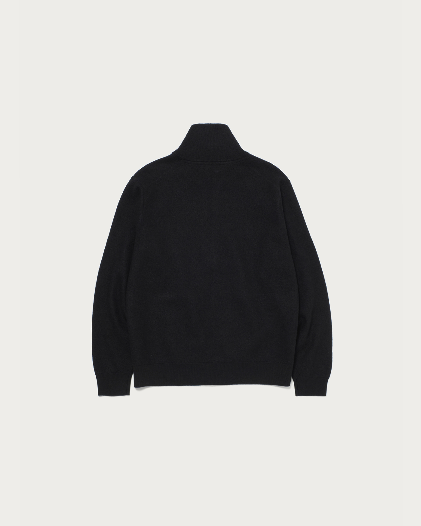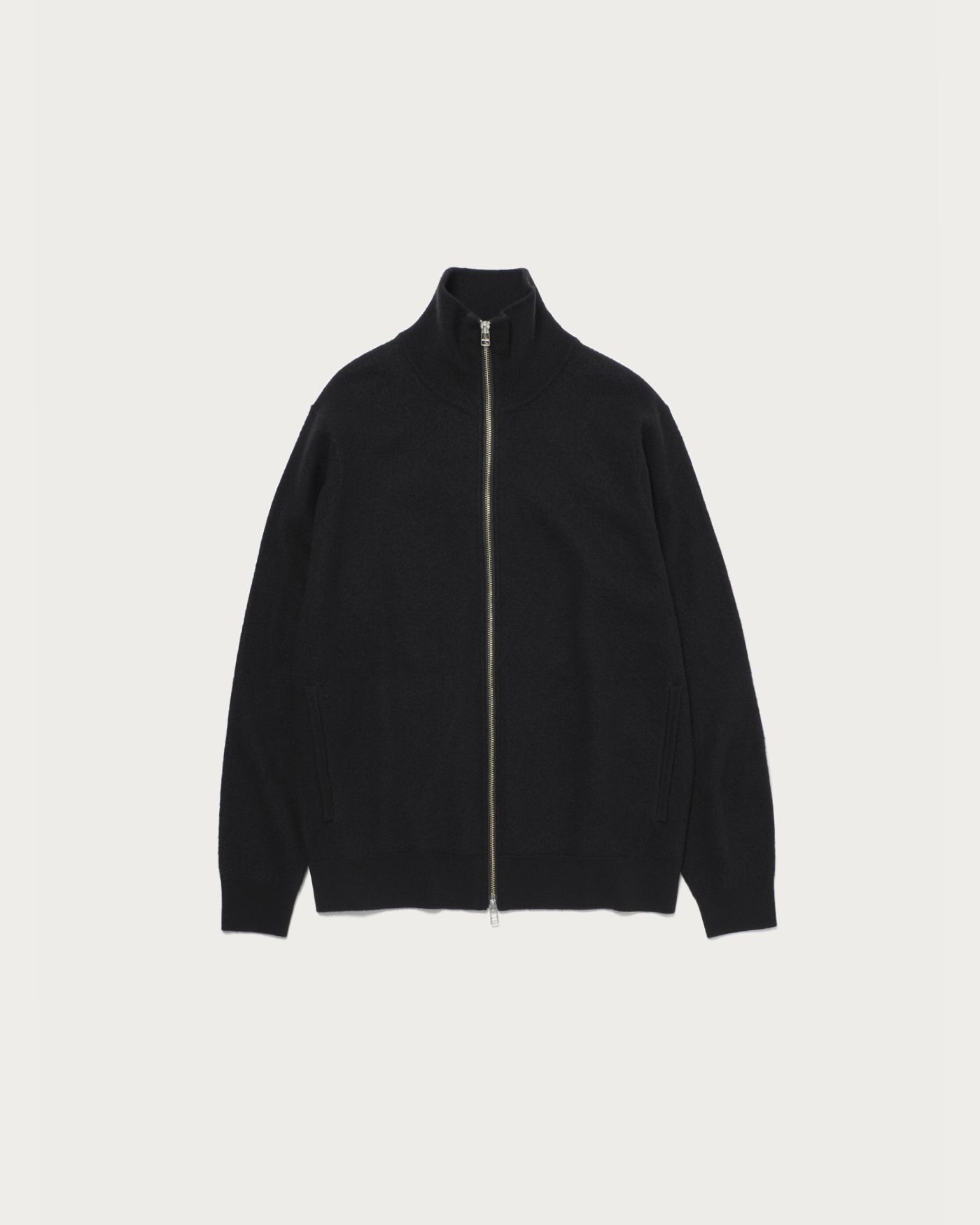 フロントファスナー仕様のスタンドカラーニット。腰にはポケットを配し、ちょっとした小物の収納にも便利。上質なウールを使用した縮絨加工ニットで、滑らかで柔らかな風合いが特徴。程よい厚みがありながら軽やかな着心地で、ジャケットやコートのインナーとしても活躍する一枚。