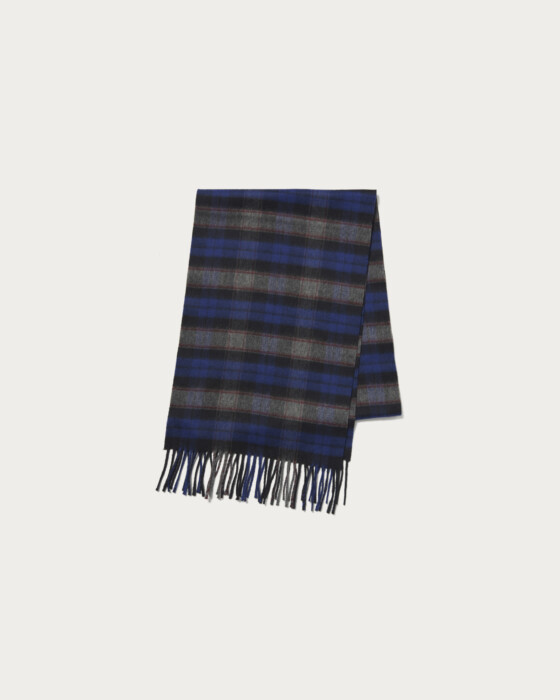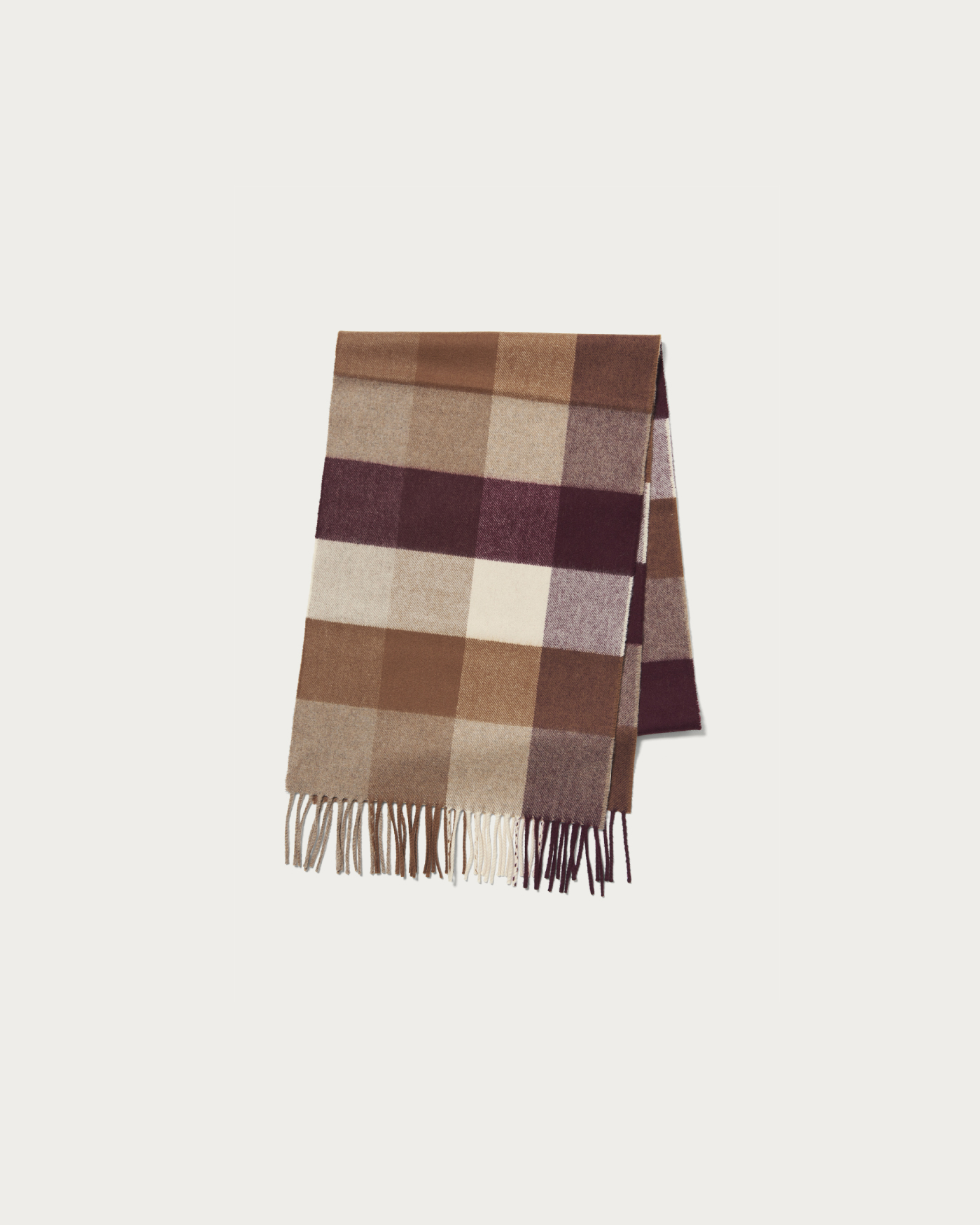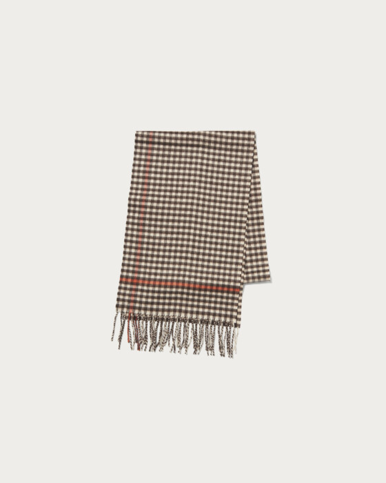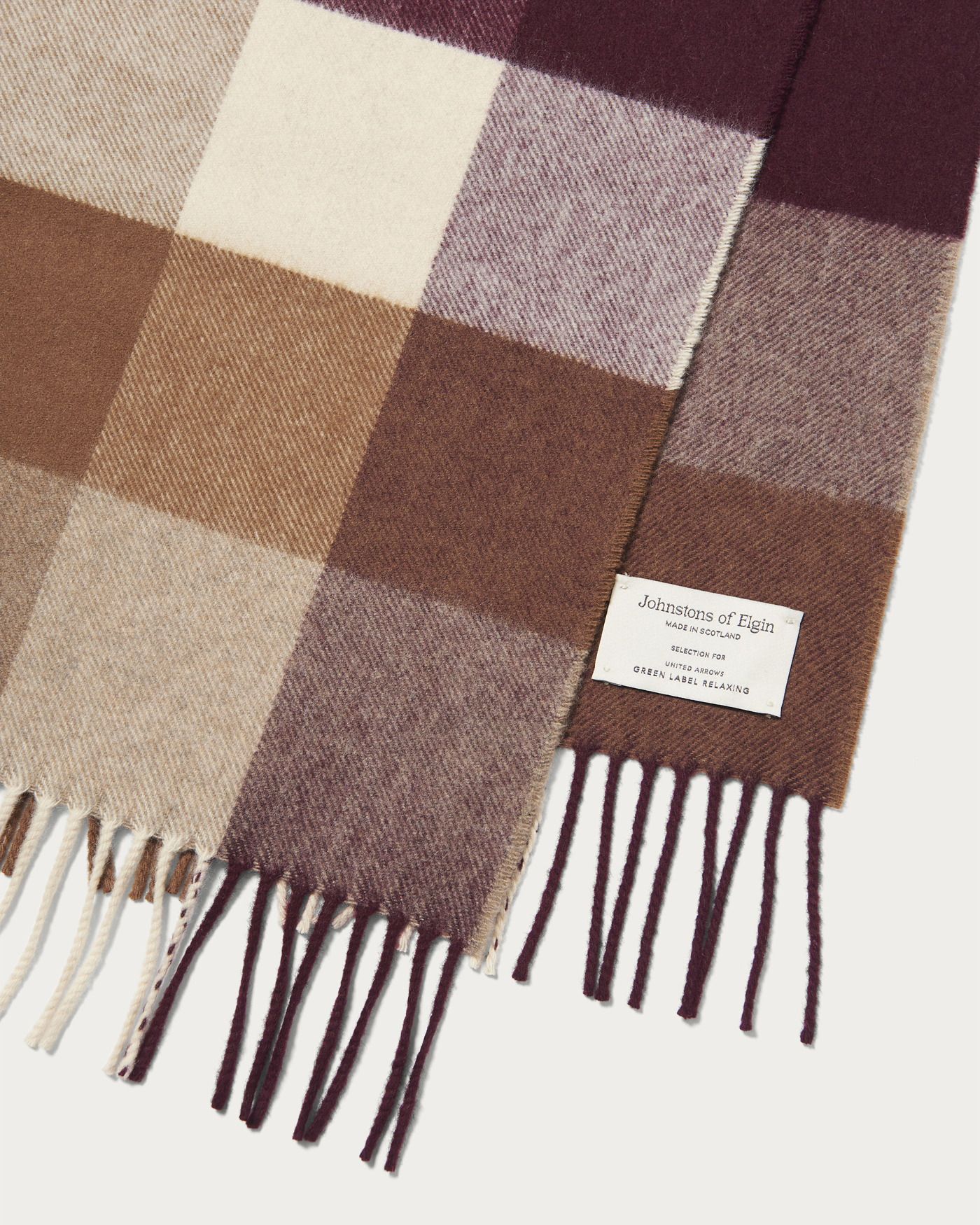 1797年にスコットランド北東部エルガンで創業した老舗ブランド〈Johnstons of Elgin〉のシングルマフラー。グリーンレーベル リラクシング限定展開のウールカシミヤ素材を使用し、今季はグレーとブラウンをキーカラーに、トラッドながらも鮮度のある色柄で別注。上質な柔らかさと暖かさで、日常の装いに上品なアクセントを添える一枚。