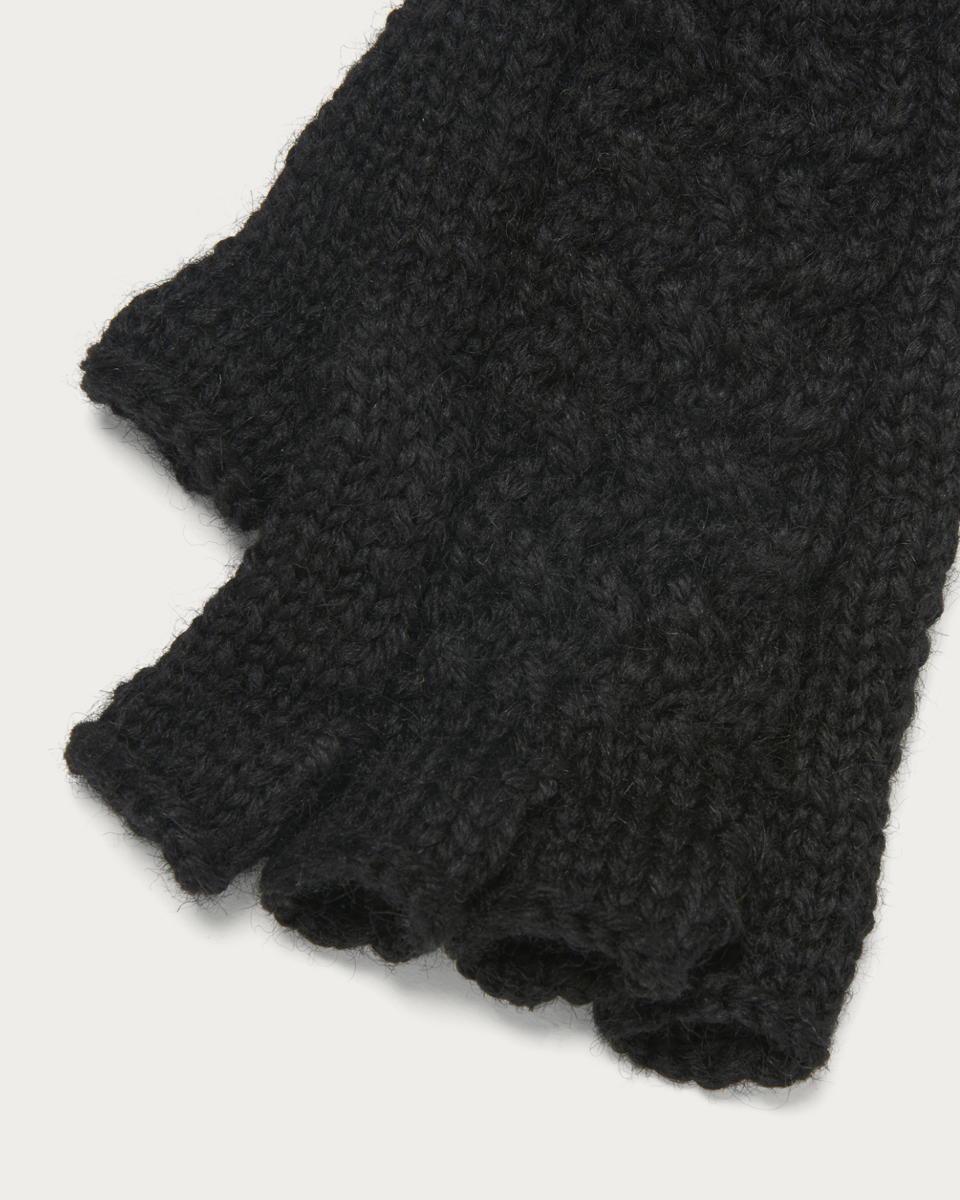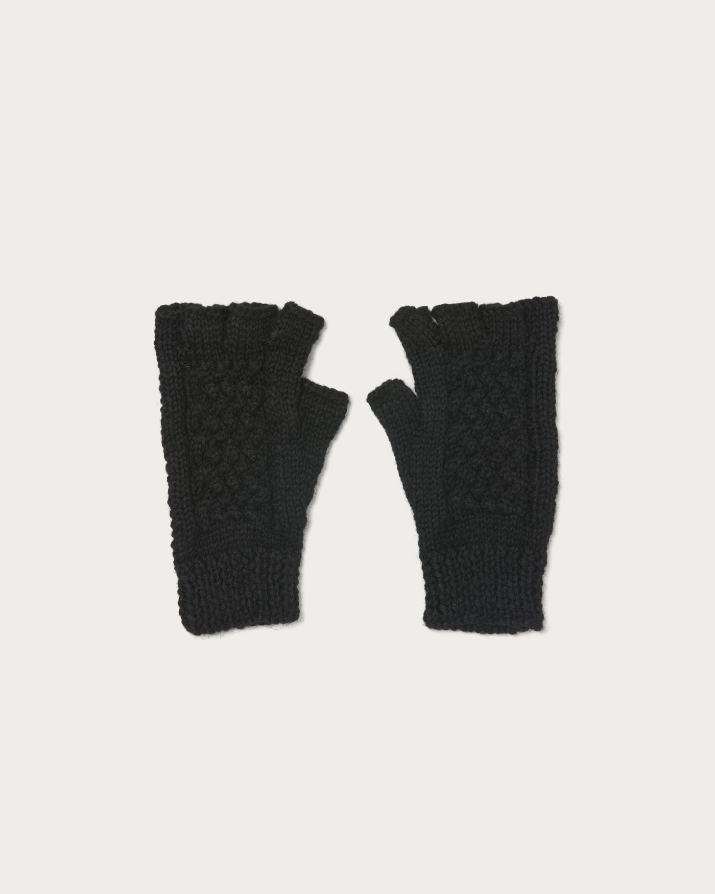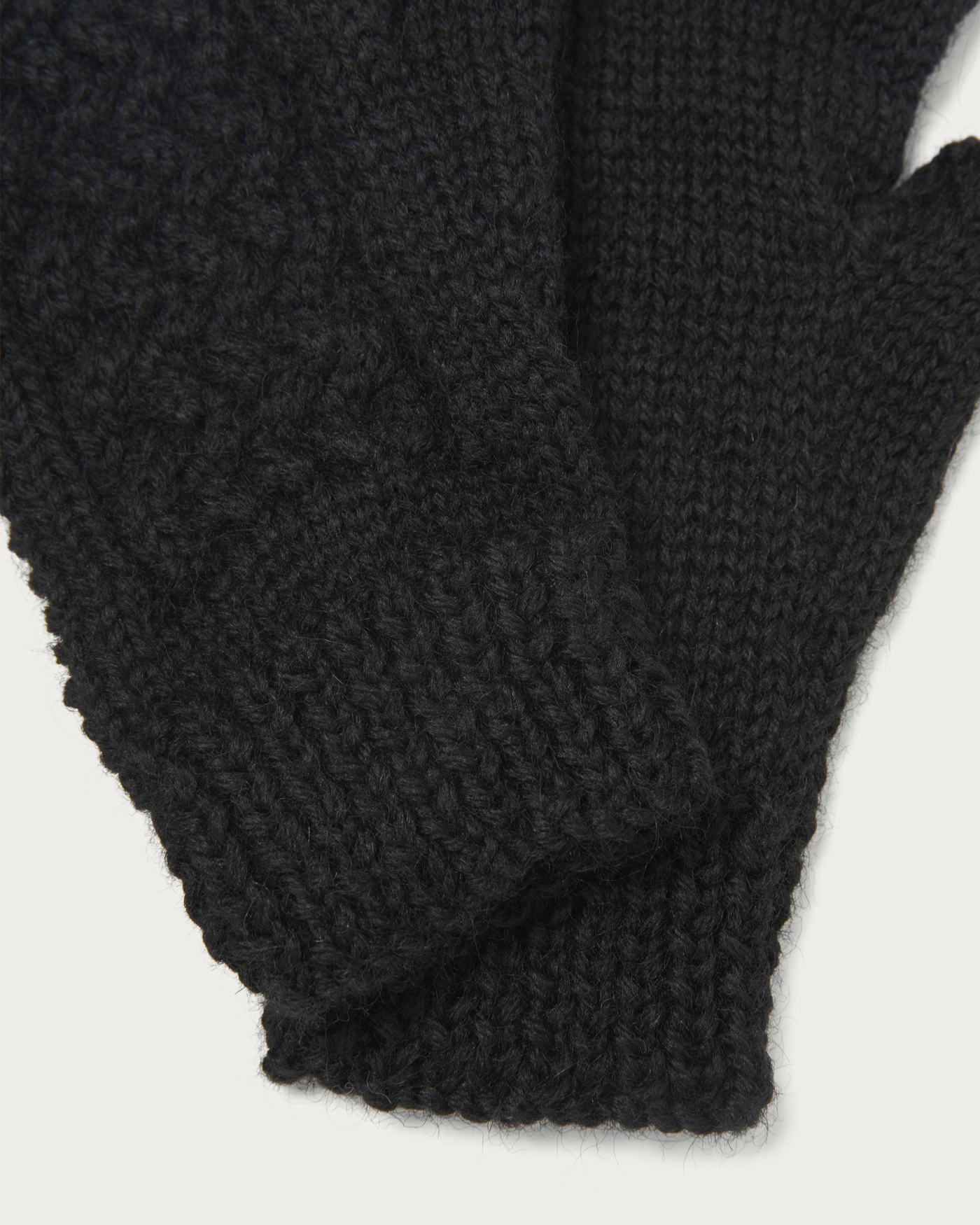 英国産ブラック・ウェルシュ・マウンテン・シープの希少な黒毛を使用したフィンガーレスグローブ。柔らかく保温性に優れた素材感と、甲側のアラン編みがさりげないデザインポイント。タブレット操作など現代のライフスタイルにも対応する実用性と上品さを兼ね備えた一品。
