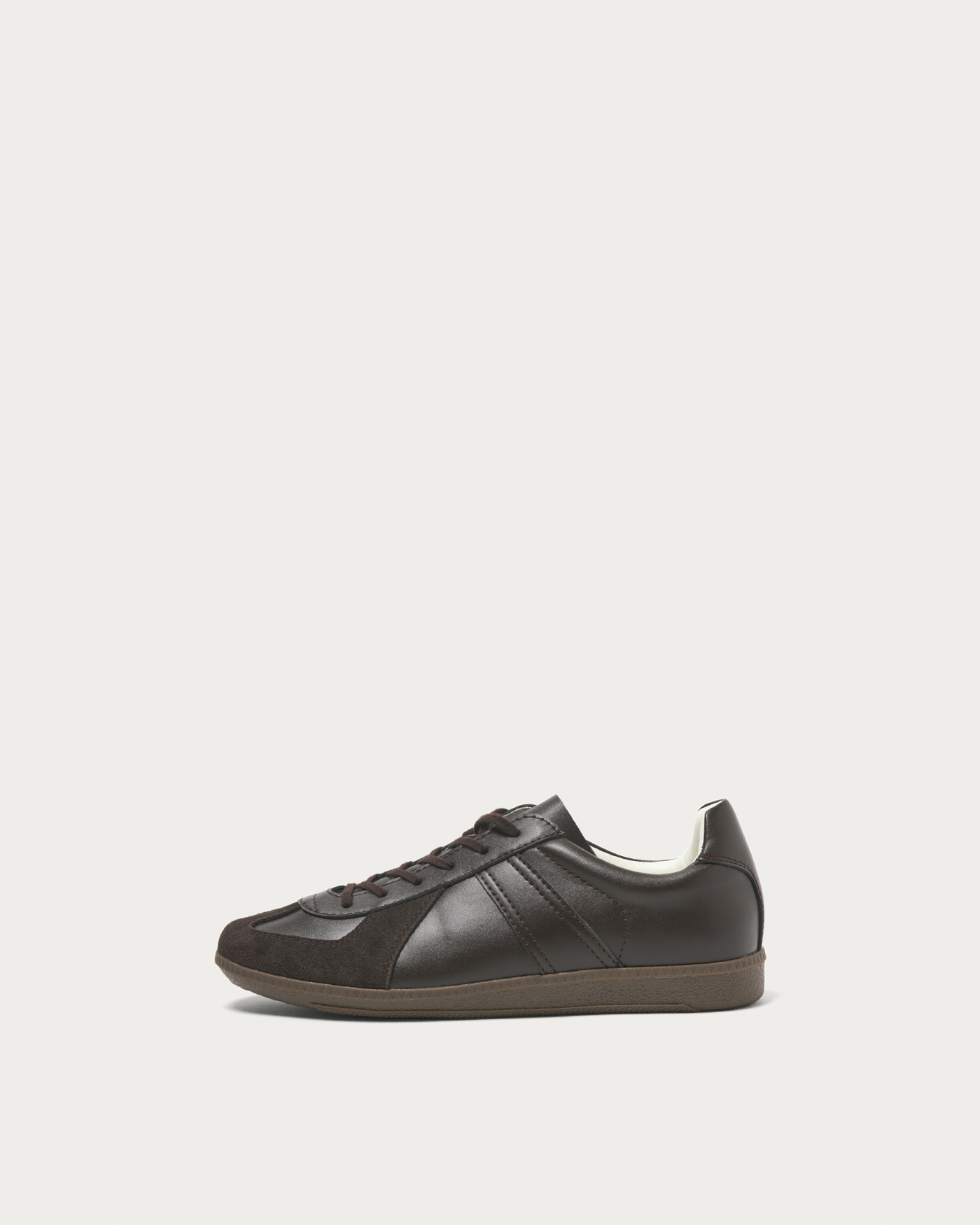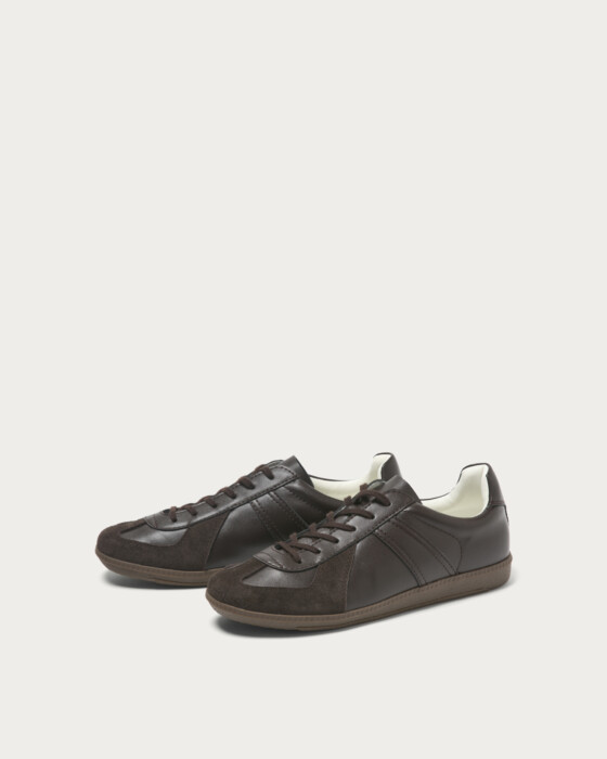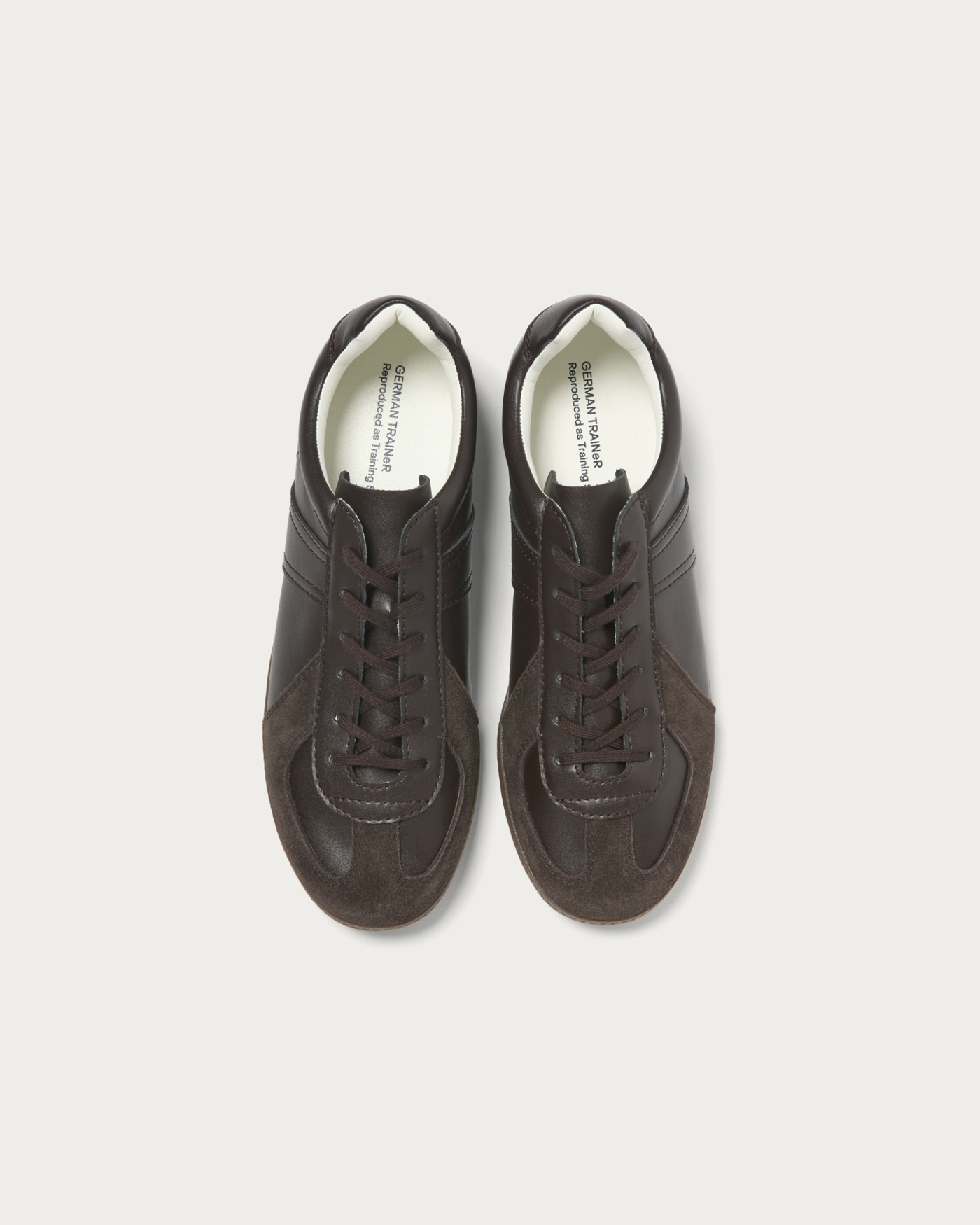 1970~80年代に西ドイツ軍で使用されていたトレーニングシューズである、ジャーマントレーナー。この歴史と伝統のあるデザインに、今期トレンドカラーでイチオシのブラウンを載せて、鮮度を出している。