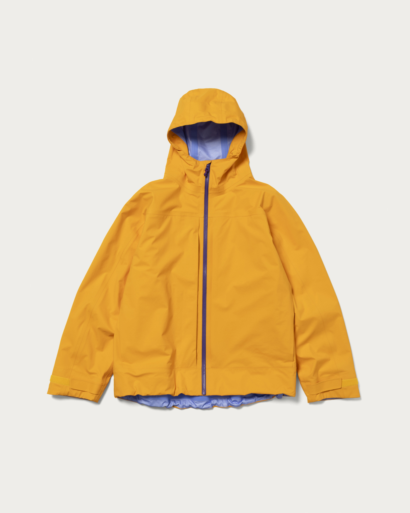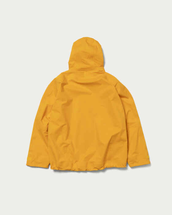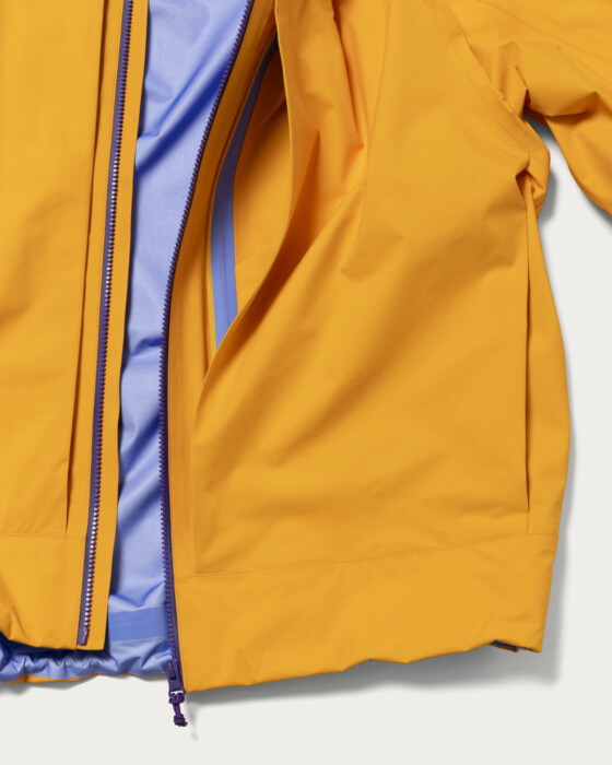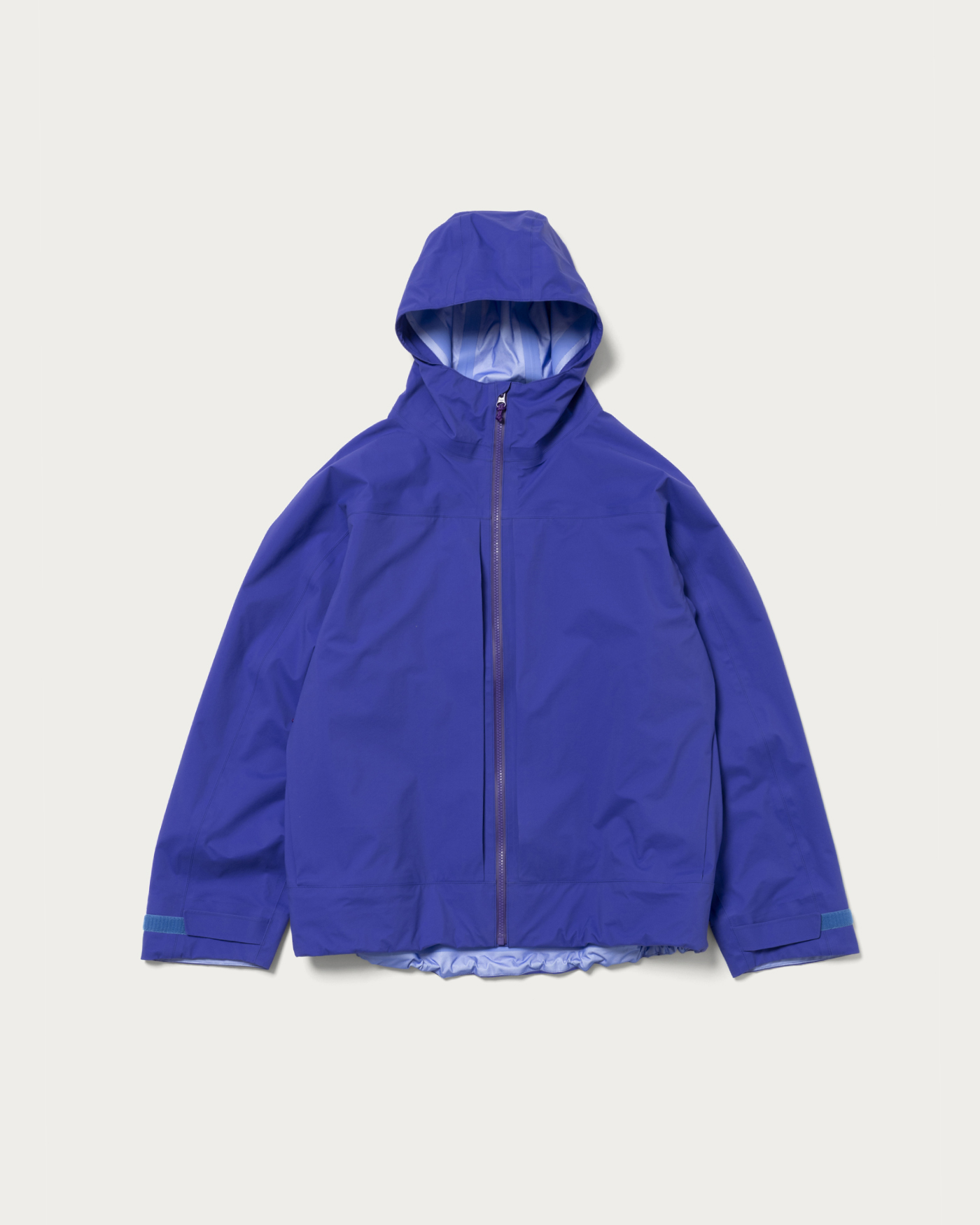 90’sムードが漂うブルーのライニングと表地のカラーリングが目を引くマウンテンパーカ―です。撥水・防水・透湿・防風機能を備えた3レイヤーファブリックを採用。各縫目はシームテープ処理により水の侵入を防ぎフロントジッパーは防水仕様のビスロンアクアガードを採用。20Dの軽量ナイロンを使用しつつ当時のほどよいハリコシ感を表現する為に表地は昨年よりも高密度に織り上げ膜もハリのある物に変更。前身頃に付くステルス仕様の大型ポケットはセンターと脇の両側からアクセスが可能です。