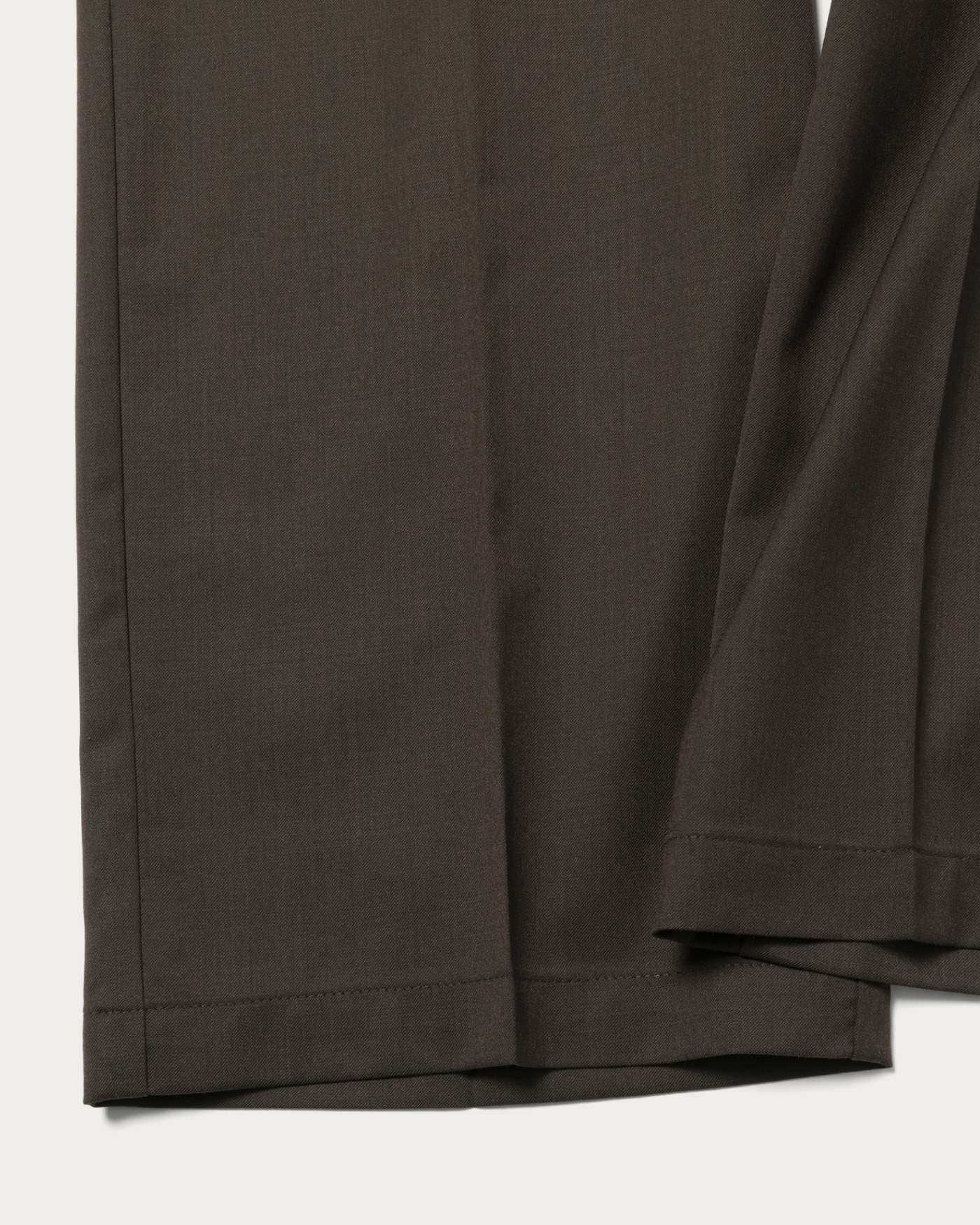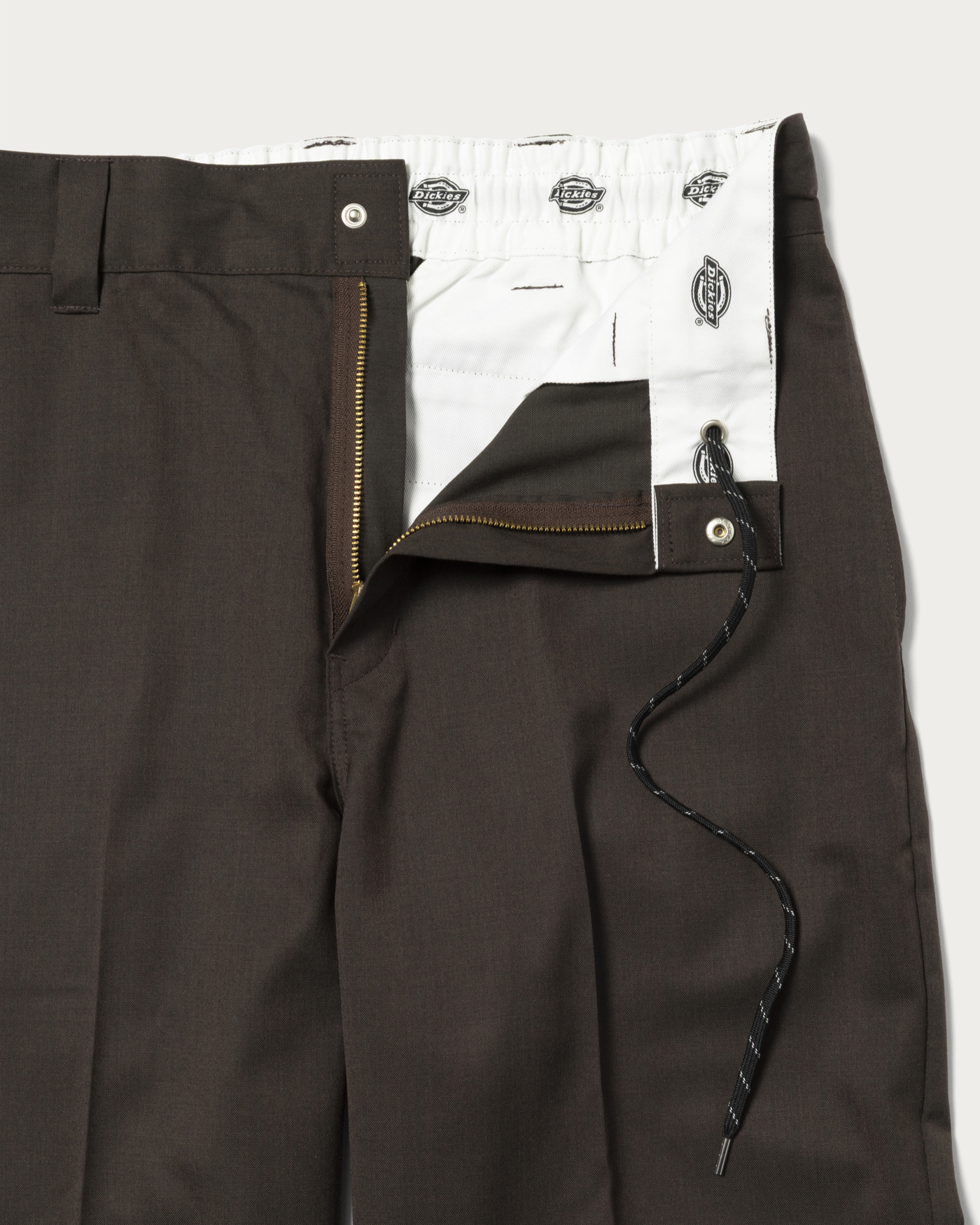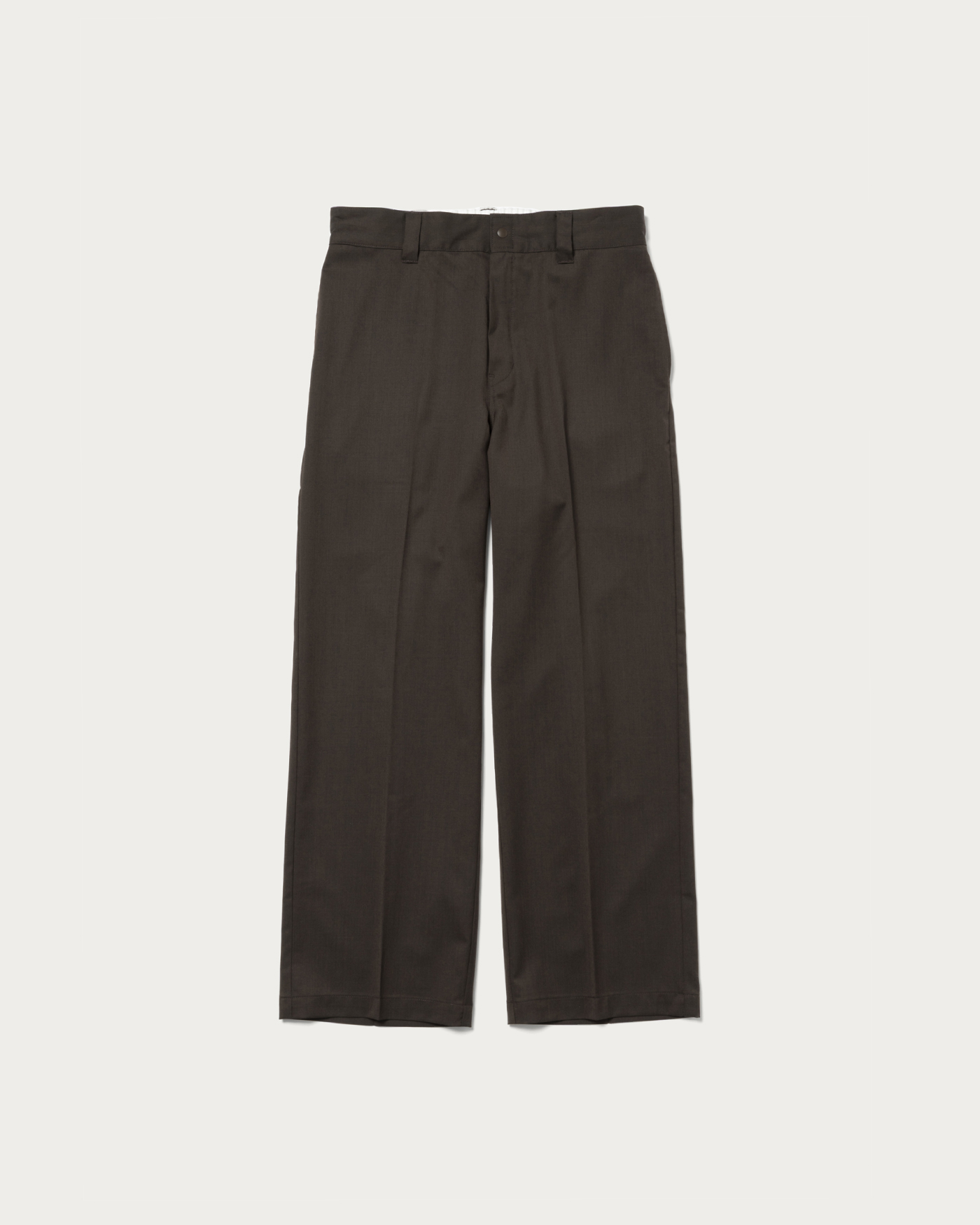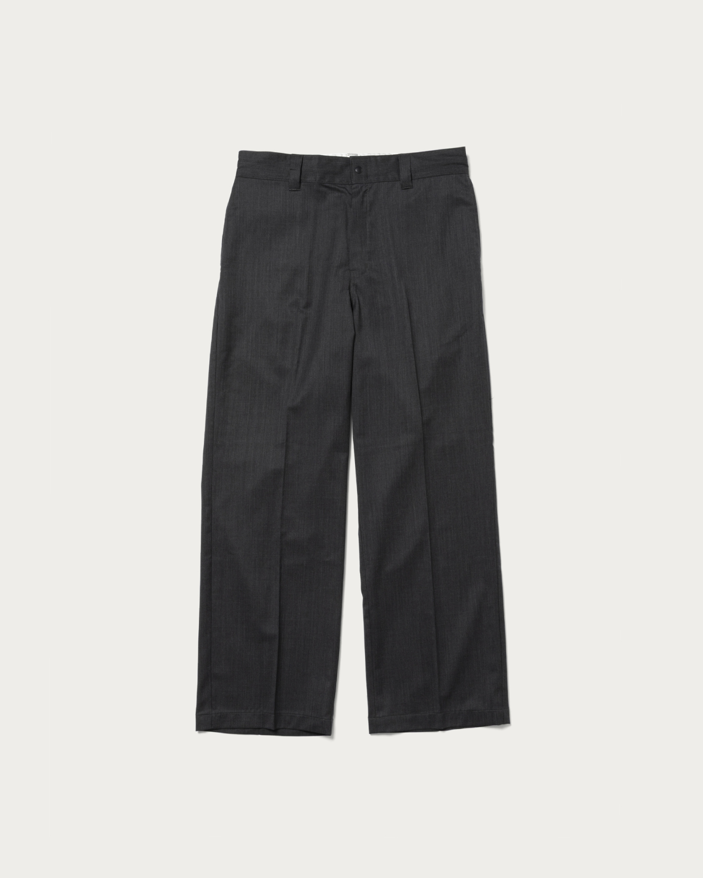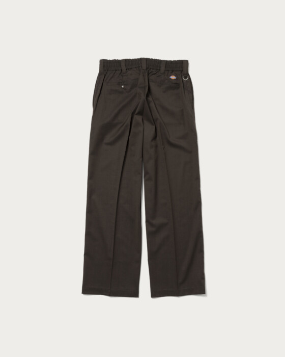 Dickies®の定番モデル「875」をベースにシルエット調整しメリノウールとストレッチ性に優れたSOLOTEX社とUNIFI社の「REPREVE」リサイクルポリエステルを混紡したウォッシャブルウールを採用。ウール素材特有のしなやかさとドライでソフトなタッチが特徴です。ウエストの後ろ部分にゴムを入れたスピンドル仕様、フロントトップボタンとヒップポケットはスナップボタンに、ベルトループにはDカンを配置しました。ドライな生地感による快適さとベルトレスでも穿けるイージーな穿き心地に拘りました。