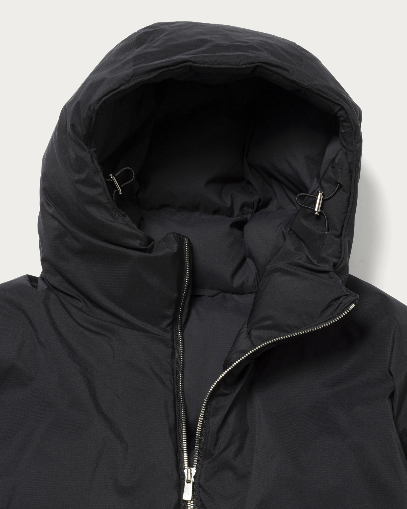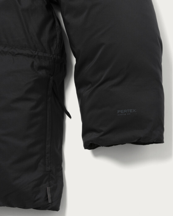 機能素材「PERTEX® QUANTUM AIR」生地を採用したフーデッドダウンジャケットです。軽やかな生地で、マットな光沢感が程よくファッション性を高めてくれます。700FPダウンをたっぷりと充填したミドルレングスのデザイン。フロントの金属ファスナーにはYKK社のエクセラファスナーを使用。研磨されたエレメントの滑らかさが秀逸です。またウエストに備わったドローコードにより細やかなシルエットの調整が可能で、少し強めに絞ってシルエットに強弱を出した着方もおすすめ。筒形の袖でありながら袖口内側にはナイロン混のカットソーリブが付き防寒性を搭載しています。