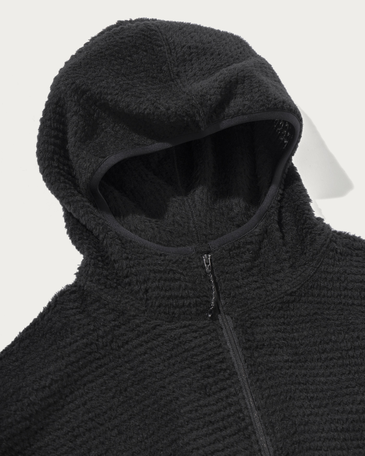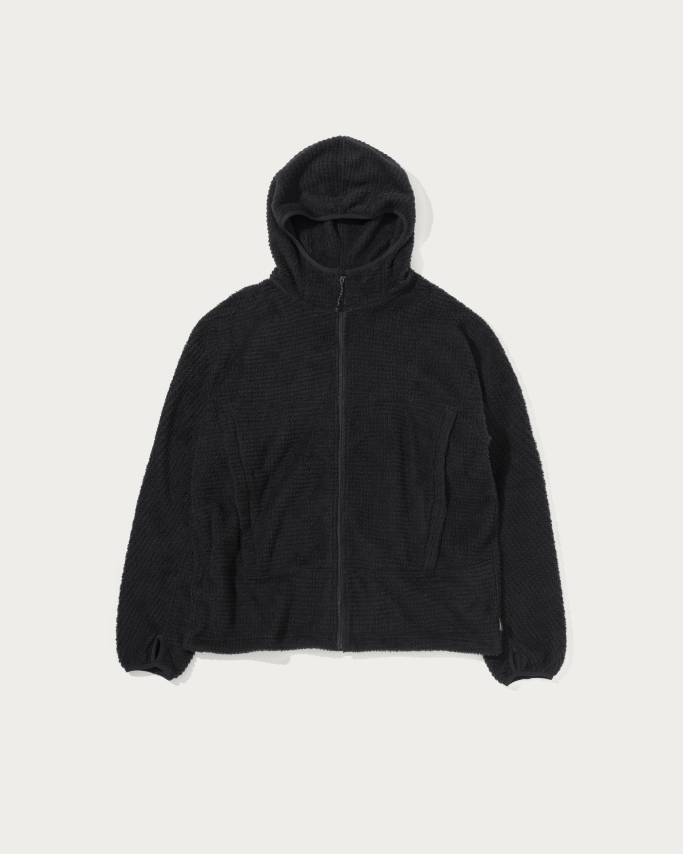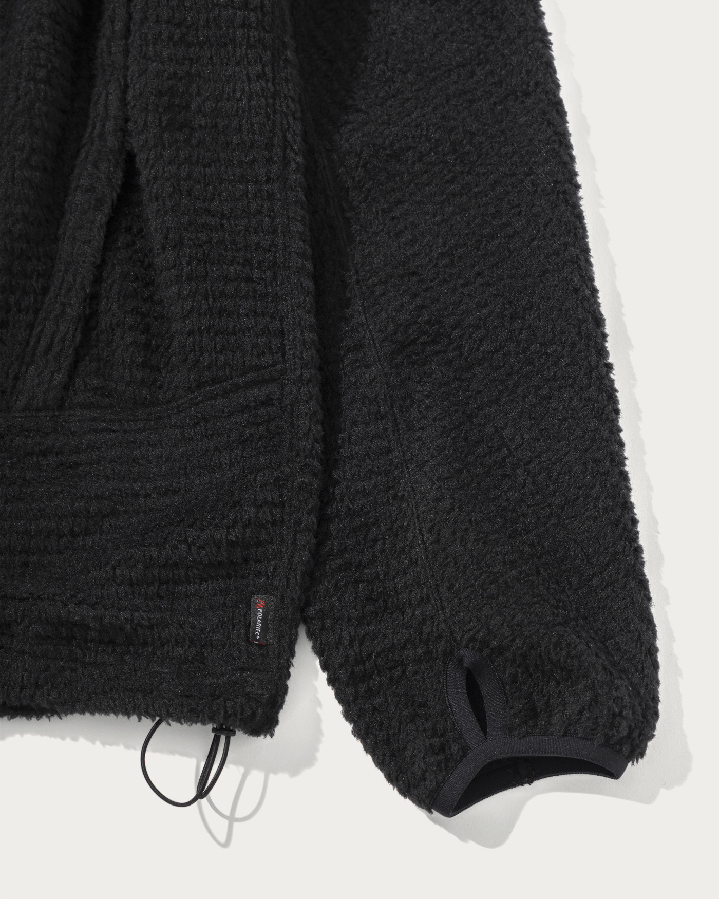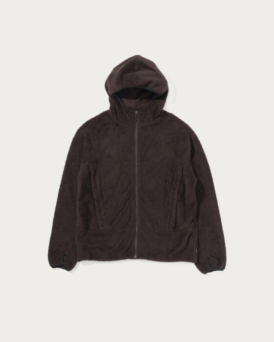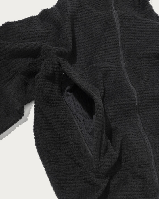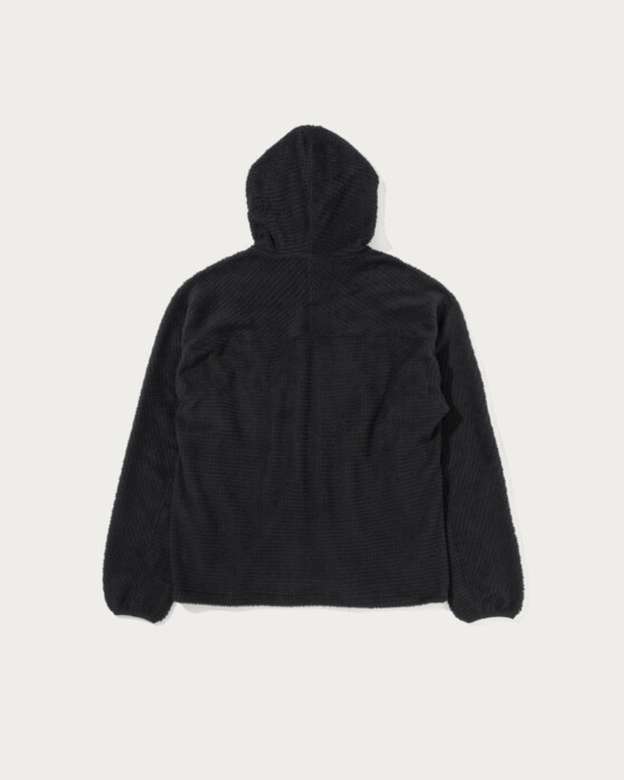 ポーラテック社の"アルファダイレクト"生地を採用したフーディです。メッシュ状に編まれたライトウエイトのフリースは風通しがあり、寒くない時期から着用が可能な日本の気候にあった素材です。フィット性を高めたフード、ドルマンスリーブでややゆとりのあるシルエットです。外脇にはシーム腰ポケット、裾にはシルエットが調整できるエラスティックドローコードを配備。袖口にはサムホールを搭載。一枚着としてもミドルレイヤーとしてもシーズン通して重宝する一着です。