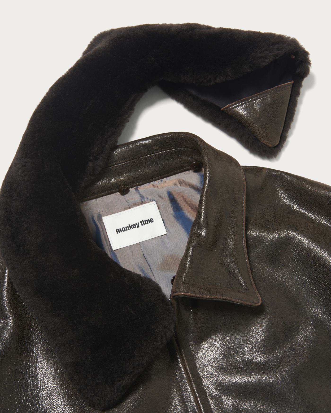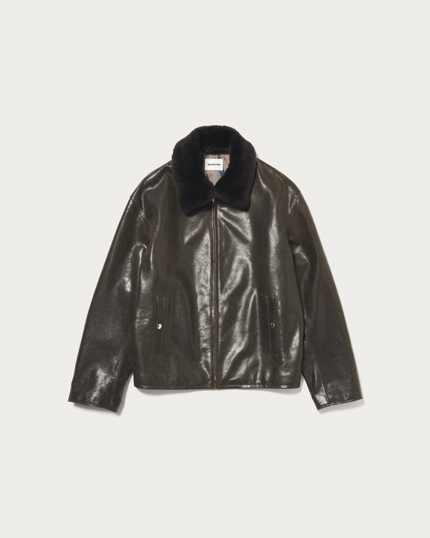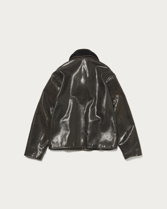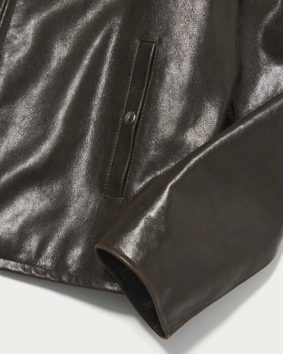 ゴートレザーのジャケット。ブラウン系の革の上にブラックの染料を塗っているため、着用を繰り返す事で芯の茶色が少しづつ出てきて経年変化を楽しめます。衿のリアルムートンは着脱可能で秋~春まで着用期間の長いアイテムです。