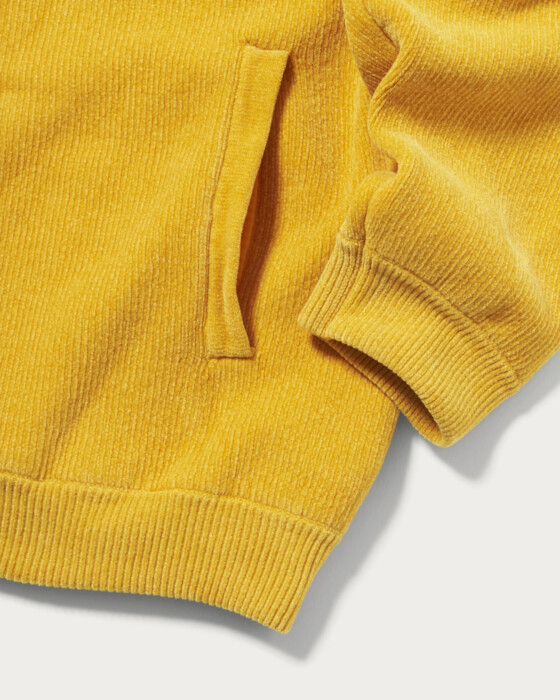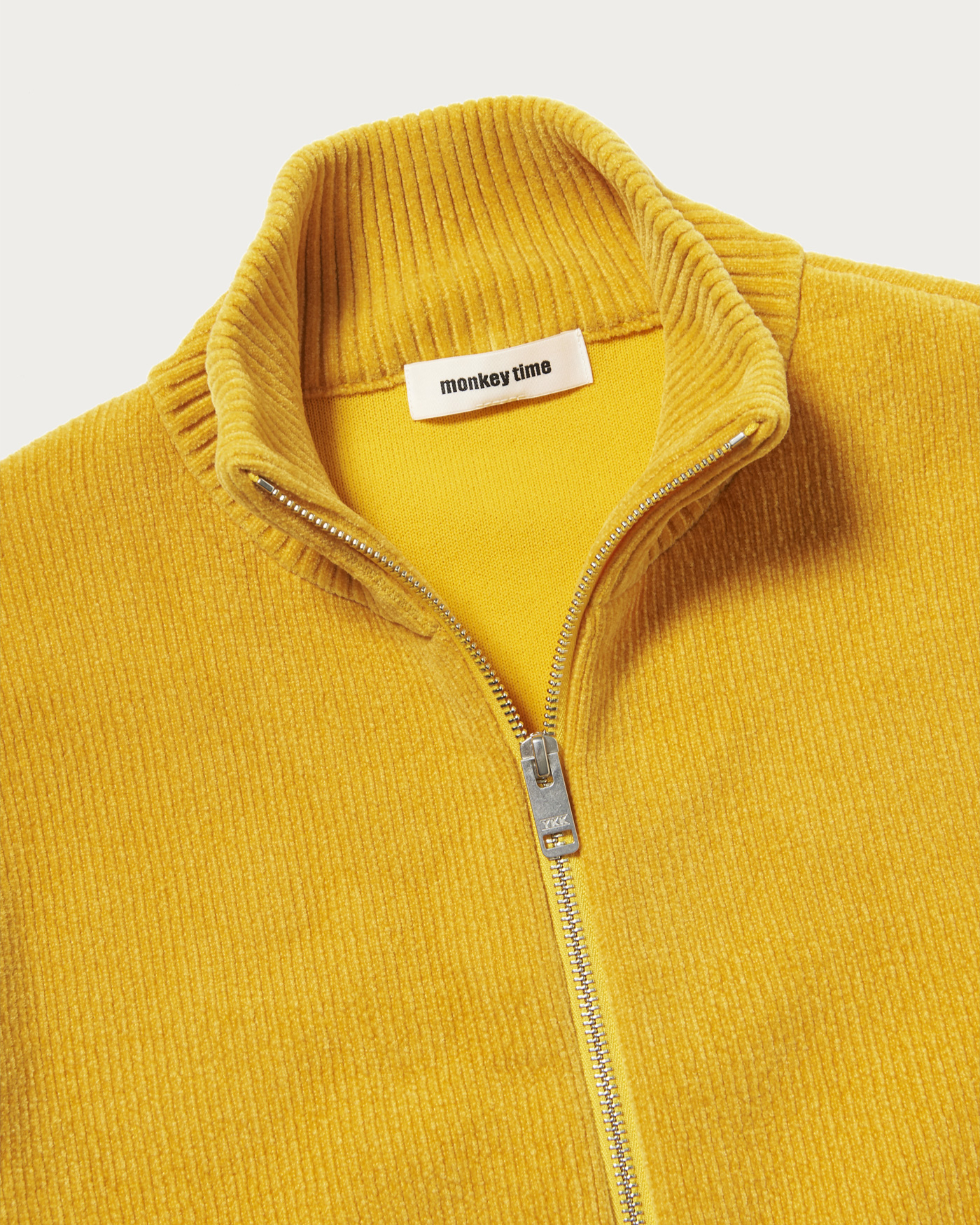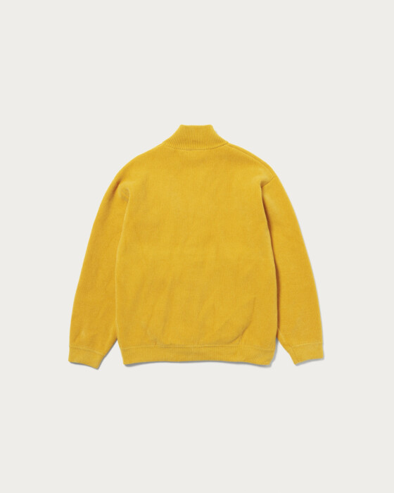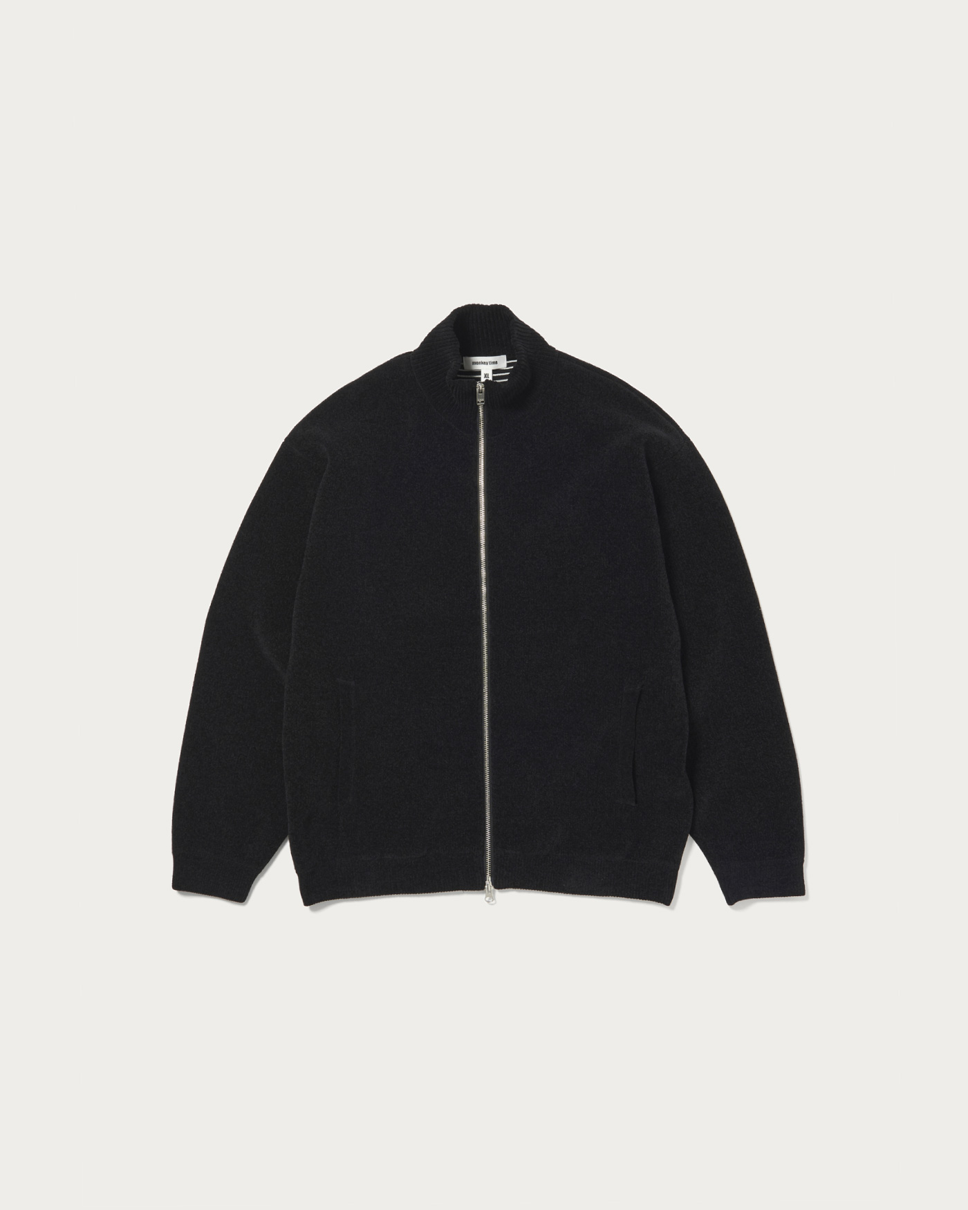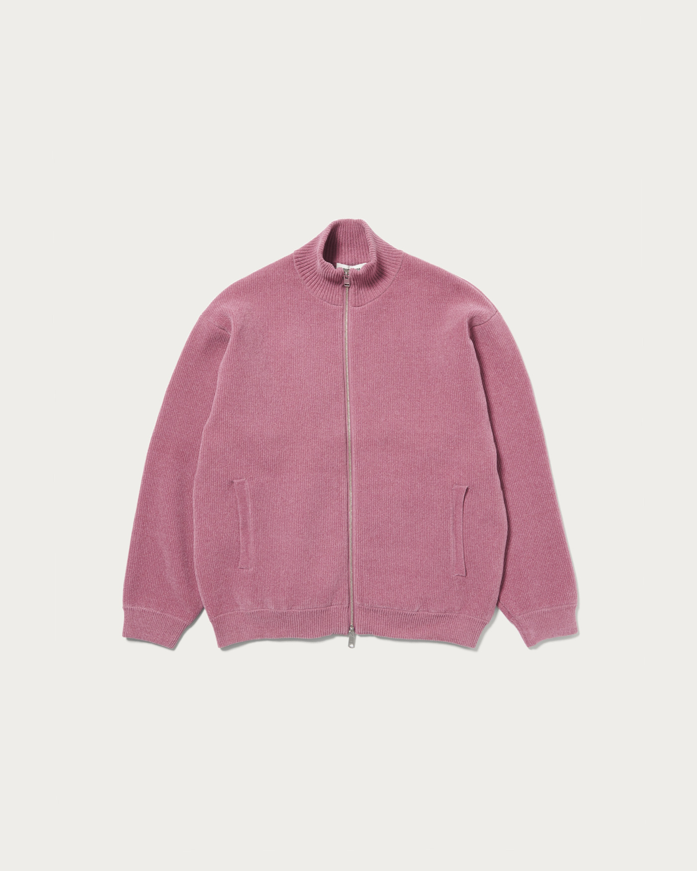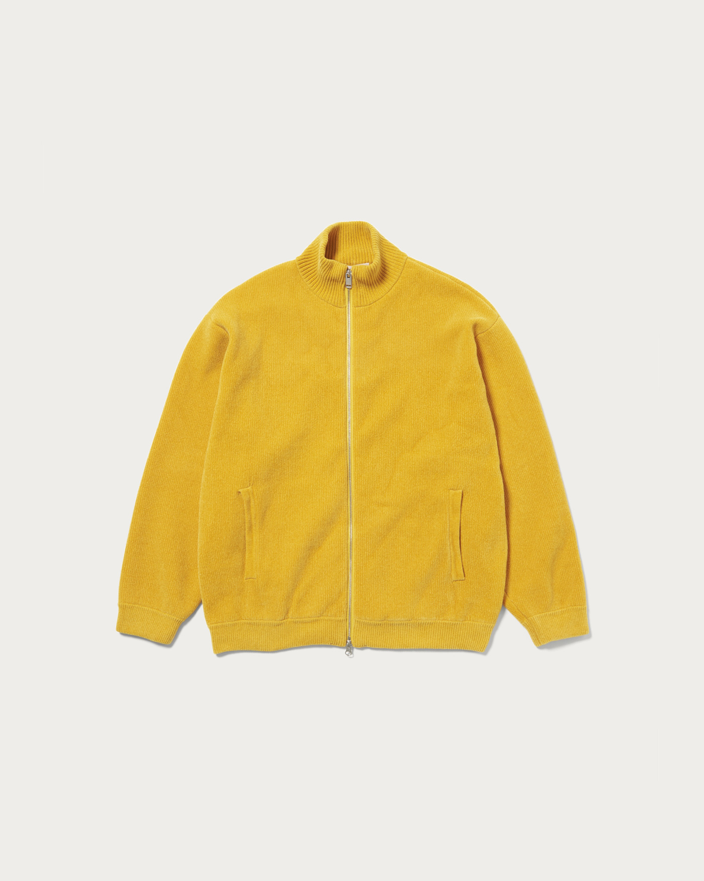 表糸にモール糸、裏糸にポリエステルの糸でプレーティング組織に編んだフルジップニット。裏面プレーティングによってハリ感を出しました。