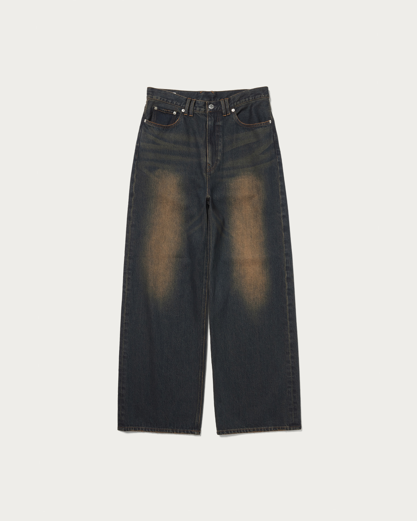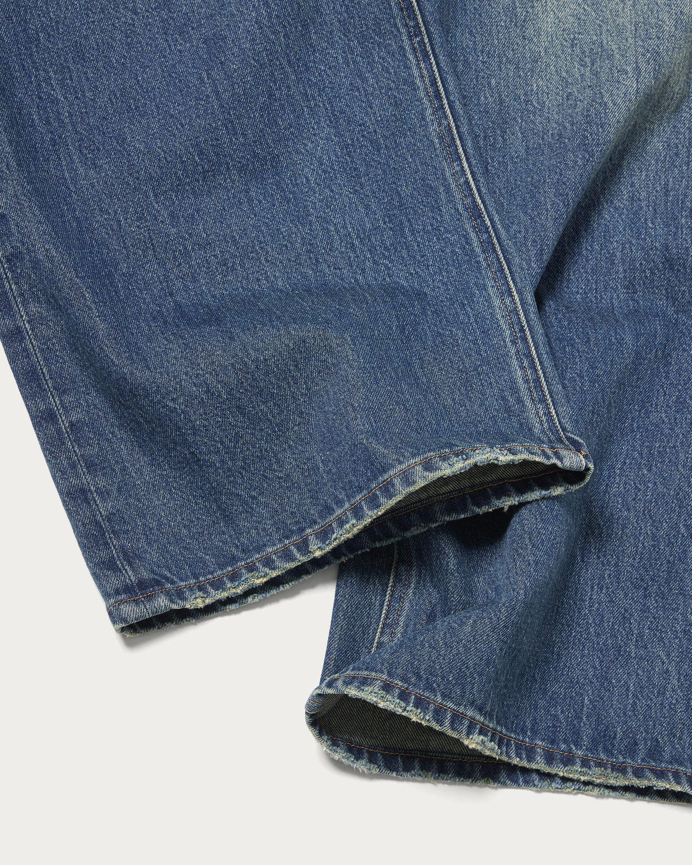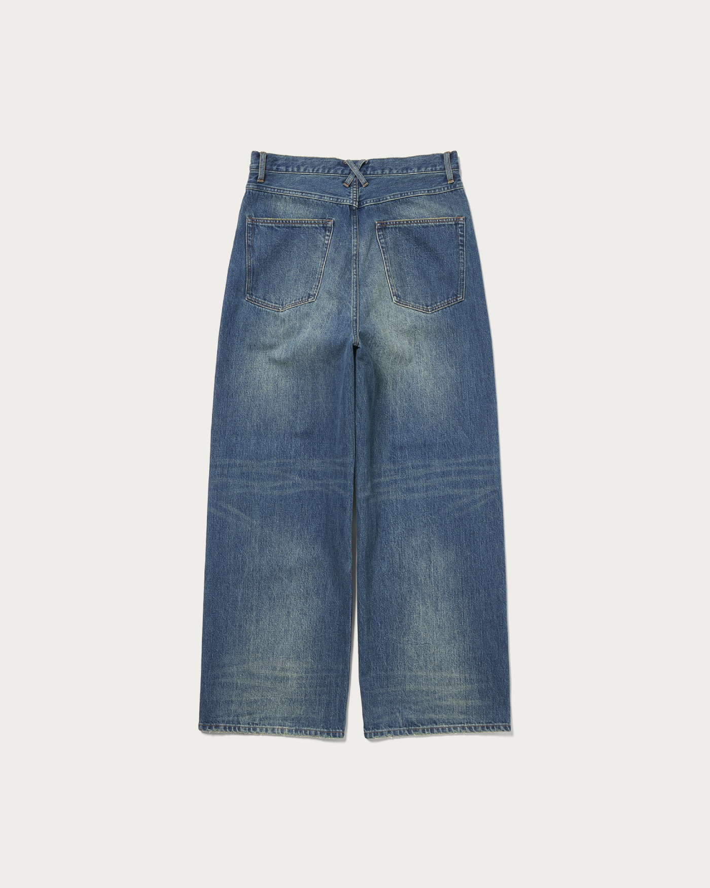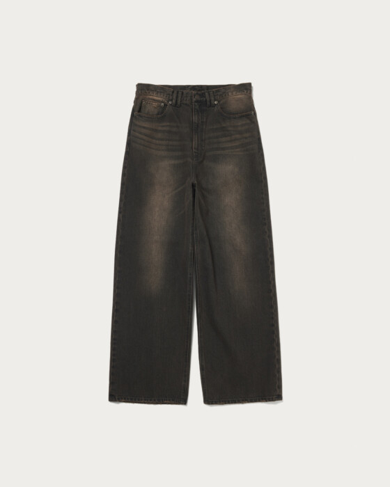 13オンス程度のしっかりした肉感のデニムを使用し、ビンテージ加工とオーバーダイを施したバギーパンツ。ゆとりのあるワイドシルエットながらもルーズになりすぎない絶妙なシルエットが魅力です。