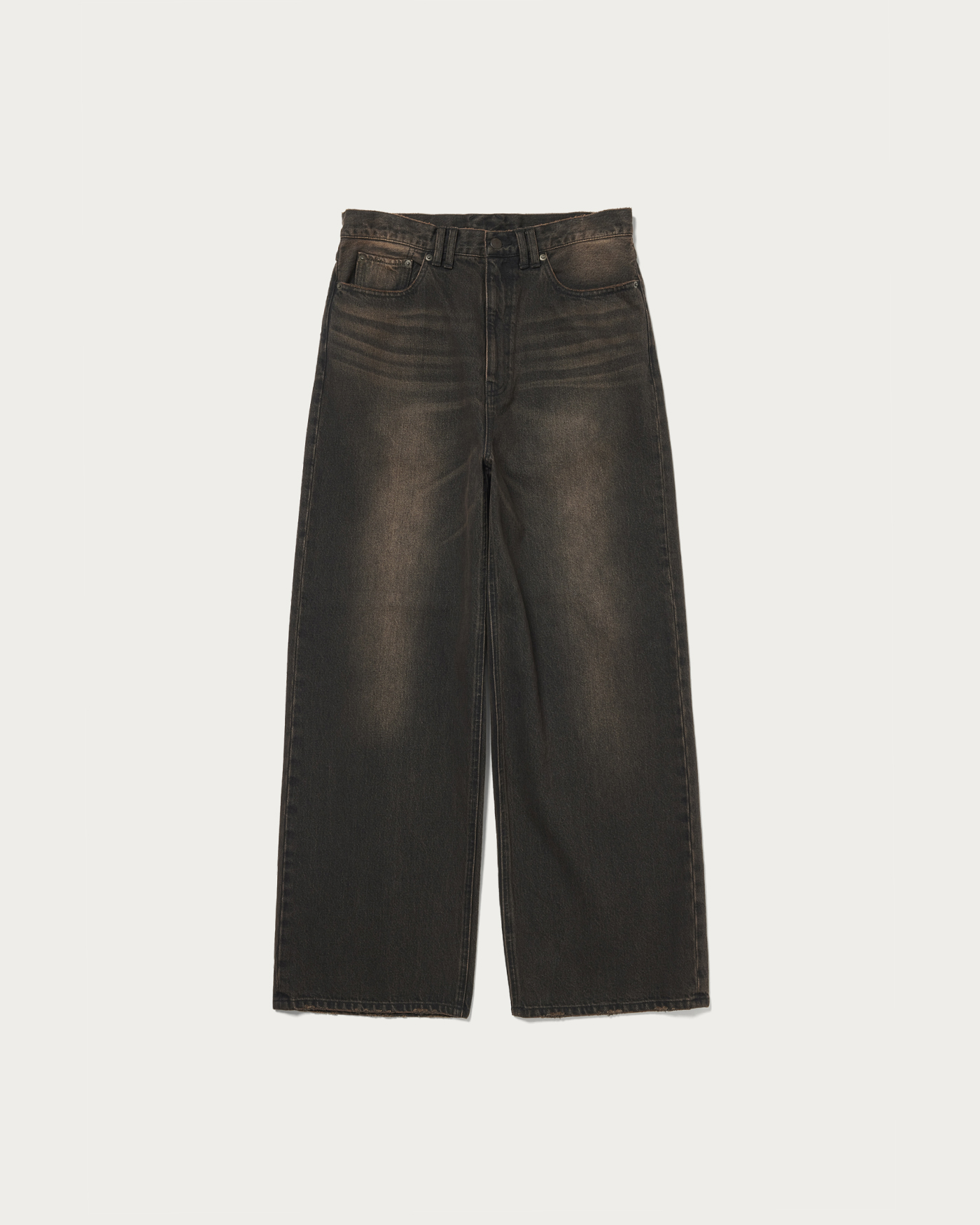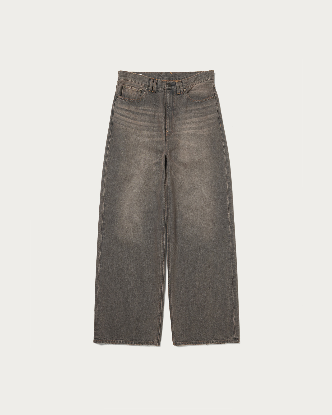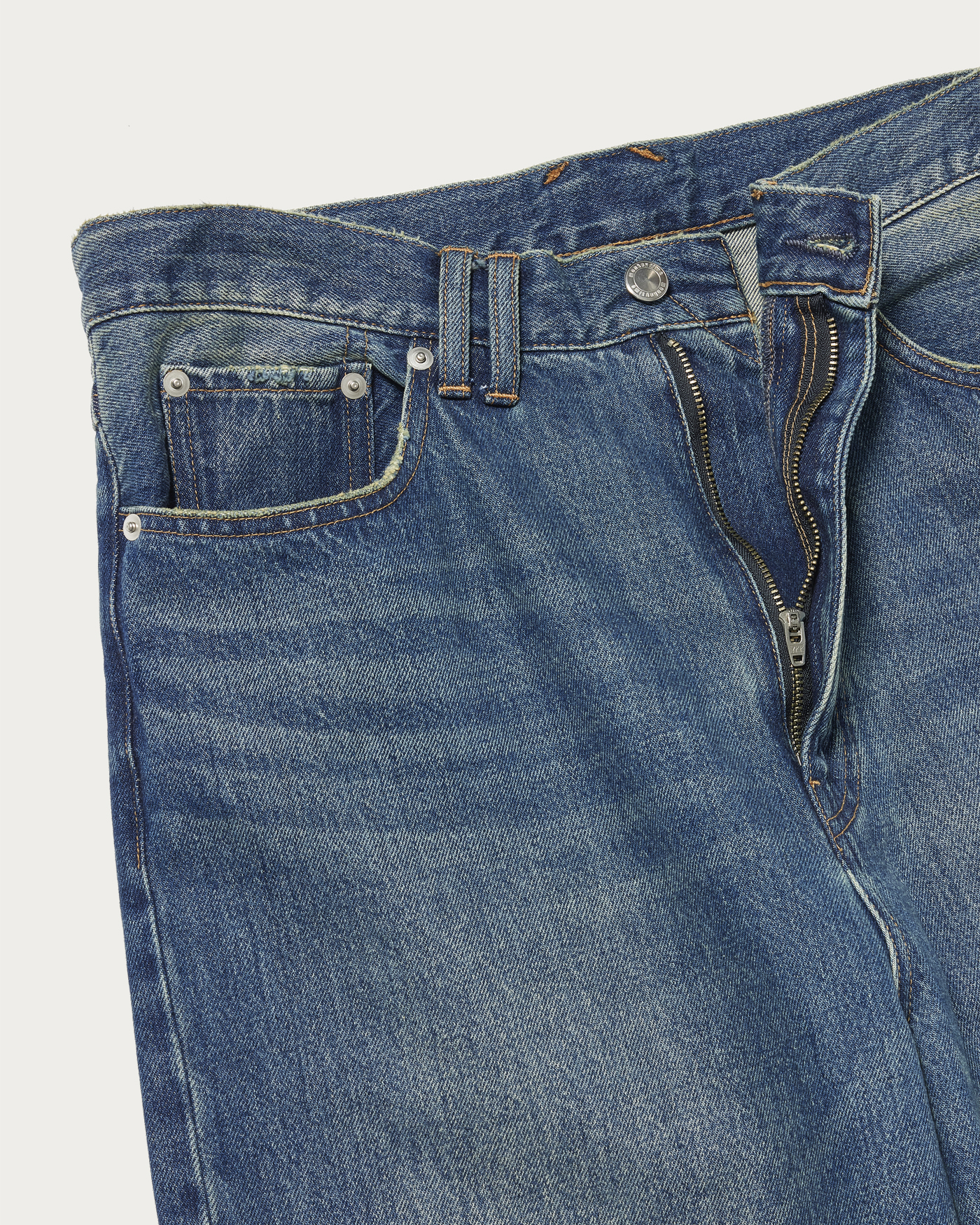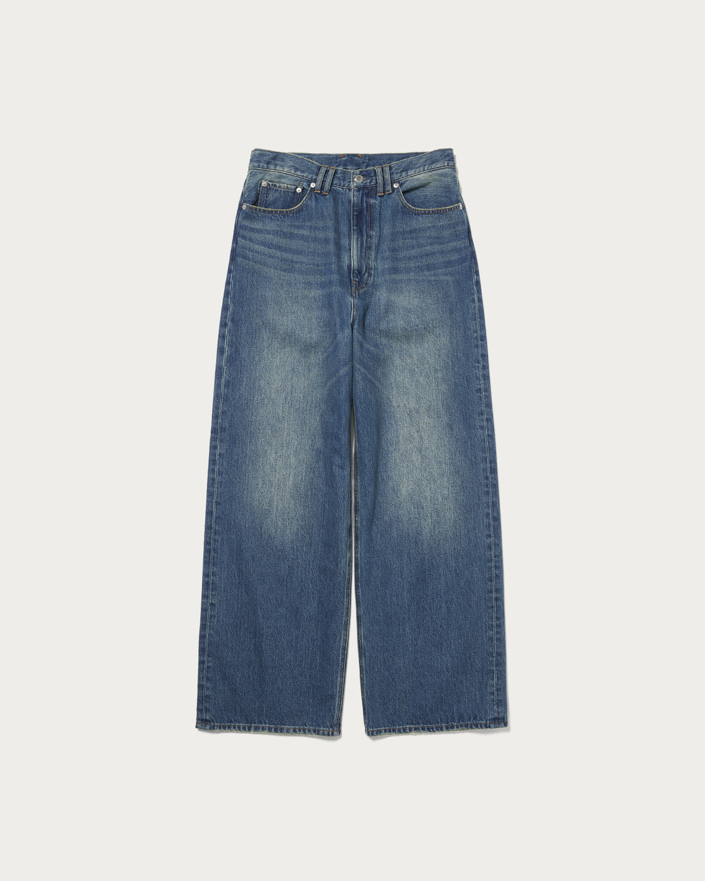 13オンス程度のしっかりした肉感のデニムを使用し、ビンテージ加工とオーバーダイを施したバギーパンツ。ゆとりのあるワイドシルエットながらもルーズになりすぎない絶妙なシルエットが魅力です。