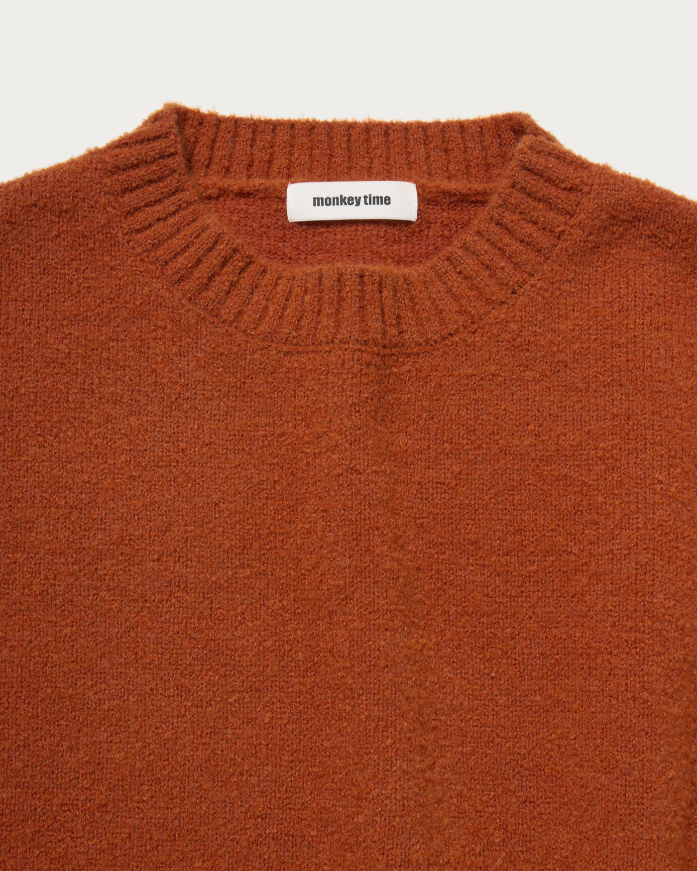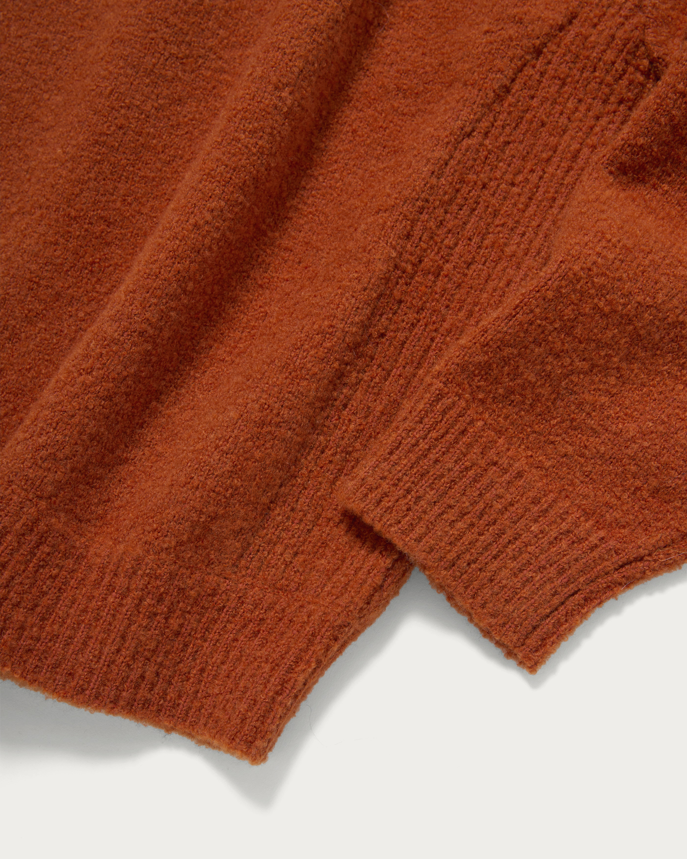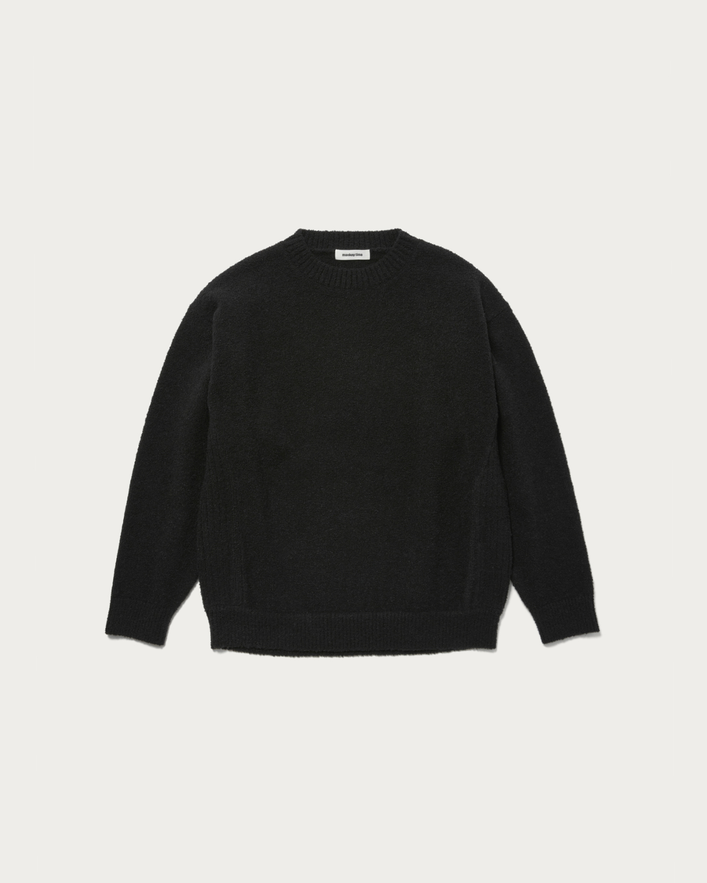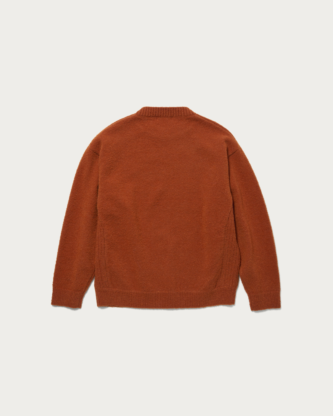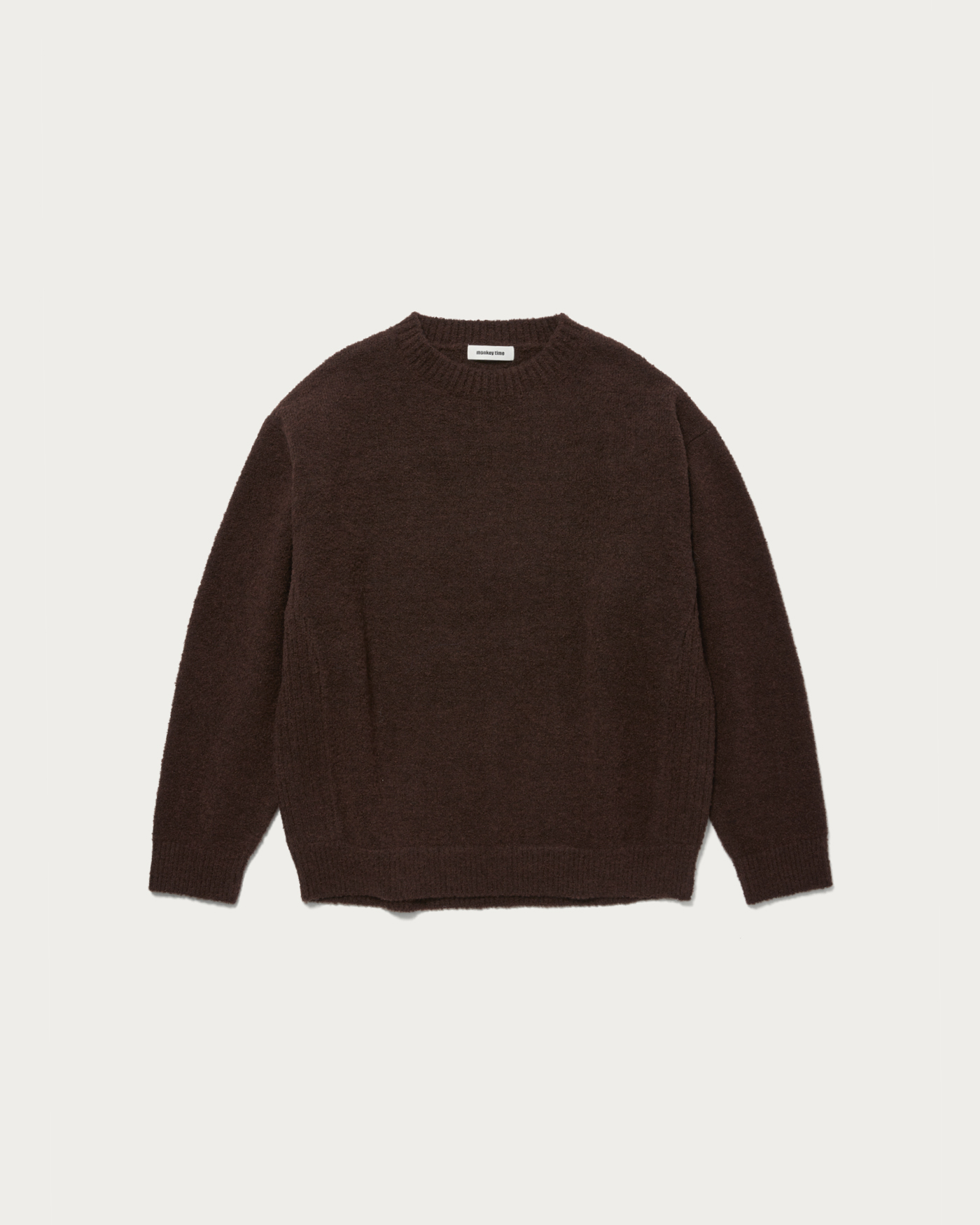 表面に表情のある細かいループ状の糸を使用し、裏面にポリエステル糸をプレーティングしたクルーネックニット。スウェットに見られる脇の編地変化などさりげないアクセントを搭載しており、裏のプレーティングによりニット特有のチクチク感を軽減すると共にスウェット感覚で着ていただけるアイテムに仕上げています。