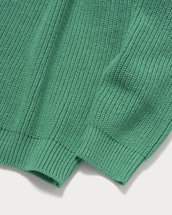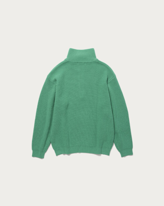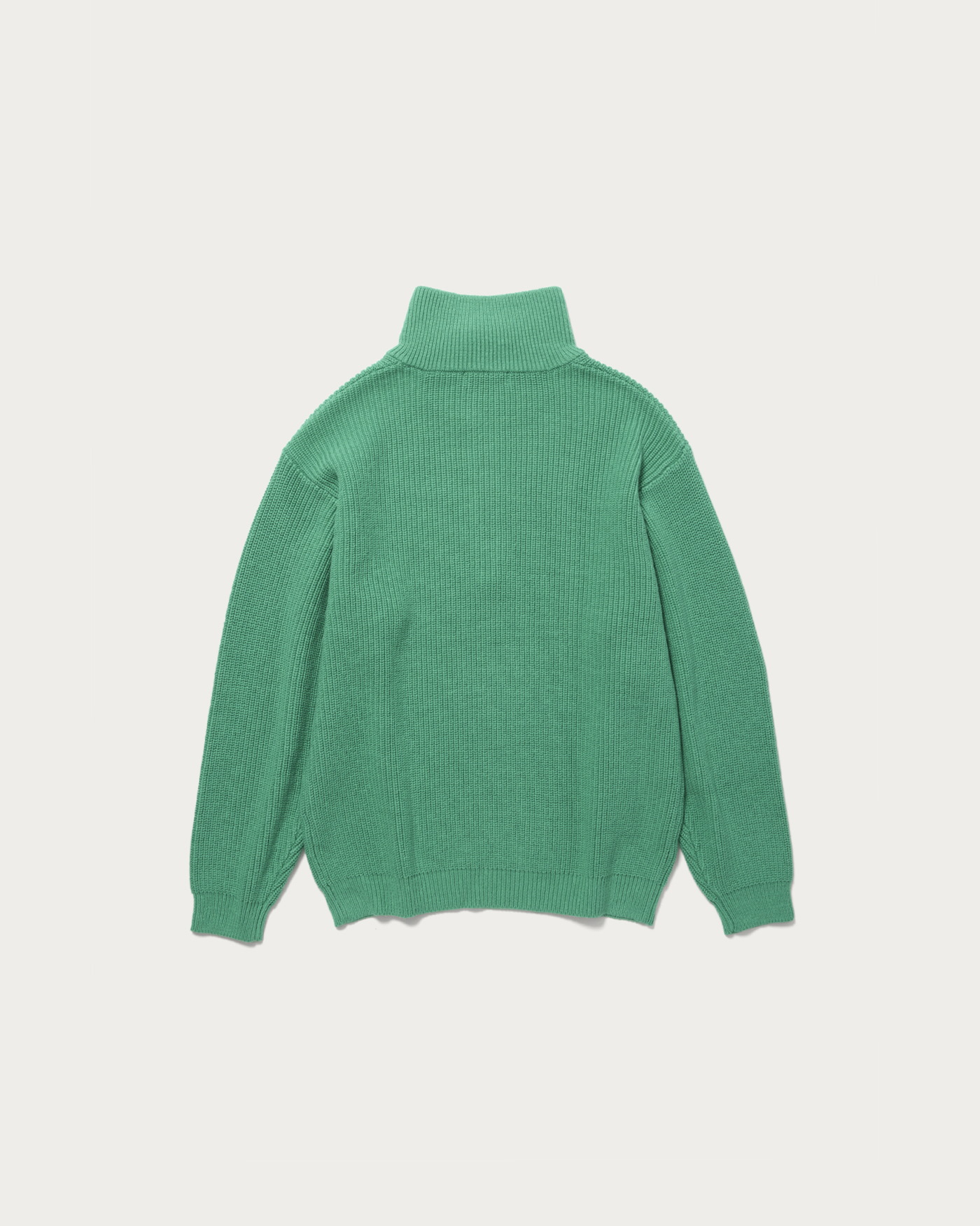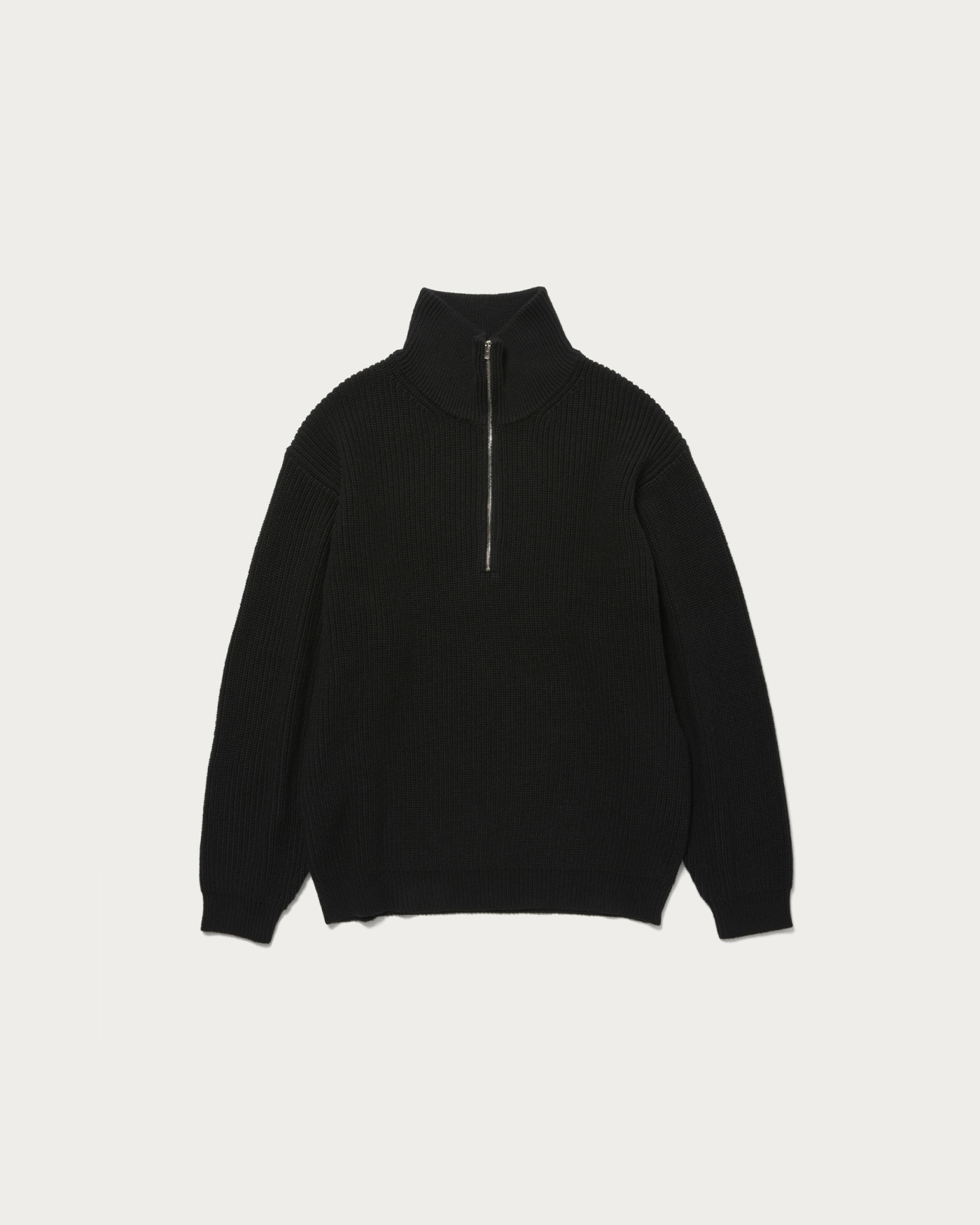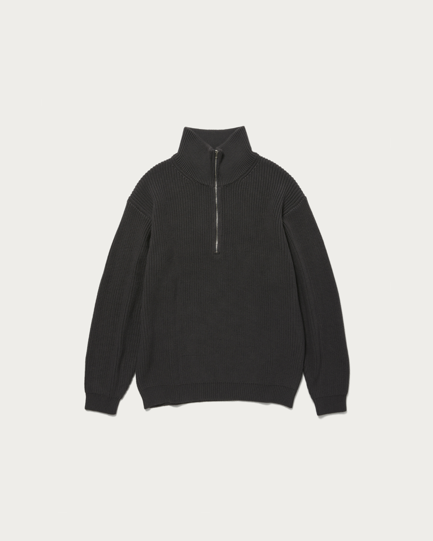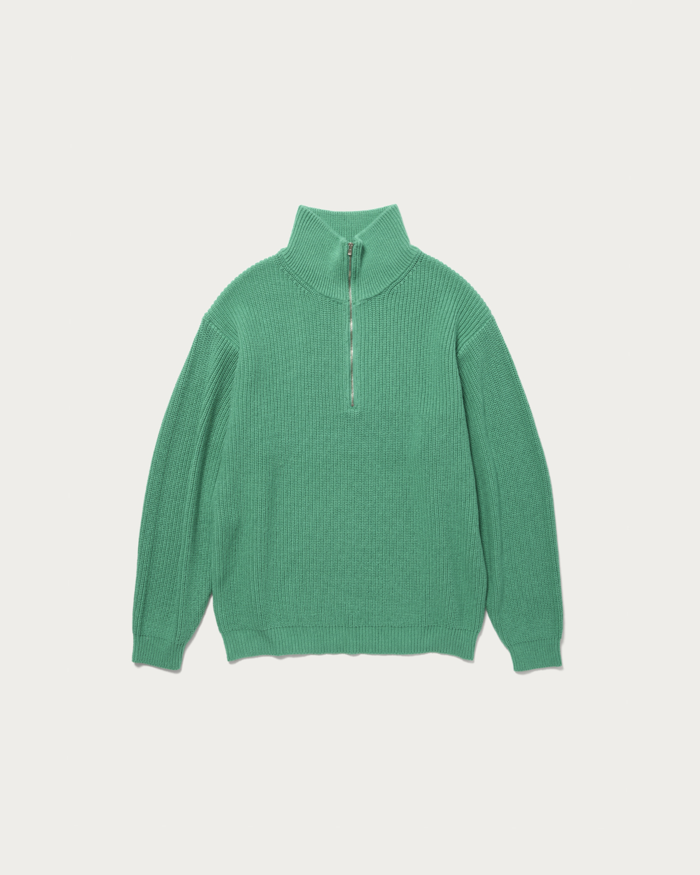 毛羽の少ないコットン/アクリルの糸で畦組織に編んだハーフジップニット。モンキータイムでは定番のアイテムで、ブラック、ダークグレーのベーシックカラーと今シーズンらしいケリーが登場しました。