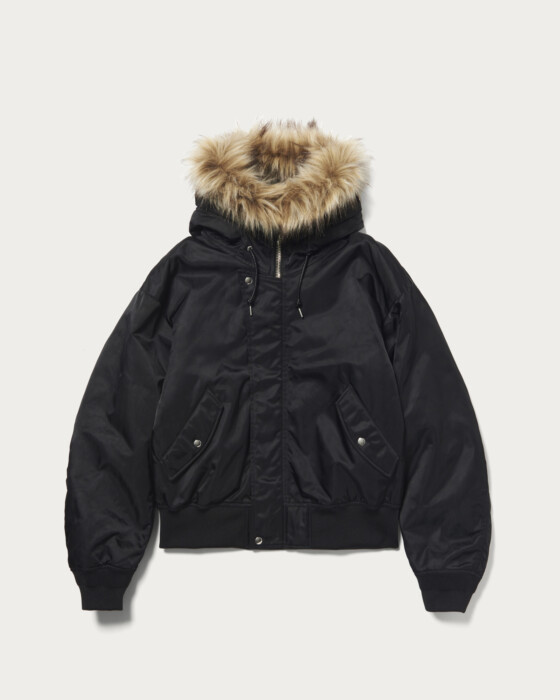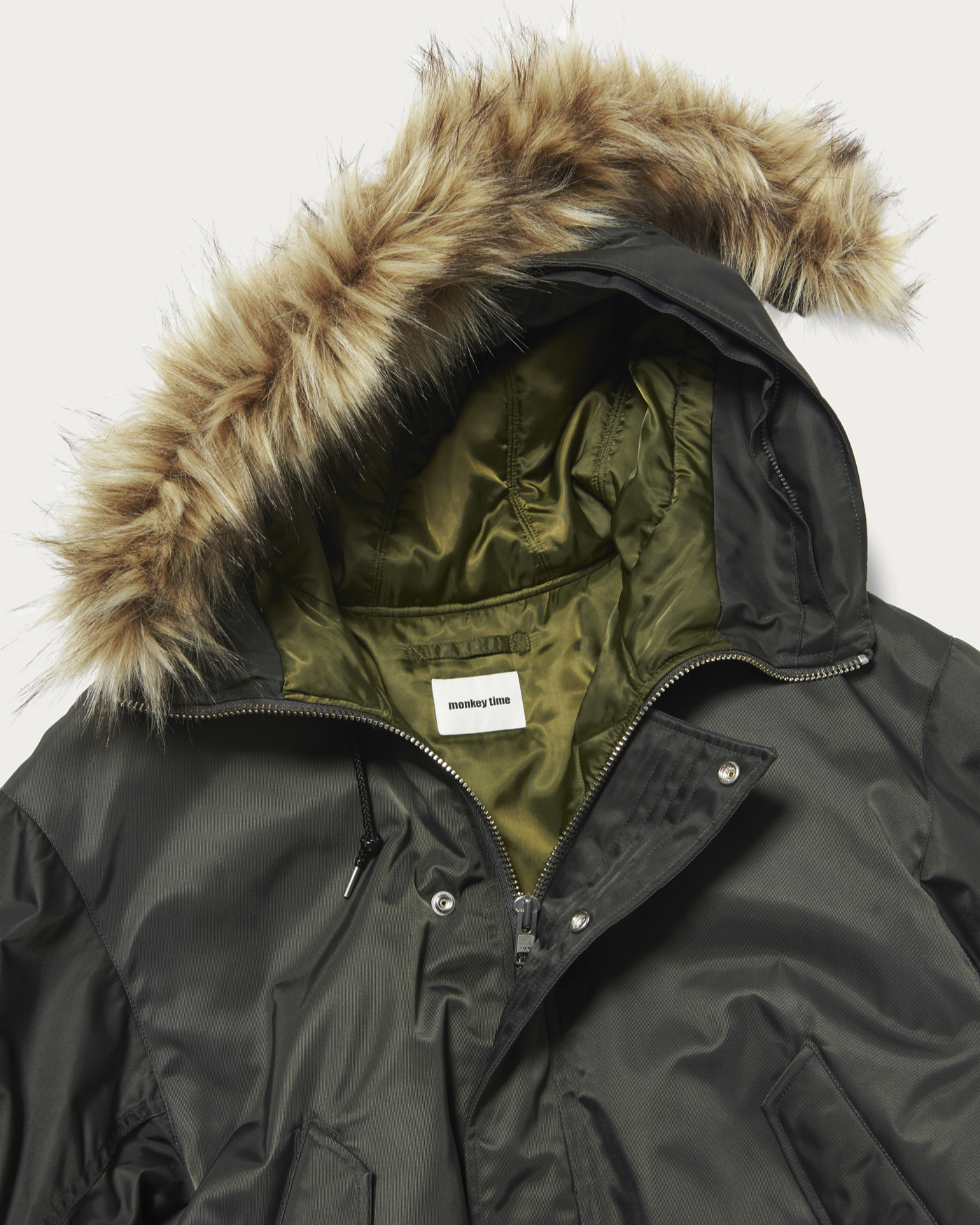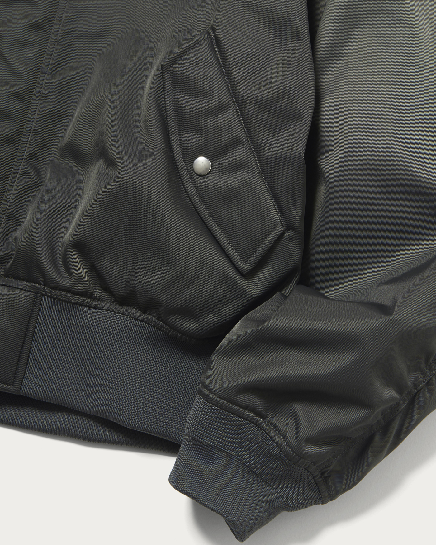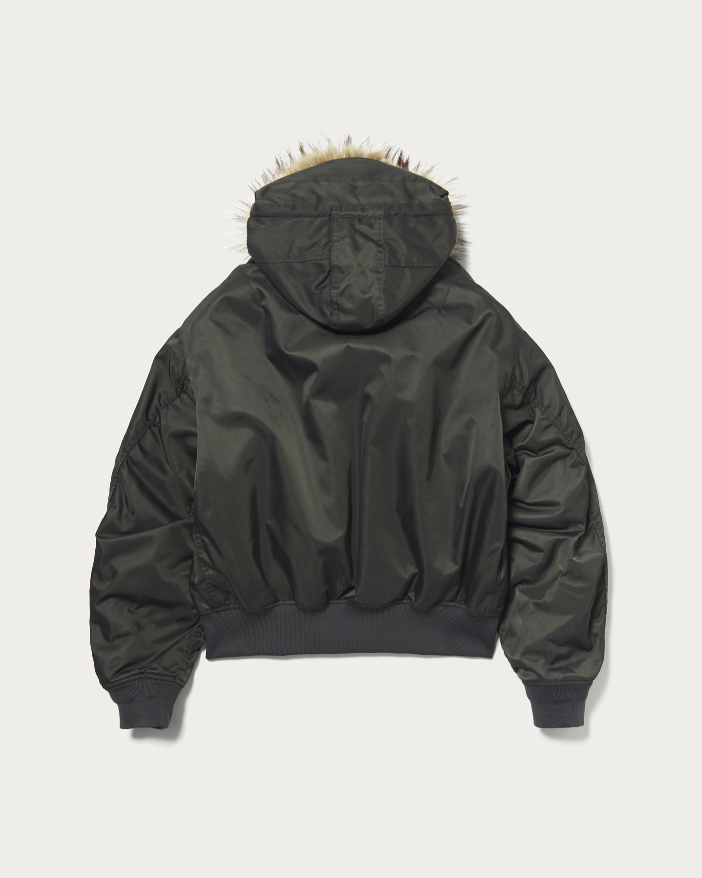 いわゆるMA-1等に採用される素材よりも綾目の立ったナイロンツイルを使用した中綿N-2B型のジャケット。中綿はボリュームを抑え、素材が持つ高級感のあるハリをいかした仕様で製作しました。ミリタリー由来のN-2Bをタウンユース向けにミニマルにする事で着用しやすいアイテムに昇華しています。フードのファーは取り外して着用する事も可能です。