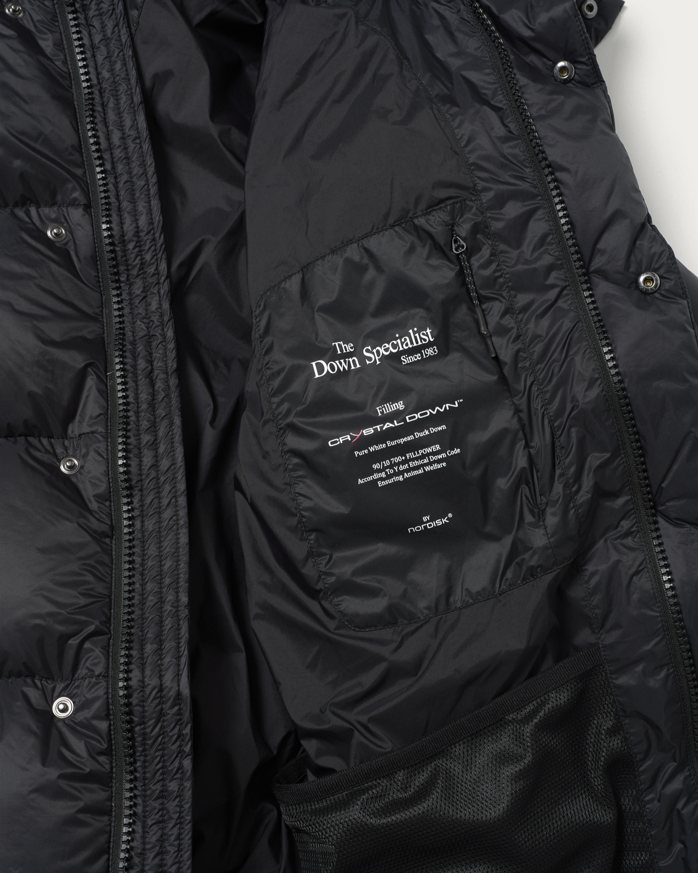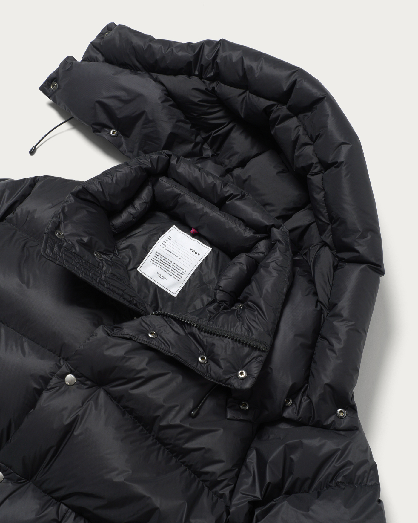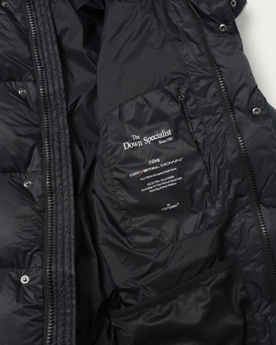 1983年に誕生し、現在はデンマークを本拠地としながら日本でクリエイションを行うアウトドア・ライフスタイルブランド〈YDOT〉との初のコラボレーションアイテム。ベースとなる型は、1988年に作成された1stモデルのデザインを踏襲し、現代的にアップデートとした定番モデル。超軽量素材を採用し、持ち運び、収納に便利なパッカブル仕様に。その他たっぷりとしたダウン量による高い保温性に加えハンドウォーマー付きのポケット、取り外し可能な立体的なフード、大容量の内ポケットなど充実した機能面も魅力の一着。本別注では今シーズンのインラインでは展開のないブラックを採用し、すっきりと着やすいように着丈をやや短くアレンジ。デザイン、ボタン配置なども着丈に合わせて再調整しました。ダウンは高品質でボリュームのあるヨーロッパ産ダウンを厳選したクリスタルダウン®(Crystal Down)が充填されています。